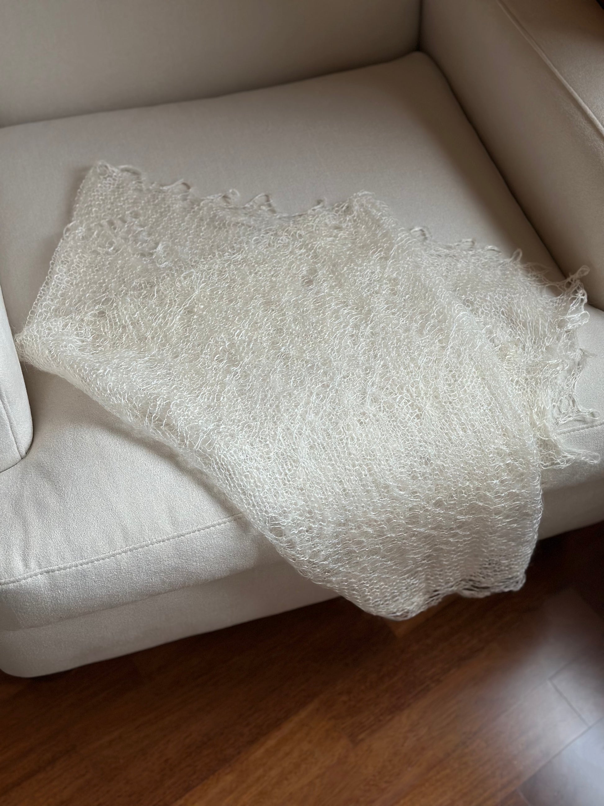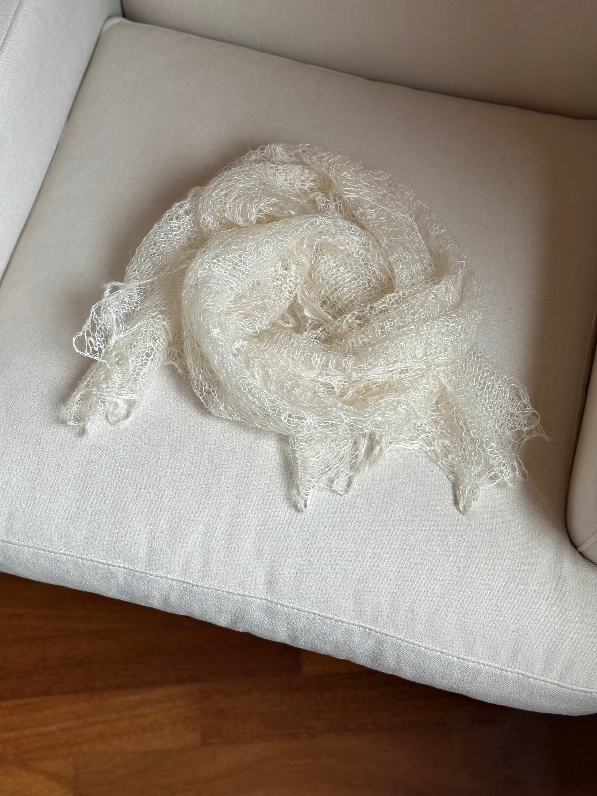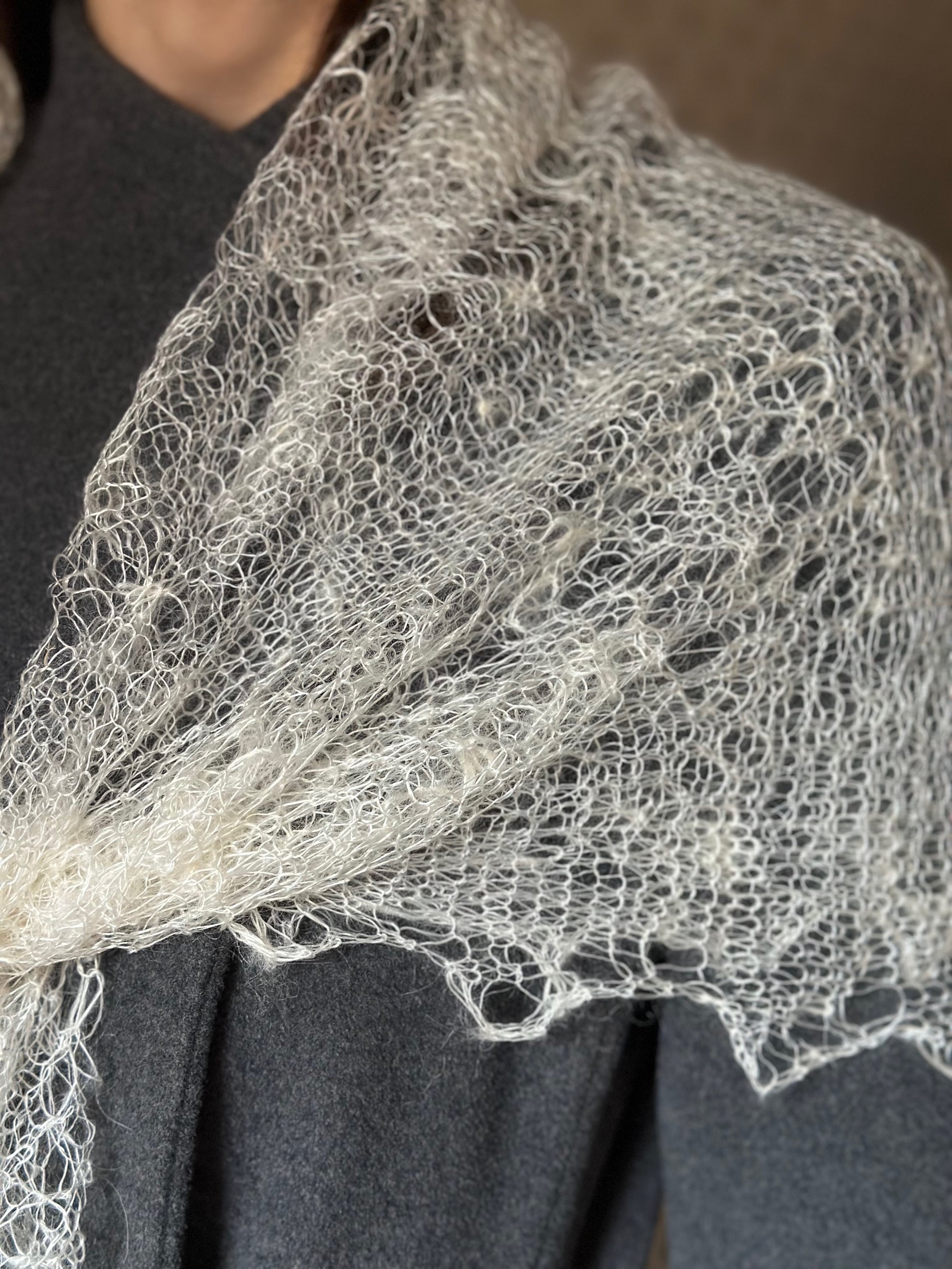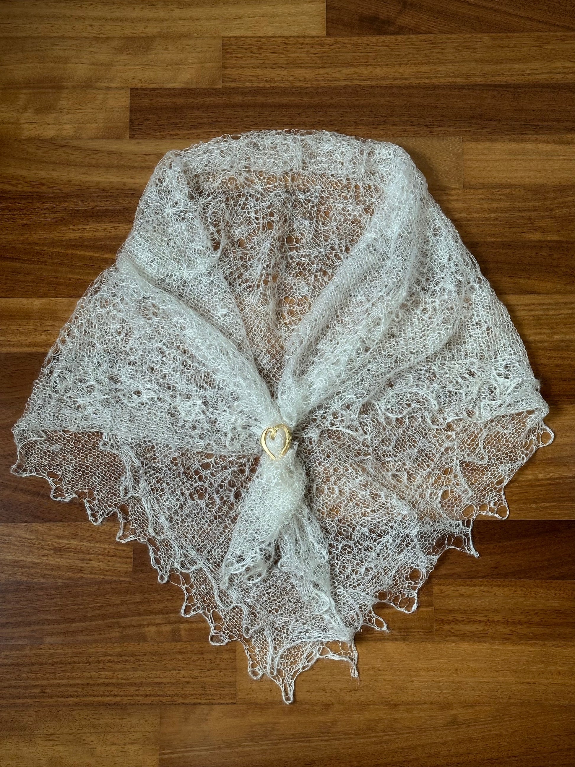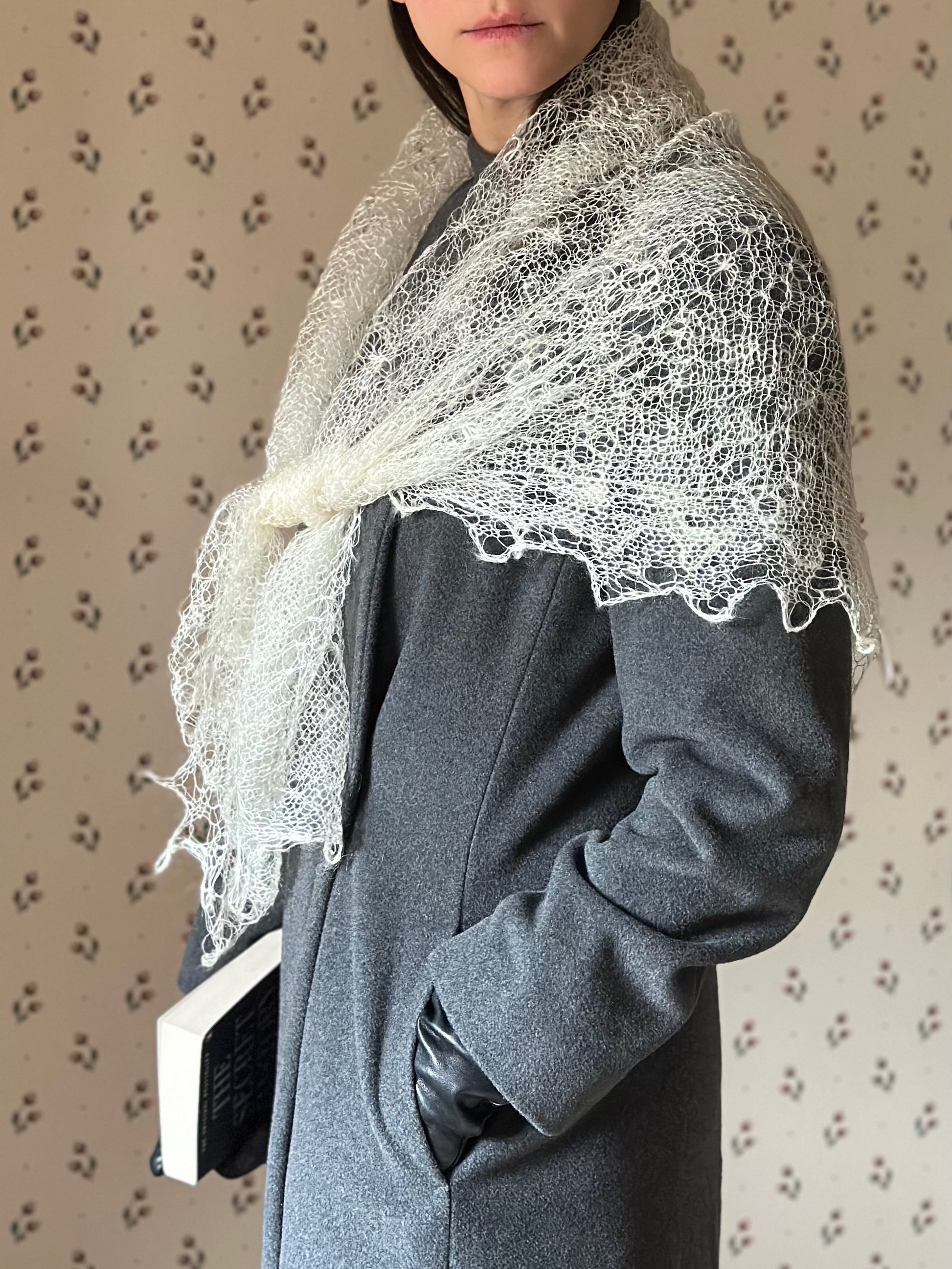 Gorgeous handmade vintage Orenburg shawl crafted from a soft and warm knitted lace resulting in a blend of silk and indigenous goat fiber, similar to cashmere or mohair. The shawl can be worn on your shoulder or on your head to shield your from wind, cold and rain or around your neck, tied with your favorite brooch to add an extra touch of uniqueness and beauty.