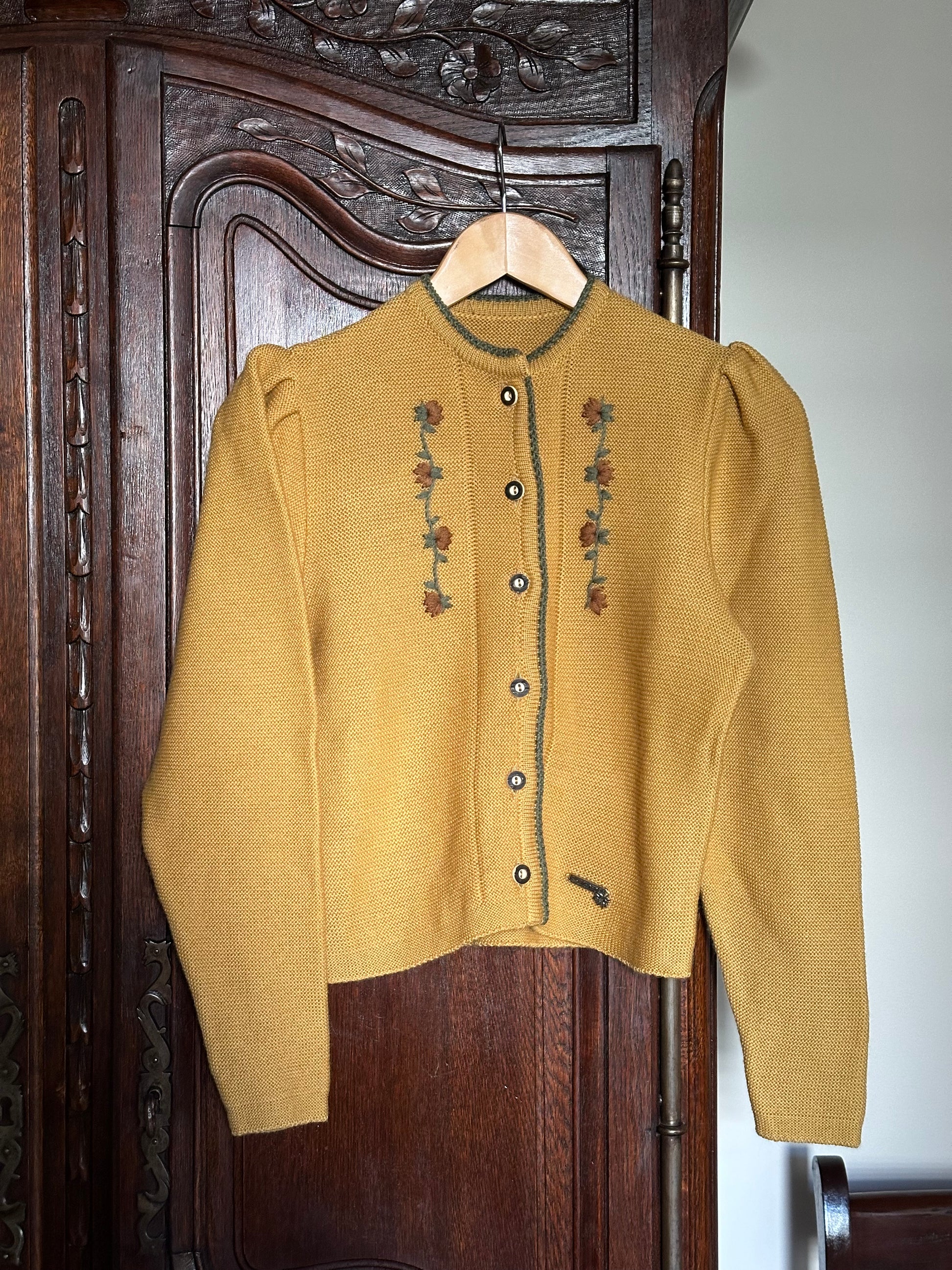 Romantic vintage Austrian cardigan in a lovely mustard yellow color featuring front button fastening with faux horn buttons, long puffed sleeves, round collar and a slightly cropped fit. The cardigan is decorated with a sage green hem on the front and neckline and a beautiful floral embroidery on the chest.