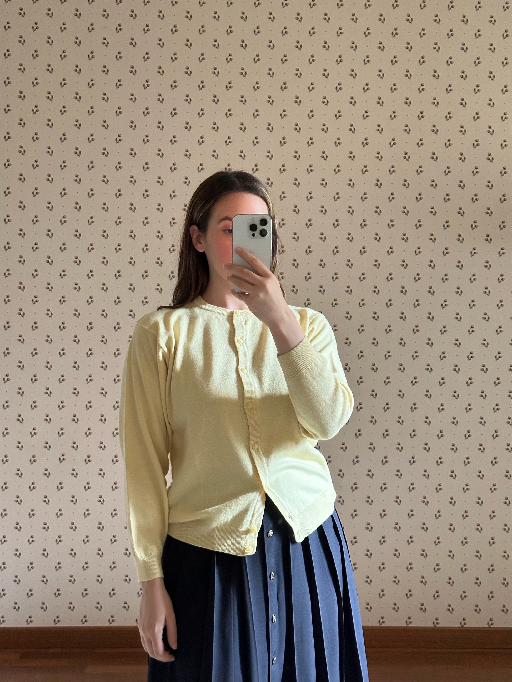 Classic and sophisticated vintage butter yellow cardigan featuring long sleeves, round neckline and ribbed hem and cuffs. The cardigan also presents lovely ton sur ton buttons on the front and a structured yet comfy fit.