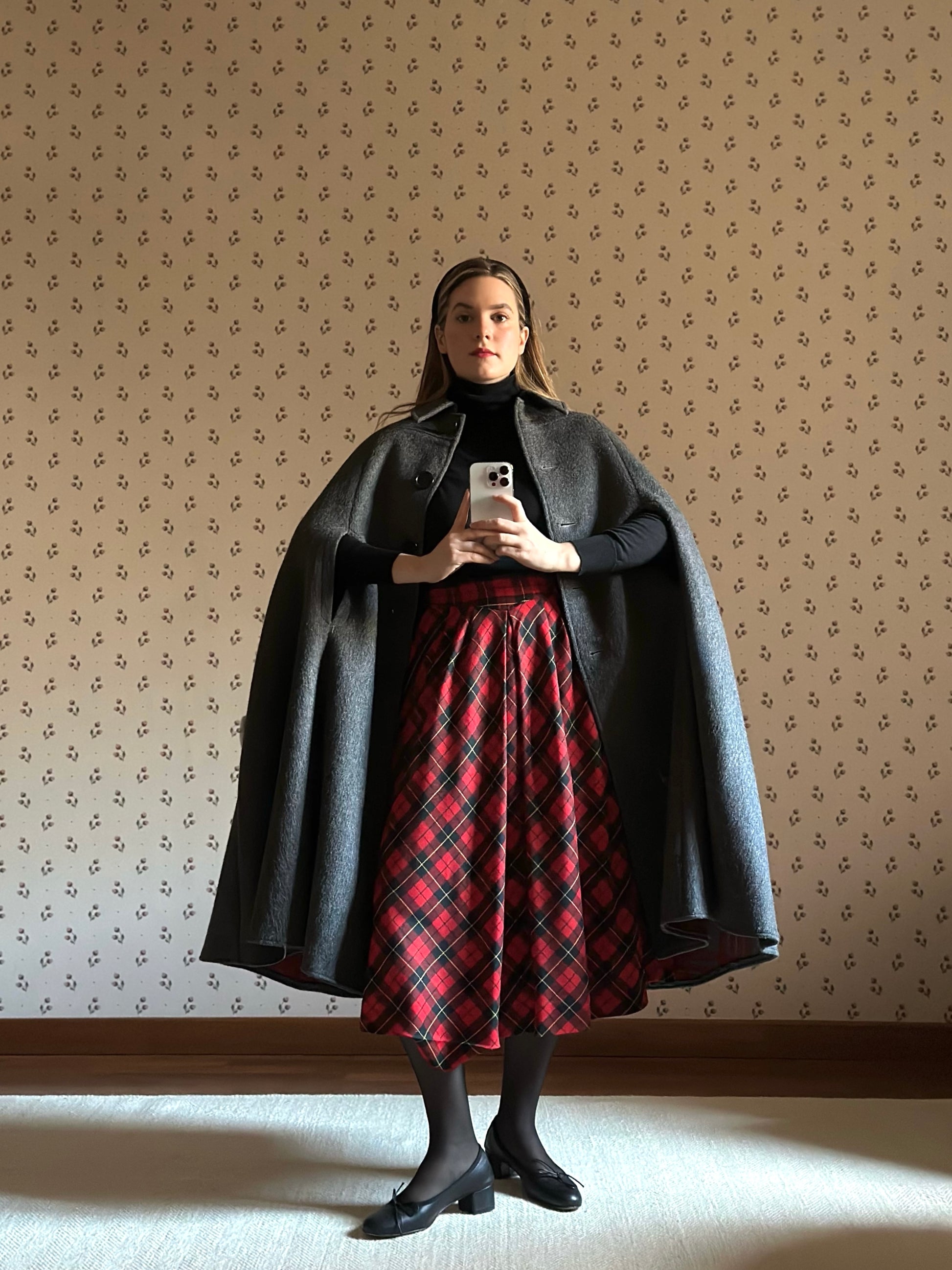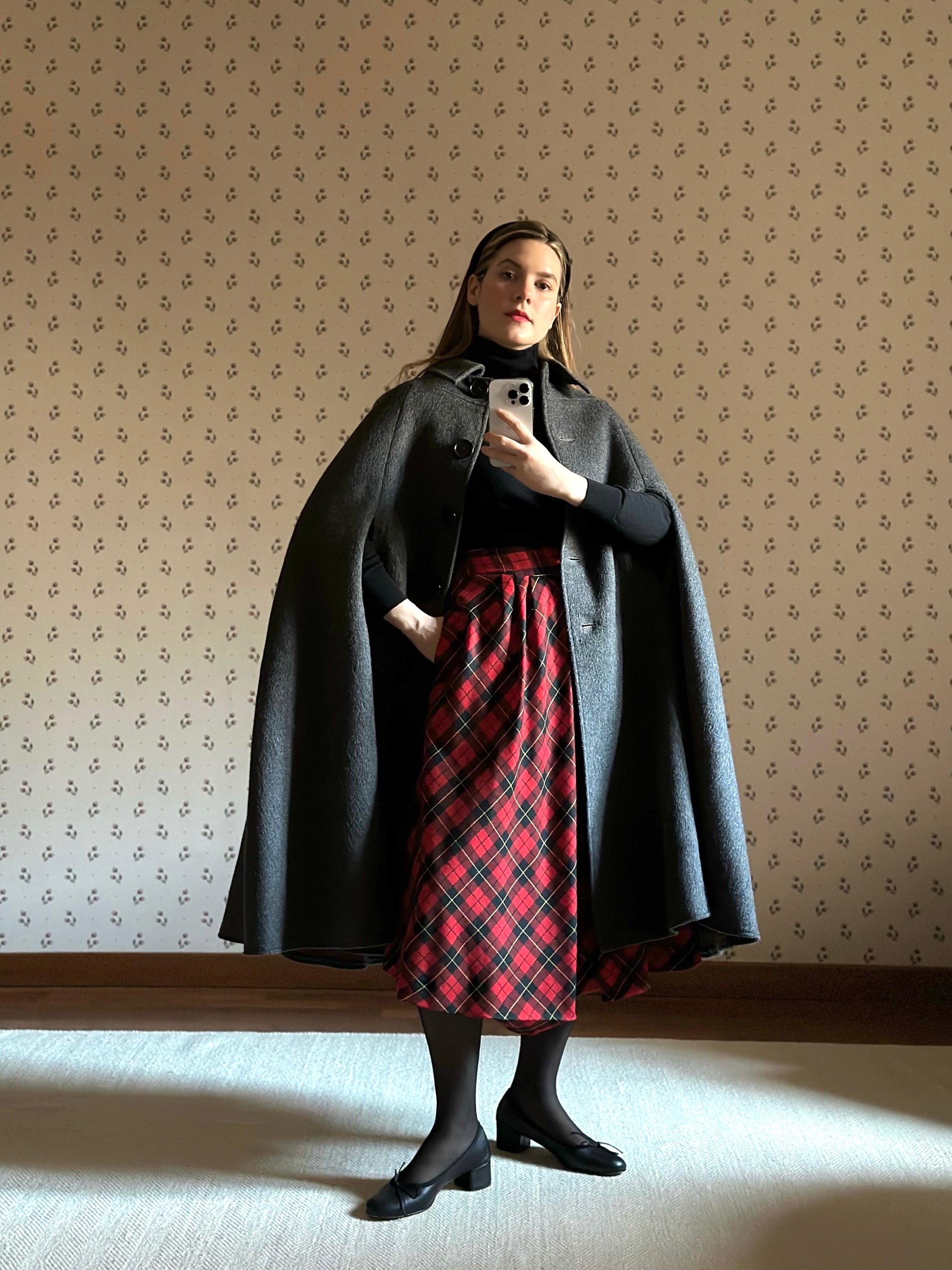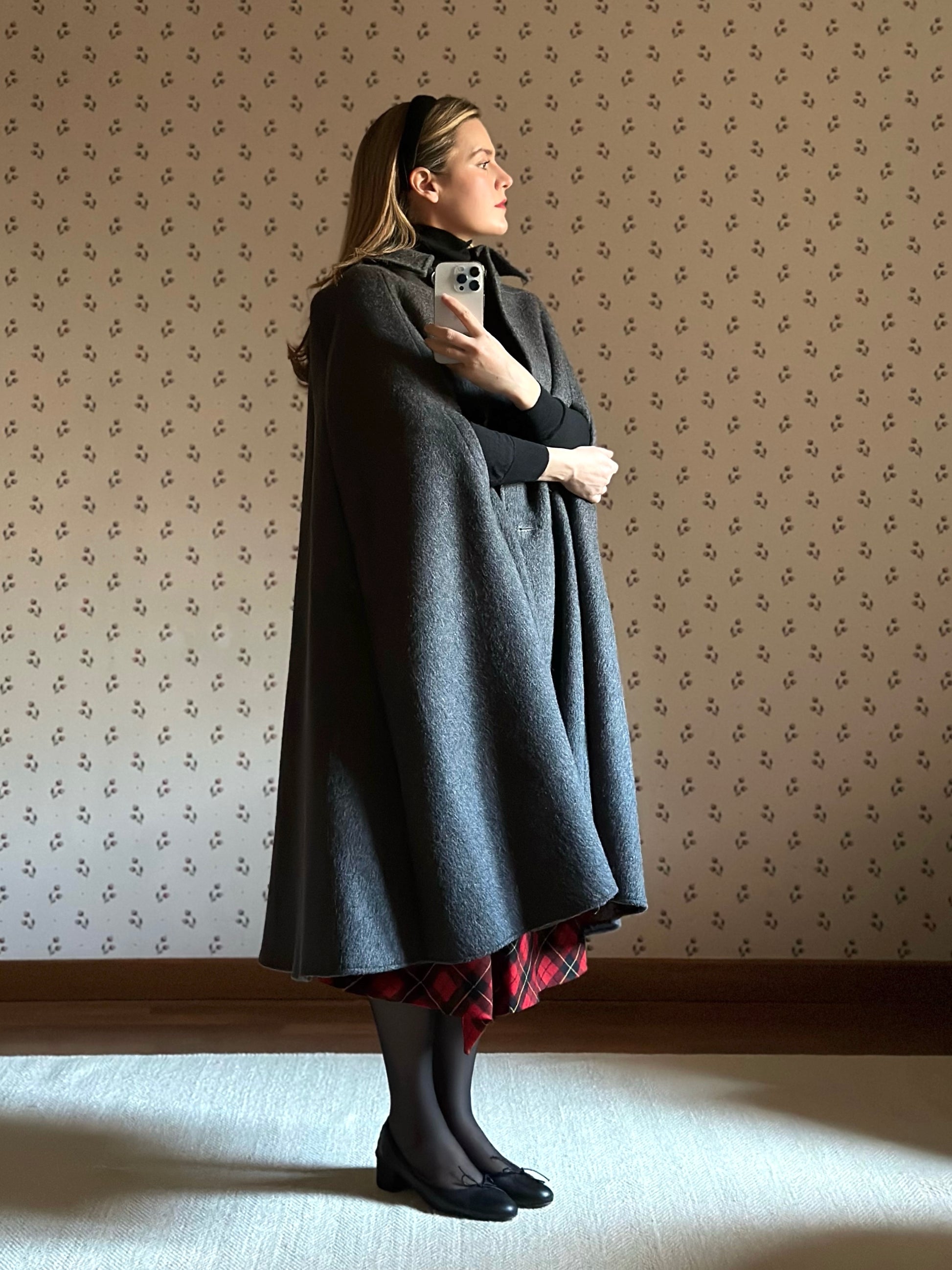 Gray Cape Coat With Red Tartan Lining
