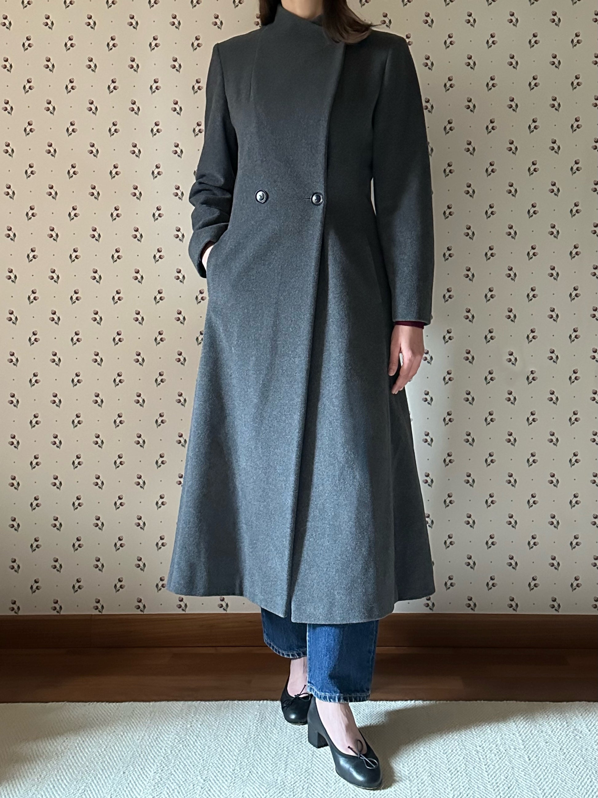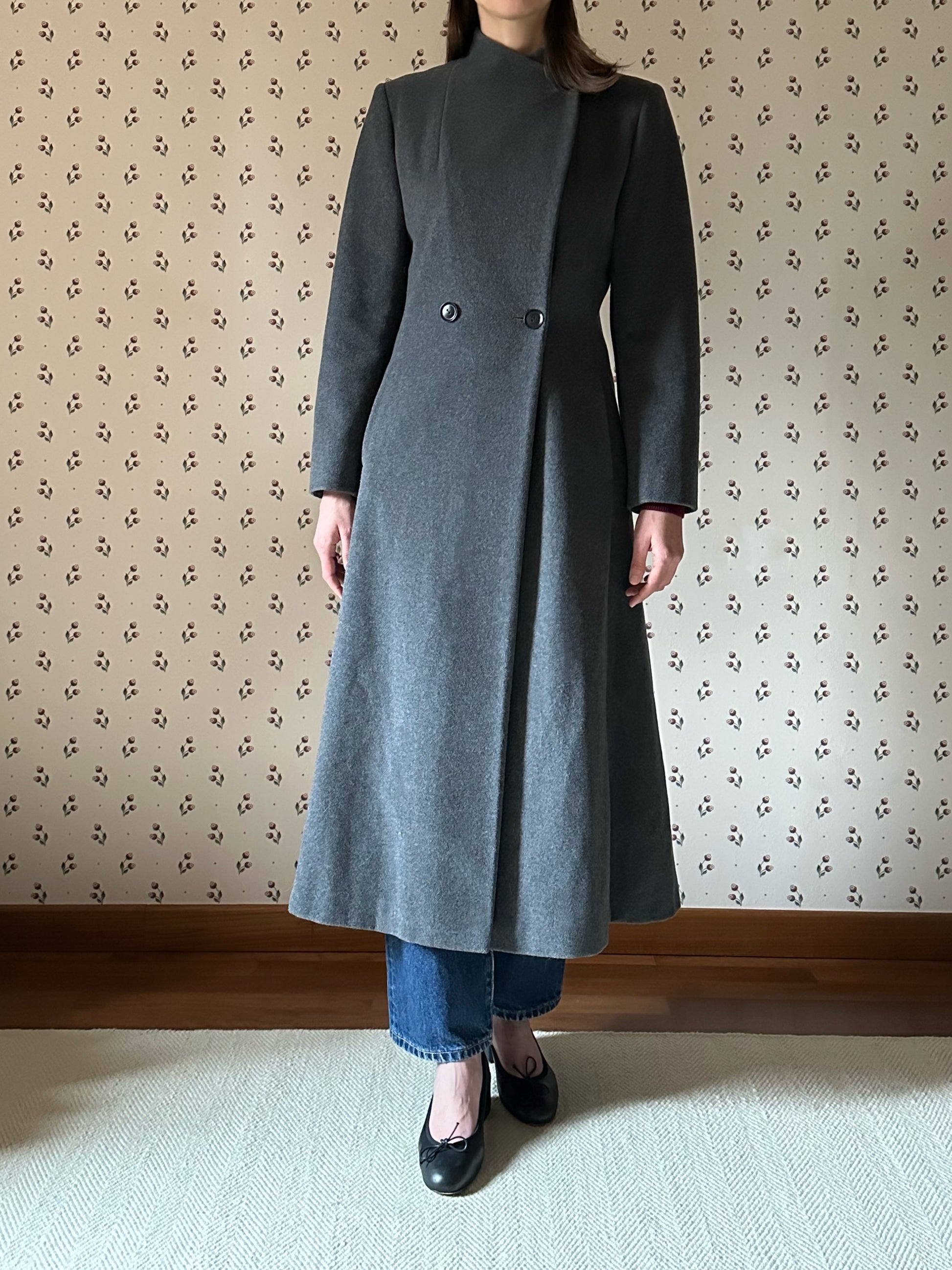 Classic and refined long gray coat featuring a unique round collar with single button on the neckline, two buttons on the waistline to accentuate the silhouette, long sleeves and a stunning structured and contemporary fit. The coat is fully lined for extra warmth and a comfortable wear.