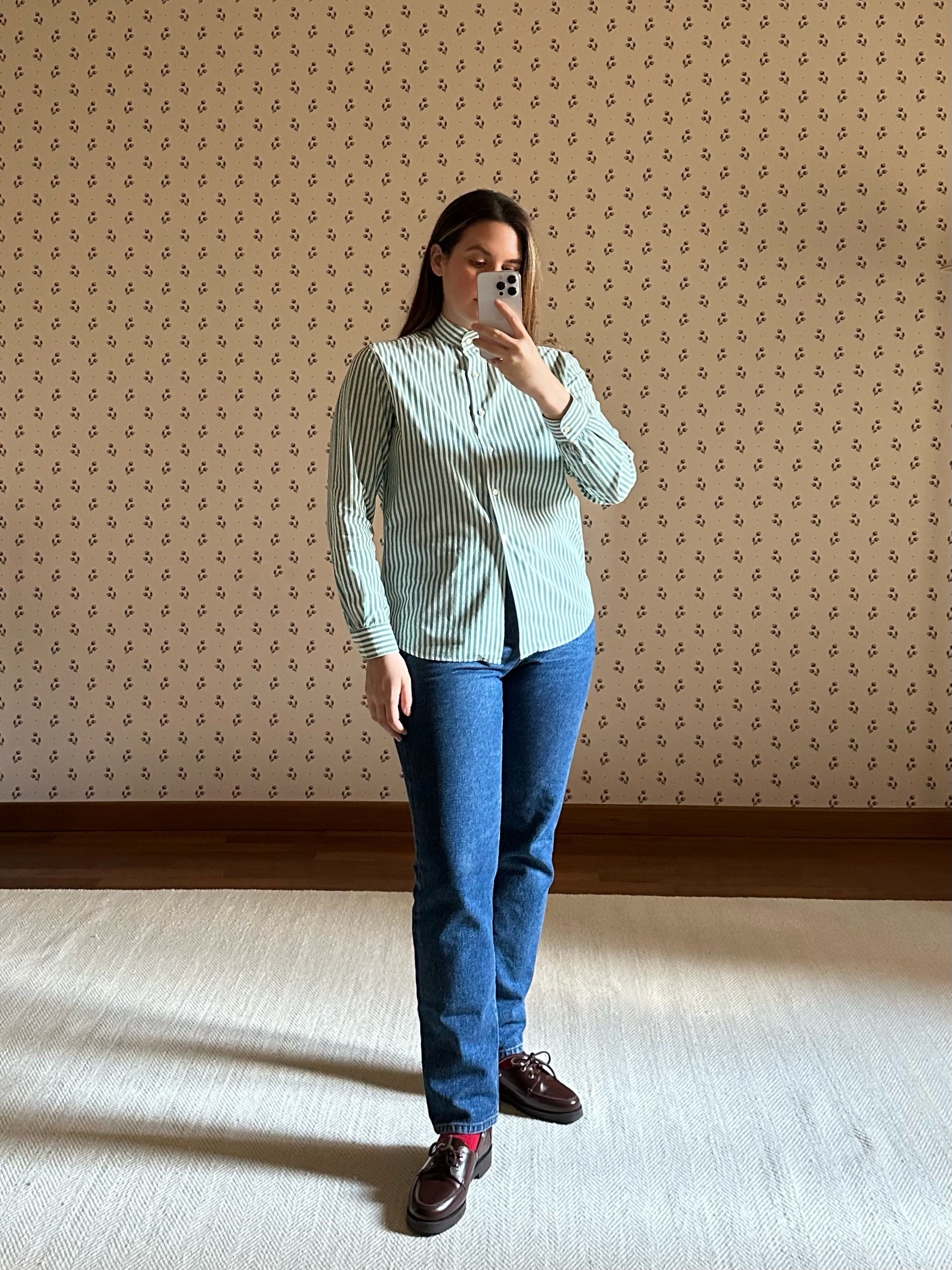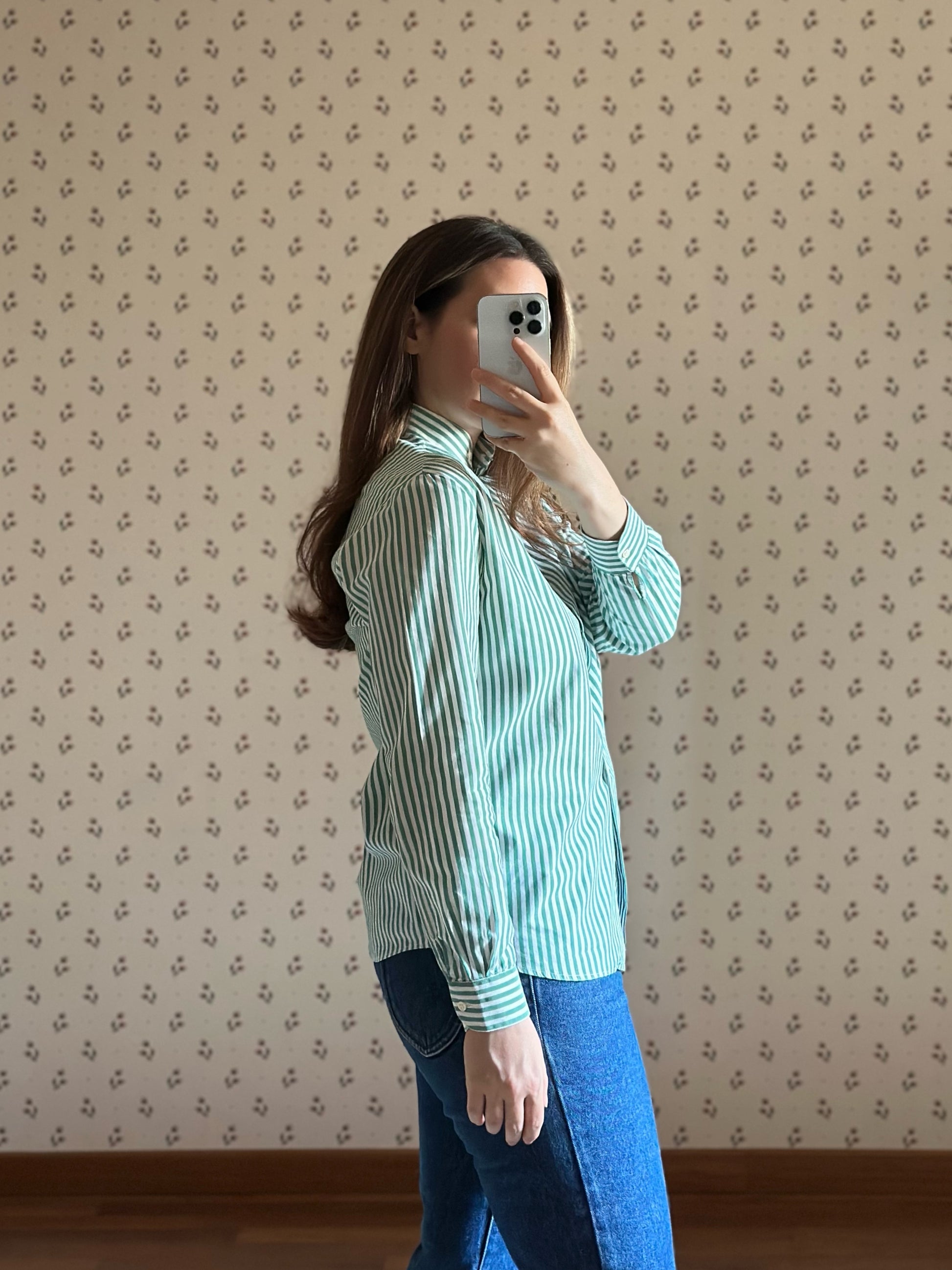 Lovely and classy vintage striped shirt in a delicate white & forest green shade featuring standing collar, front button fastening, long sleeves and a beautifully relaxed fit.