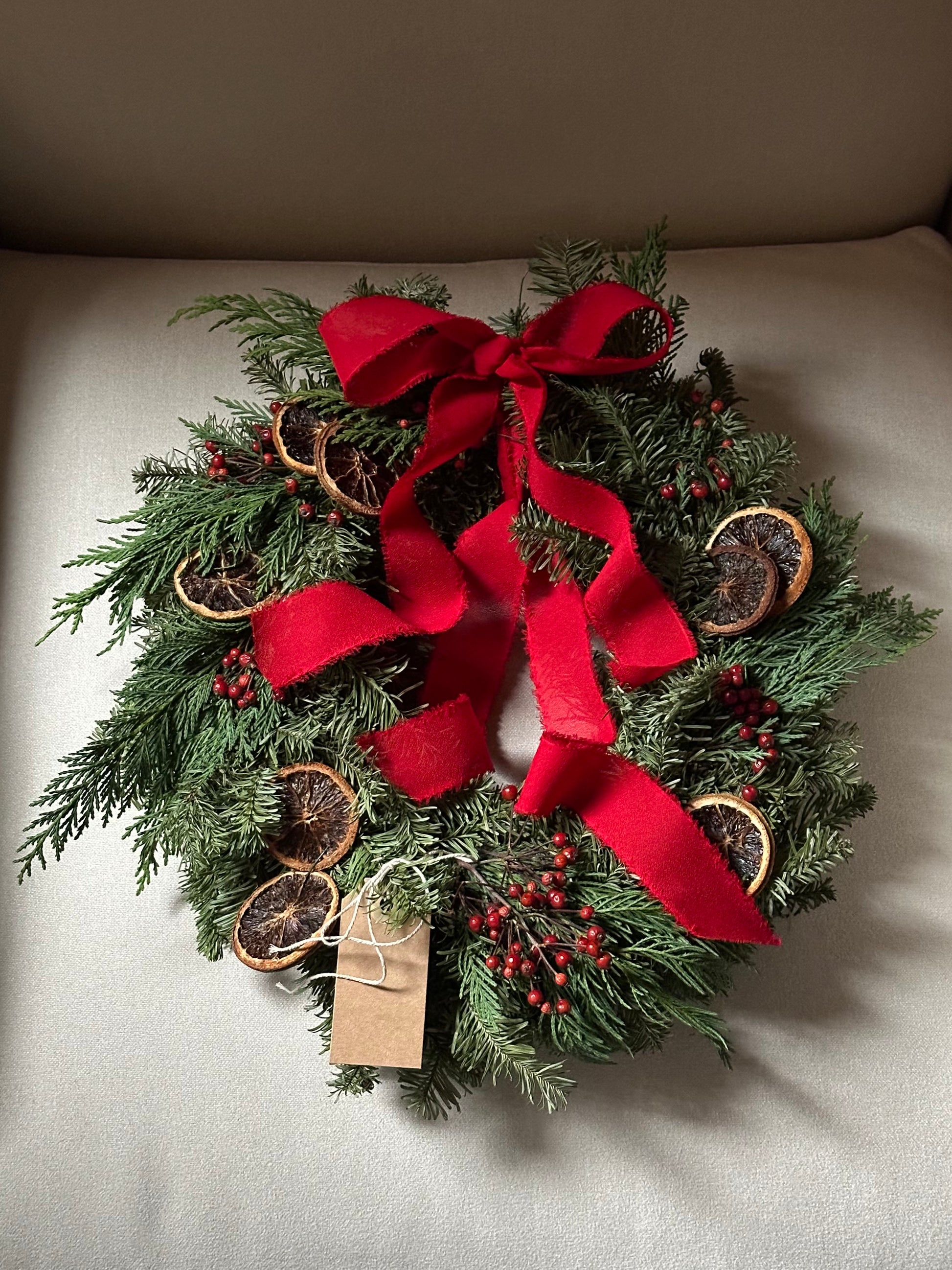 Delicately handcrafted, this botanical garland weaves together fir, cypress, rose hips and dried oranges in a romantic, vintage-looking harmony. Built upon a natural straw structure, it is designed to endure—its colors and shape beautifully preserved over time. Whether draped along a wall or laid gently as a centerpiece, it brings a quiet elegance to any space, like a still life suspended in time.