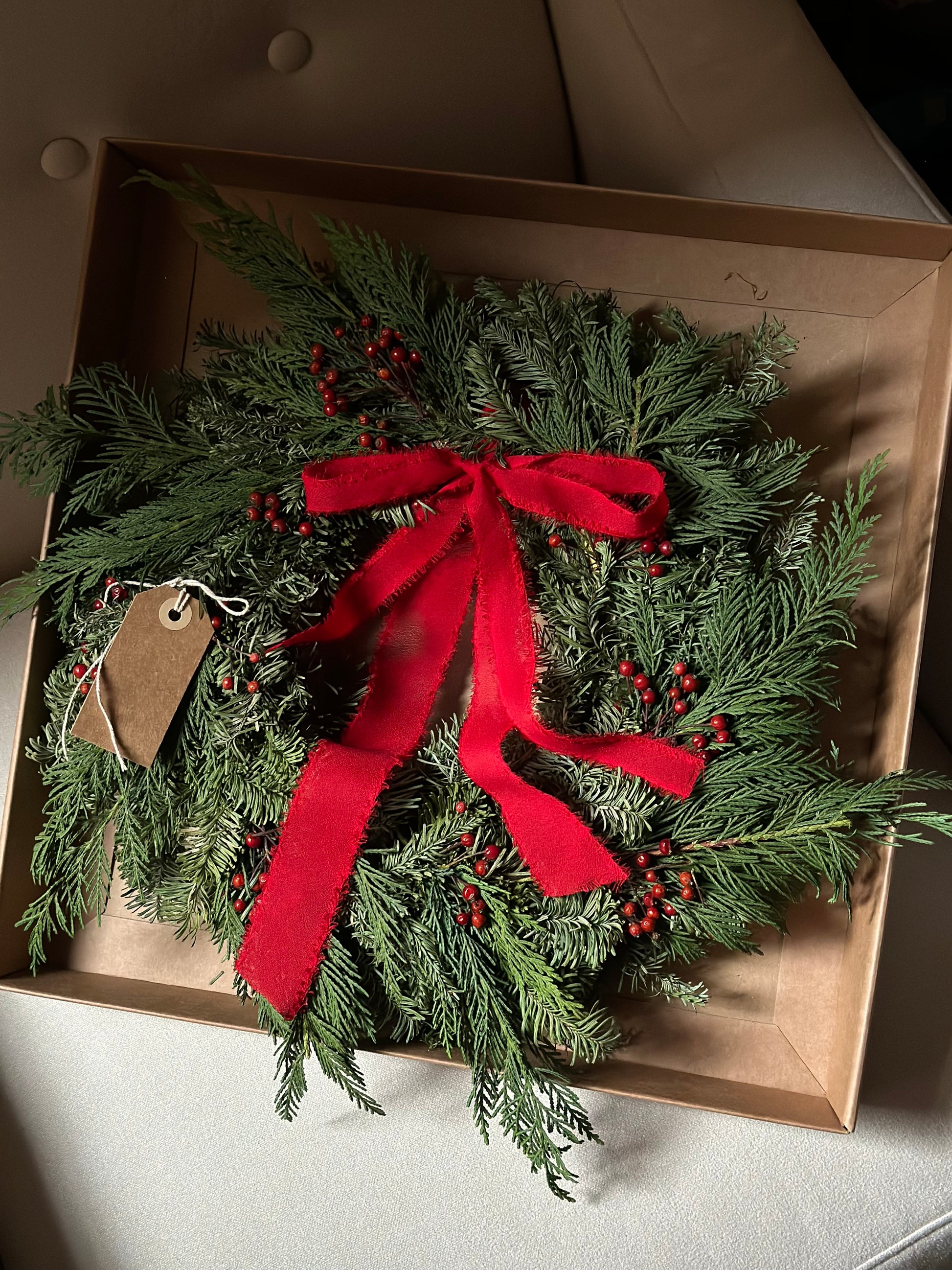Delicately handcrafted, this botanical garland weaves together fir, cypress and rose hips in a soft, vintage-looking harmony. Built upon a natural straw structure, it is designed to endure—its colors and shape beautifully preserved over time. Whether draped along a wall or laid gently as a centerpiece, it brings a quiet elegance to any space, like a still life suspended in time.