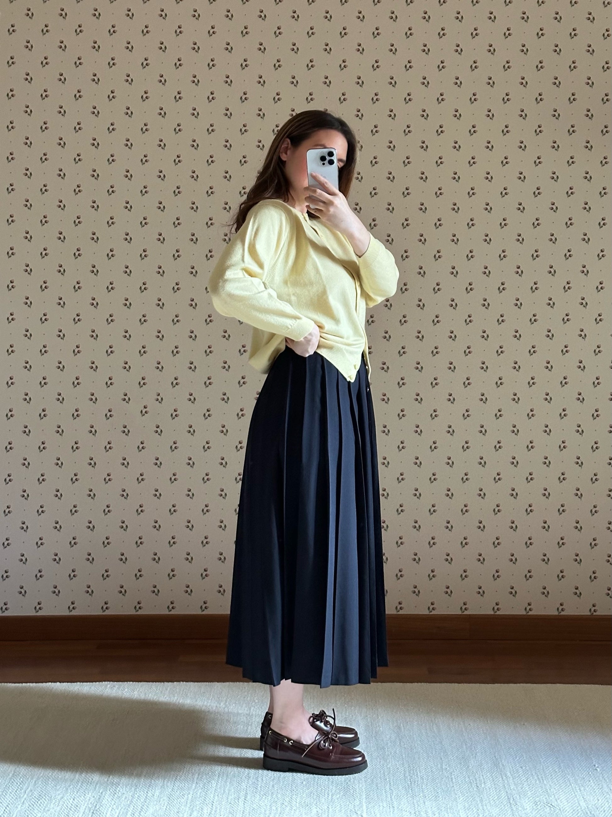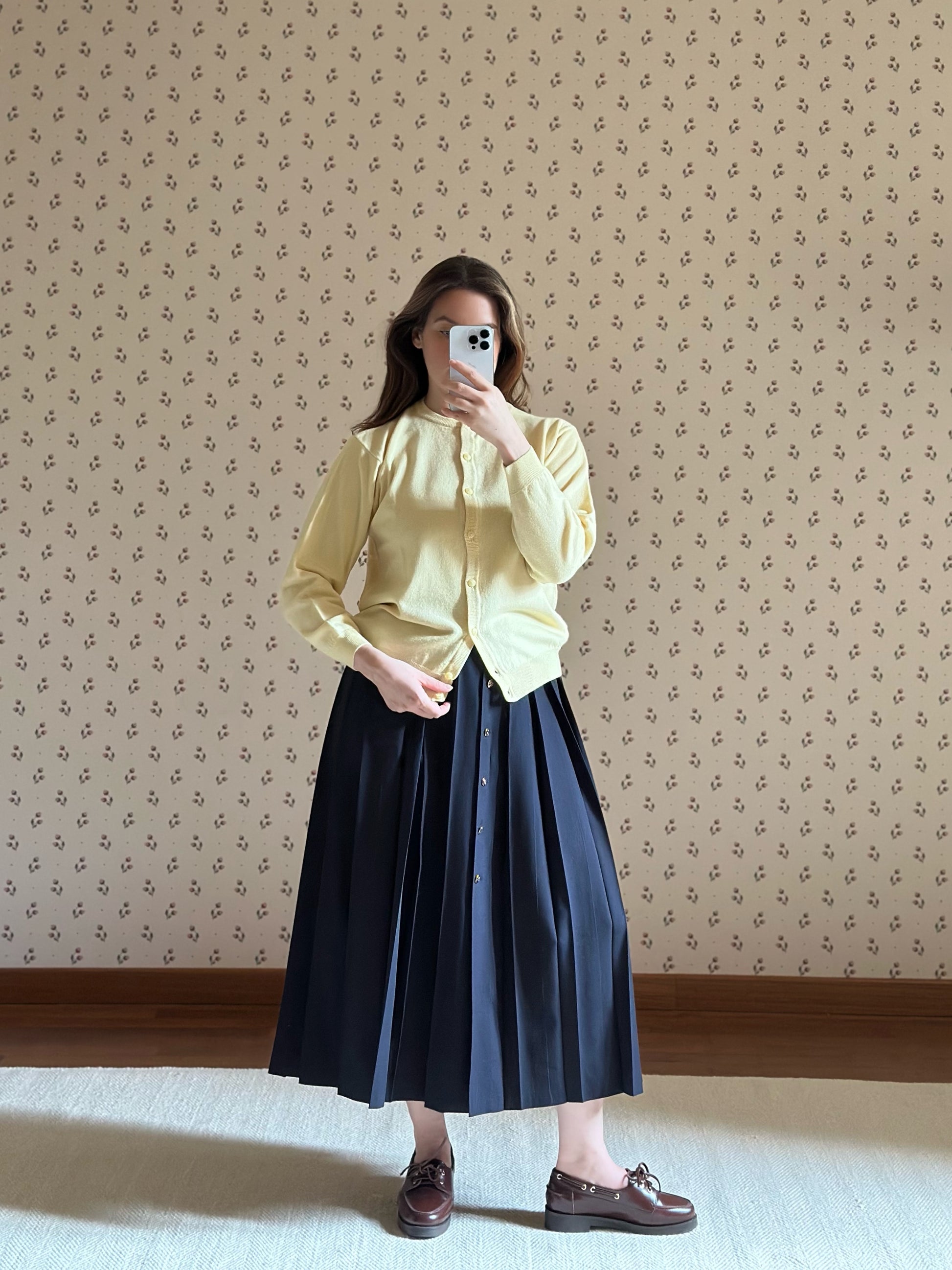 Beautiful and romantic blue pleated skirt fashioned from a lightweight pure wool and featuring a practical front button fastening with lovely golden buttons.