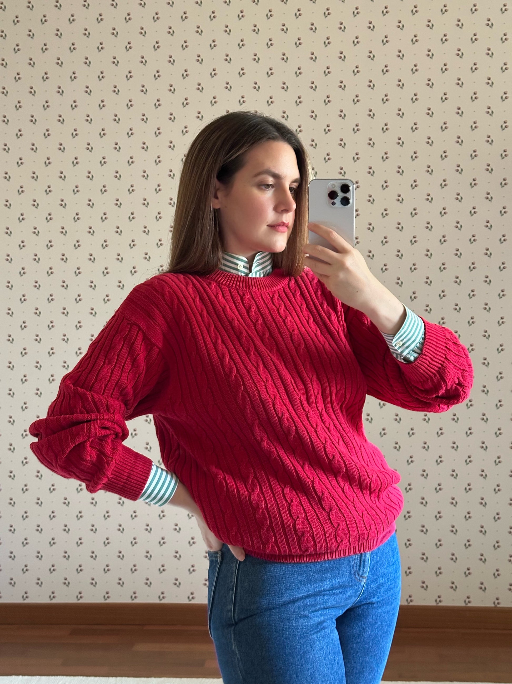 Classic and versatile vintage cable knit red sweater featuring round neck, long sleeves and a relaxed, slightly oversized fit. Breathable and lightweight, perfect for mid-seasons outfits like jeans and a striped shirt.