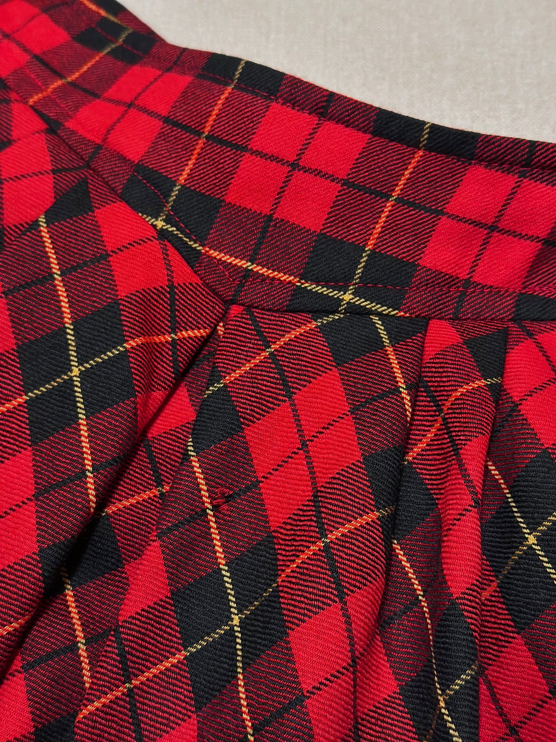 Stunning and one-of-a-kind vintage circular skirt with slightly asymmetric hemline crafted from a soft and warm wool fabric featuring a classic Wallace tartan pattern (red, black and yellow) and lovely pleats that provide a beautiful movement to the skirt. Fully lined for a comfortable and easy wear. Please note that the skirt is in perfect vintage conditions except for a tiny tear on the front (see last pictures), hardly visible once worn. Made in Italy.
