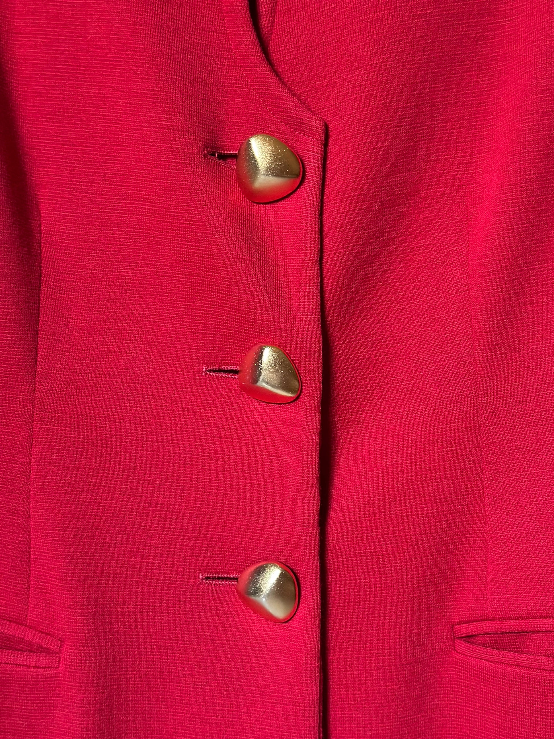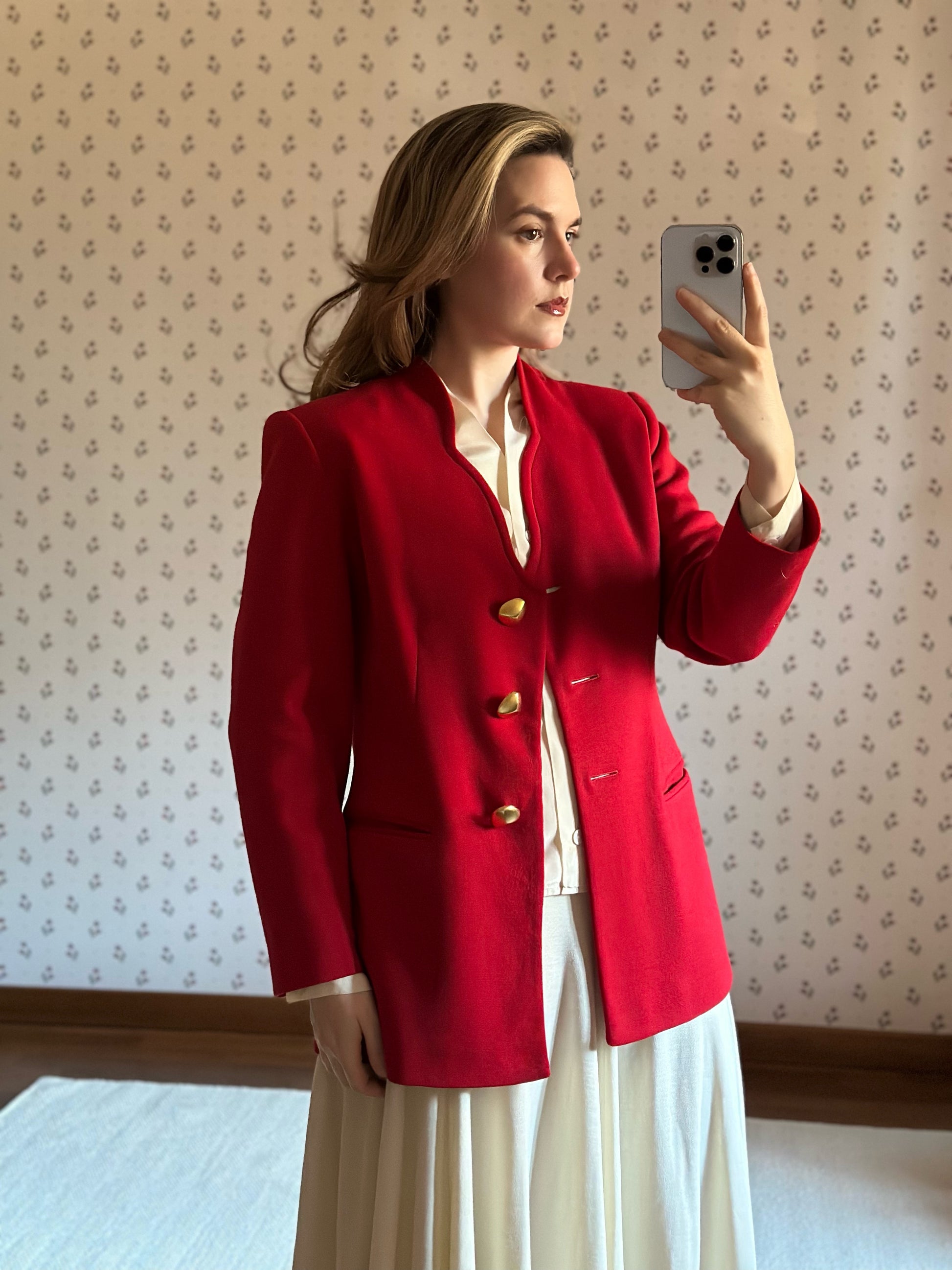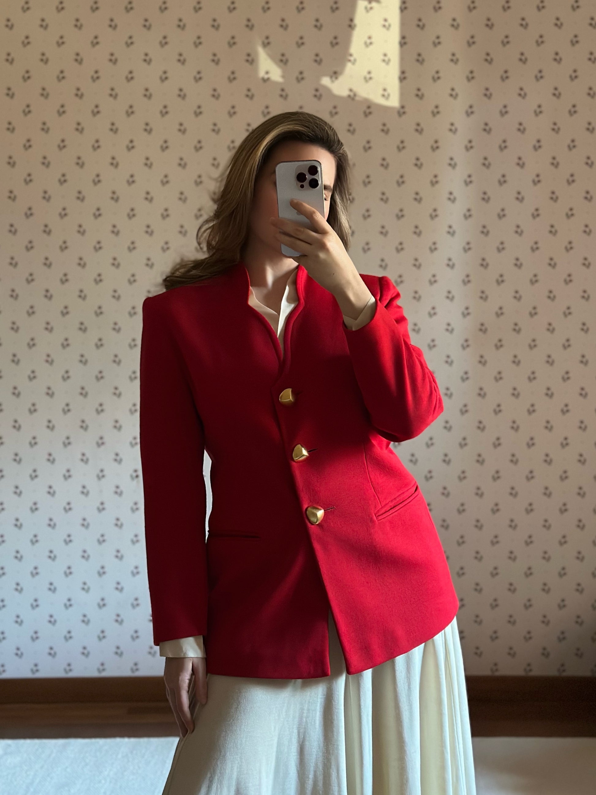 Sophisticated and luxurious scarlet red vintage blazer crafted from a soft poor wool cloth, lightweight yet warm. The blazer features long sleeves, a beautiful lapel collar with scalloped neckline, front fastening with gorgeous golden buttons and fully lined for a comfortable and easy wear. With slightly padded shoulders that donate structure to the fit. Please note that the blazer in in great vintage conditions except for two small mark on the left shoulder, as shown in the last two pictures.