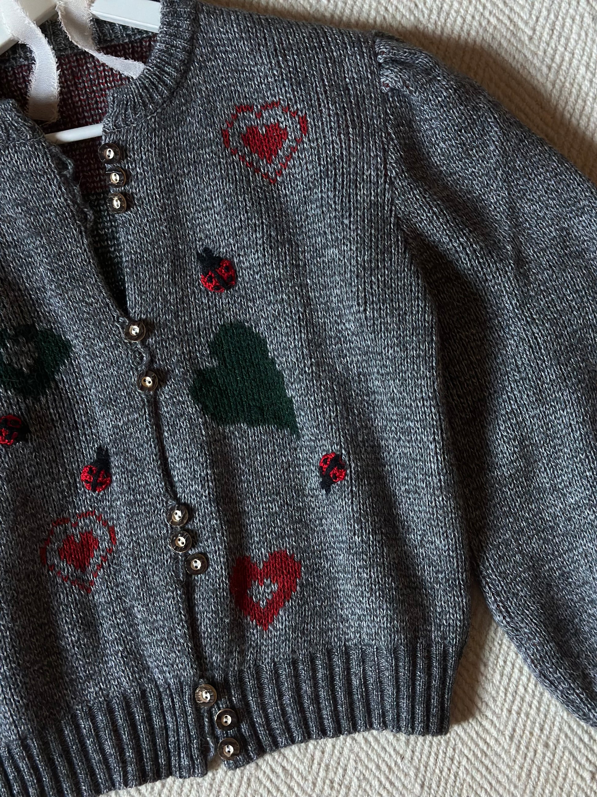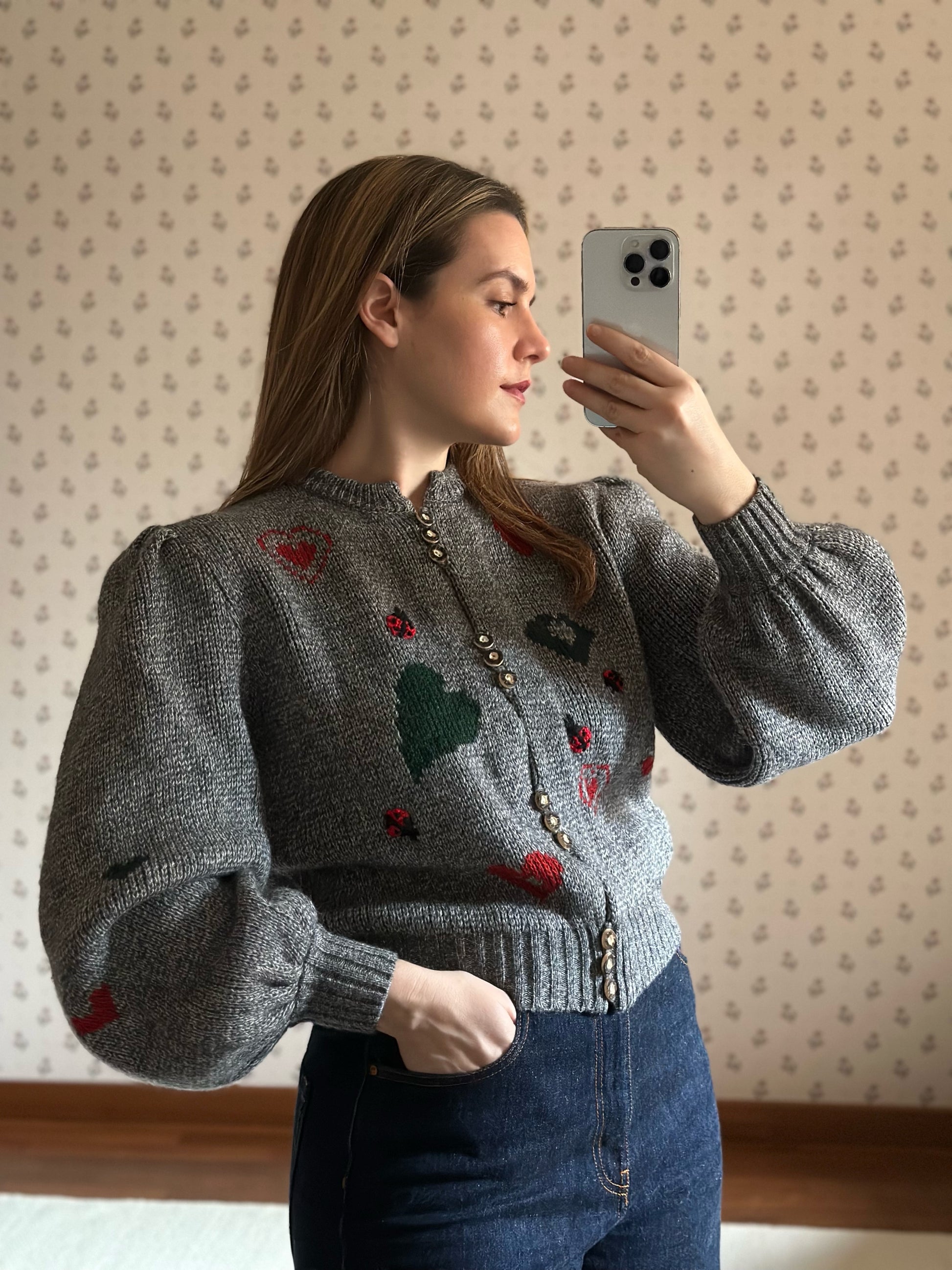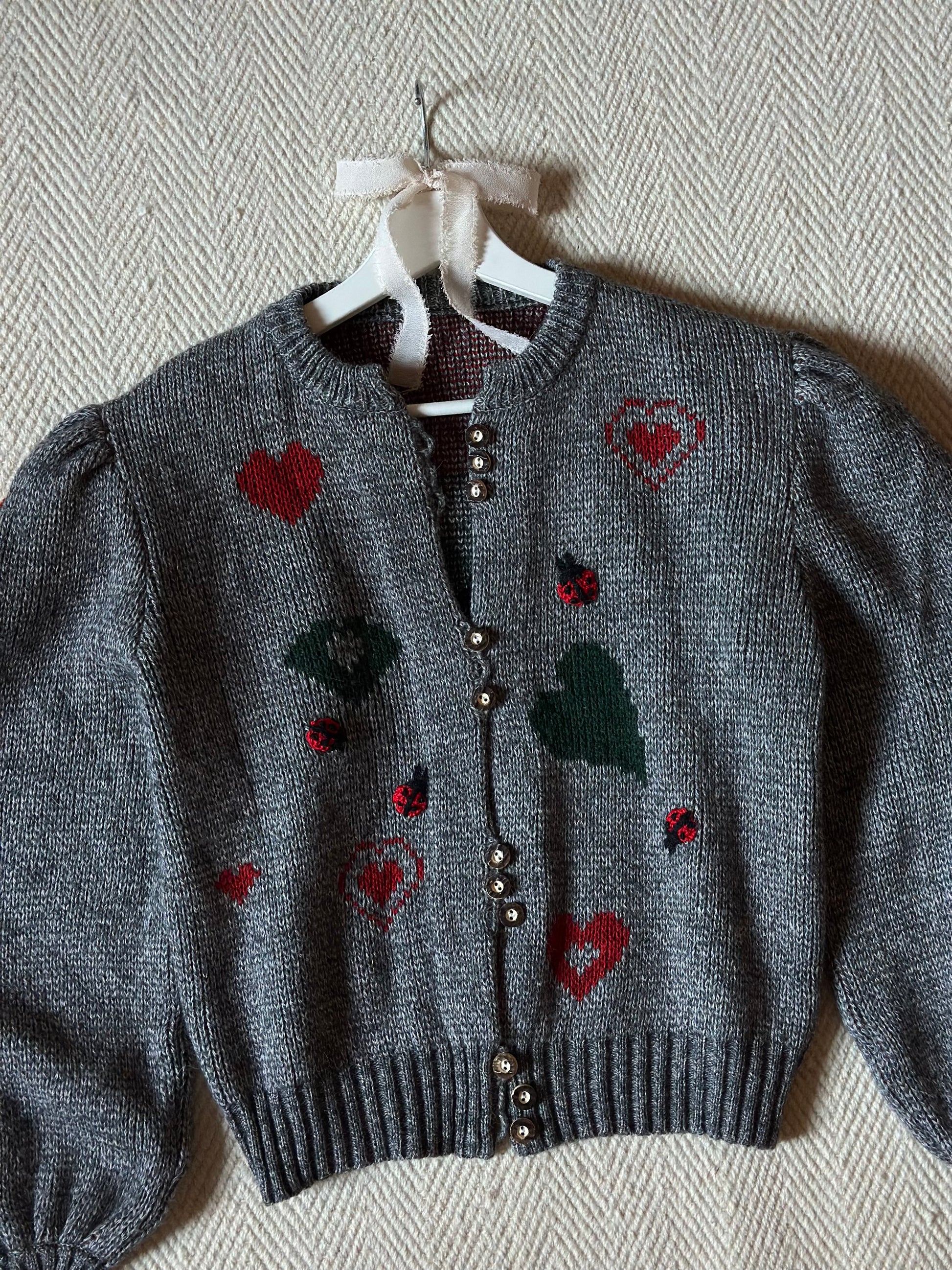 Romantic and rare vintage Austrian cardigan in a classic gray color featuring front button fastening with faux horn buttons, long puffed sleeves, round collar and a slightly cropped fit. The cardigan is decorated with beautiful green and red hearts and ladybirds embroidery all over, making it a truly unique and oh-so-sweet vintage masterpiece.