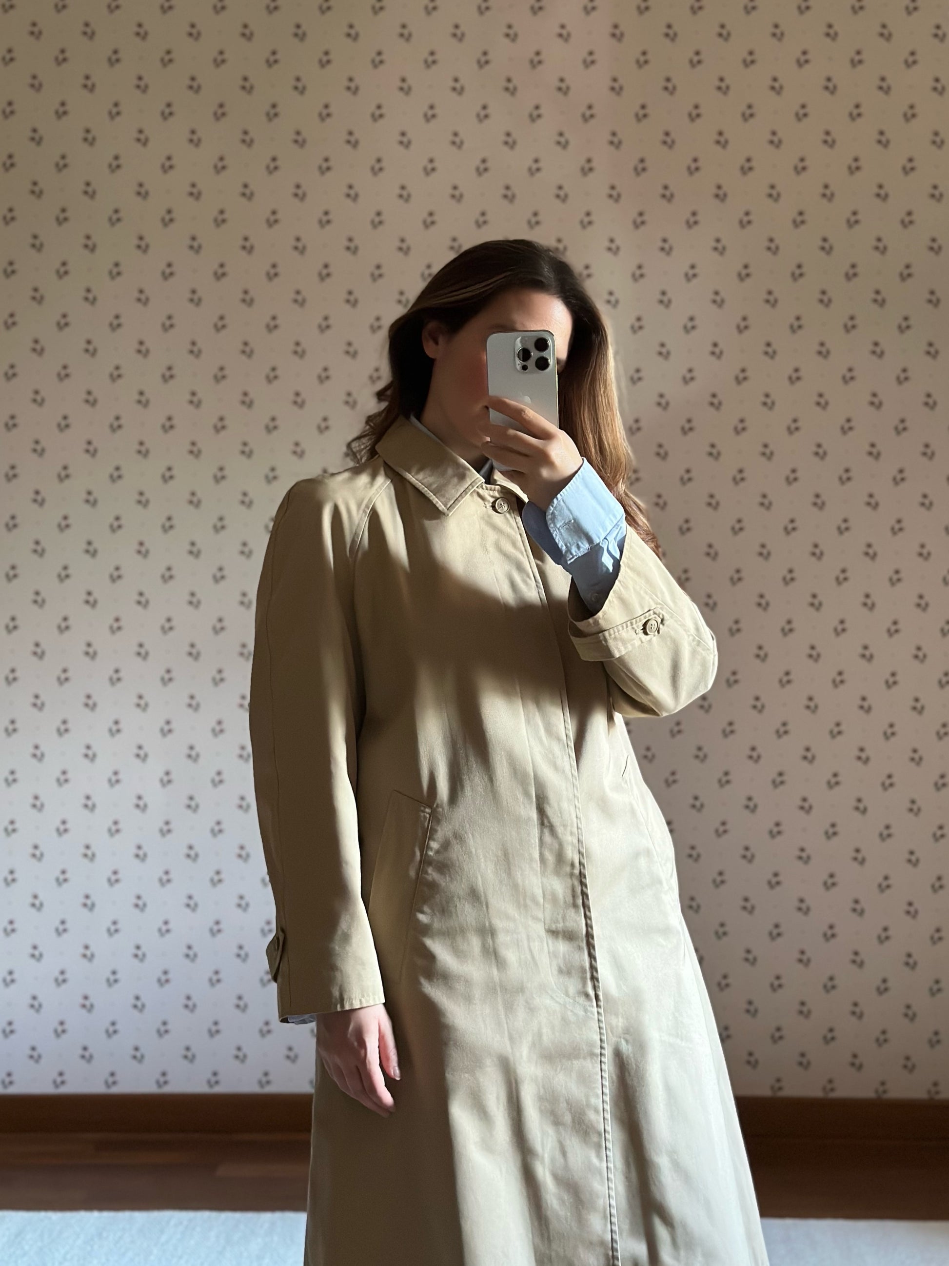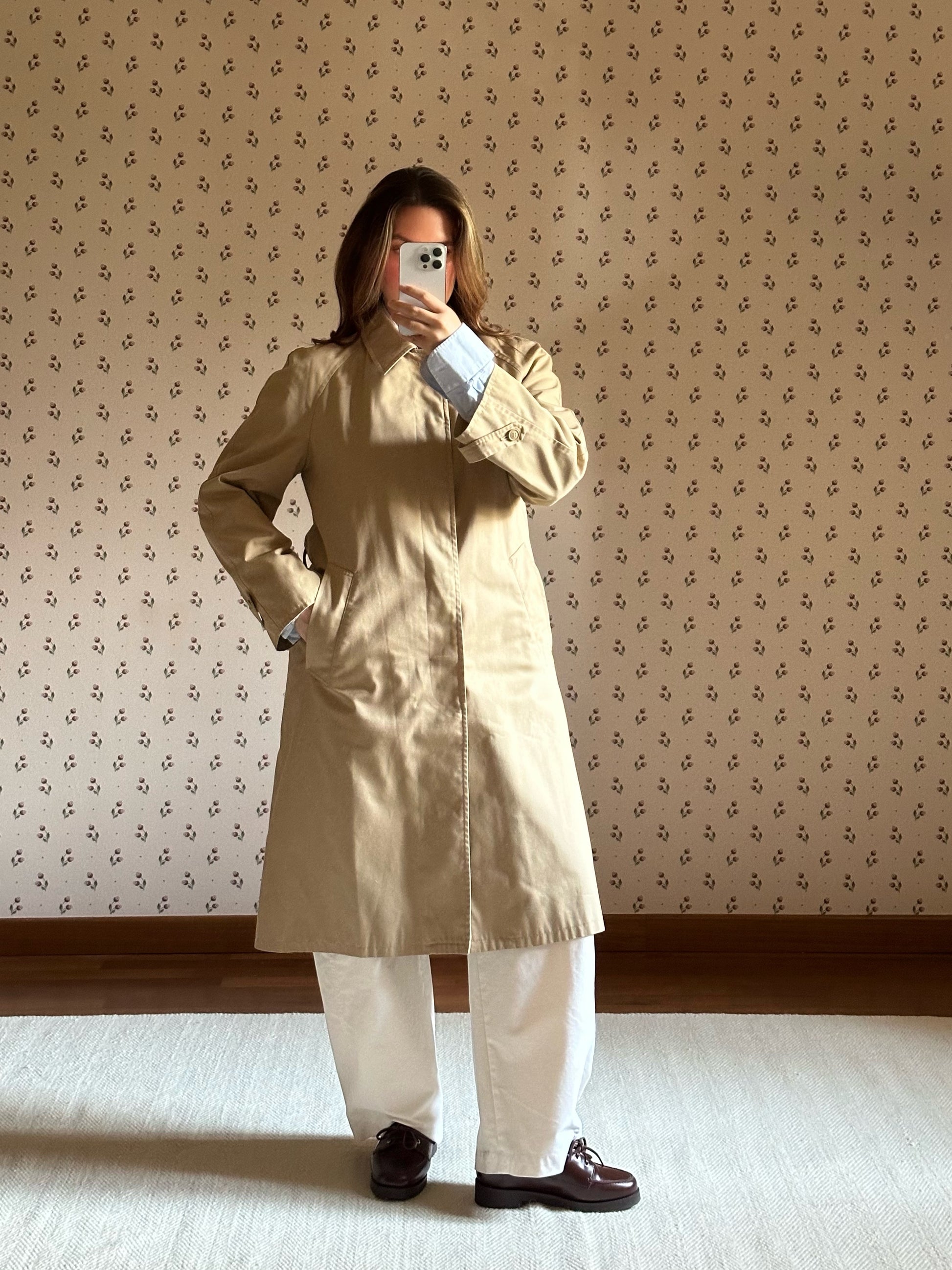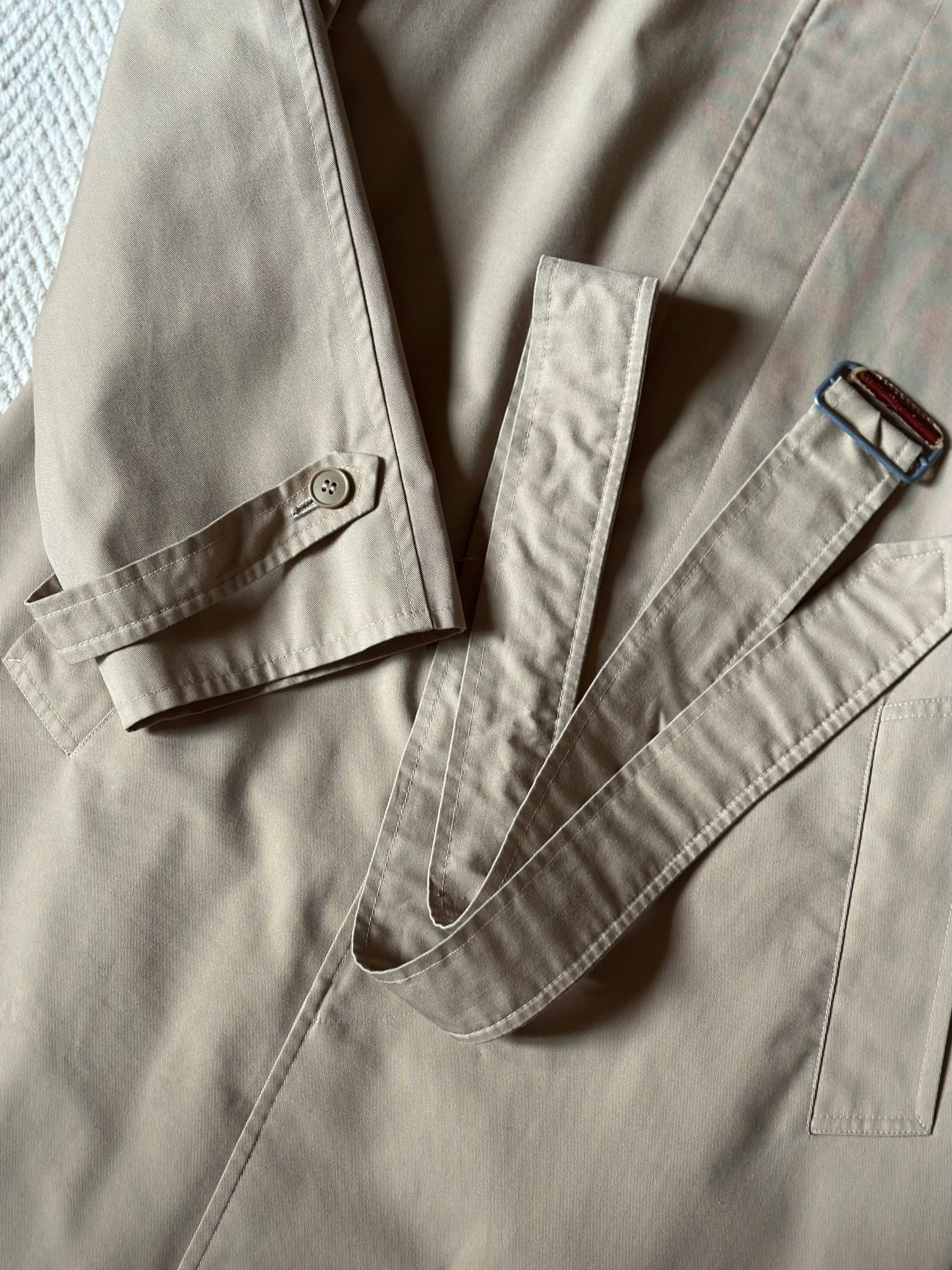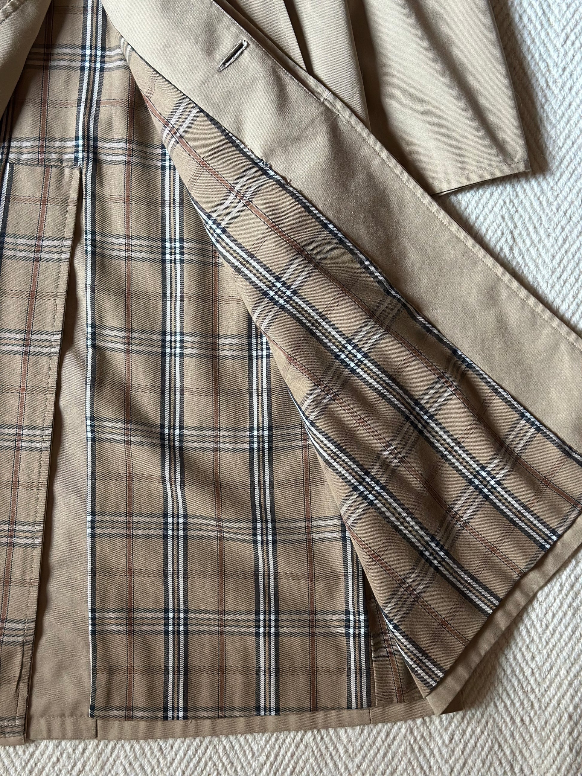 Classic and beautiful vintage trench coat featuring a timeless light beige shade, round collar, raglan sleeves and a stunning checkered lining. The trench coat is also embellished with little buckles on the sleeves and has a practical belt and belt loops. Please note that the coat is in perfect conditions, only the leather part of the belt shows some slight signs of wear (see last pictures).