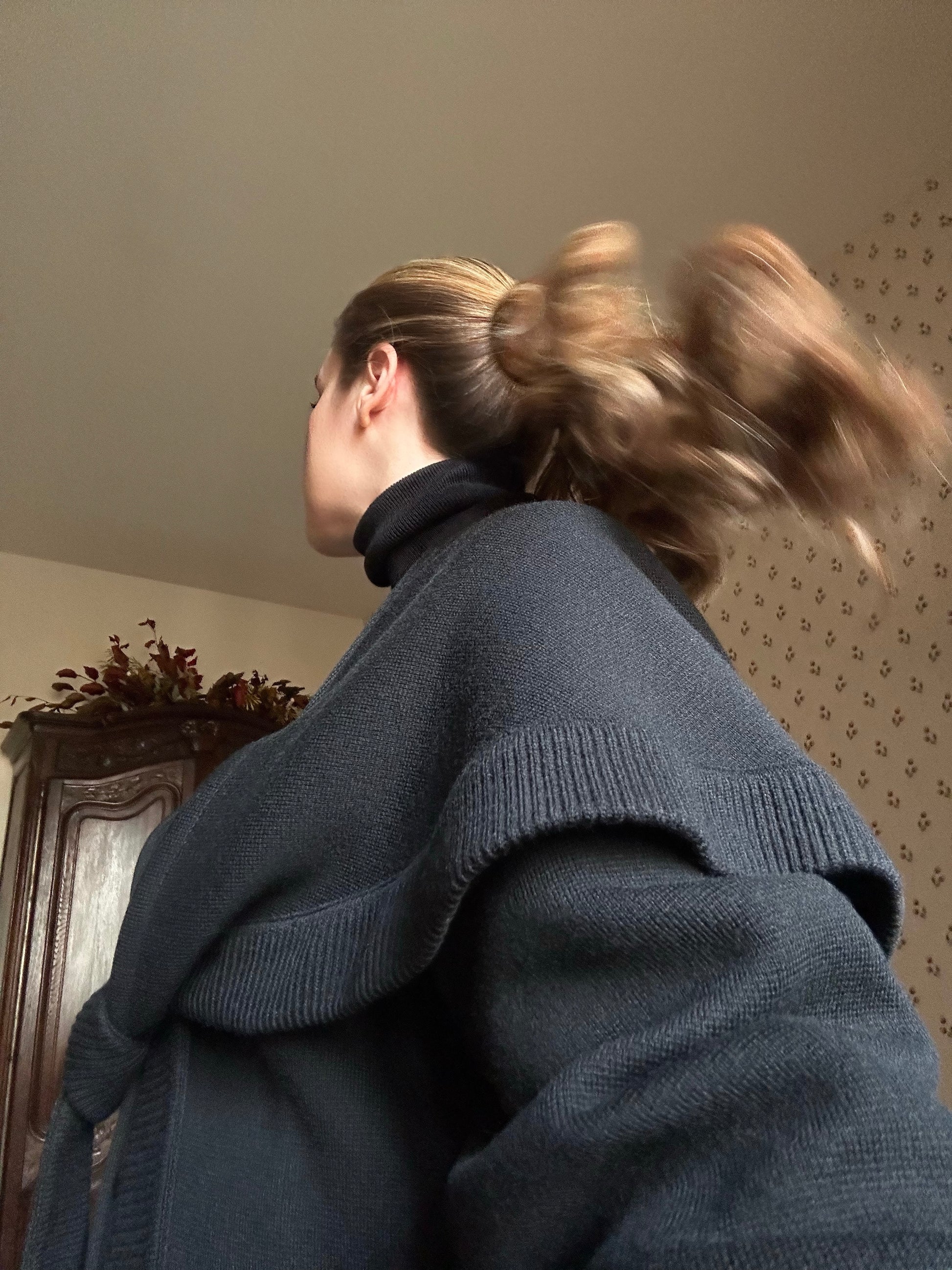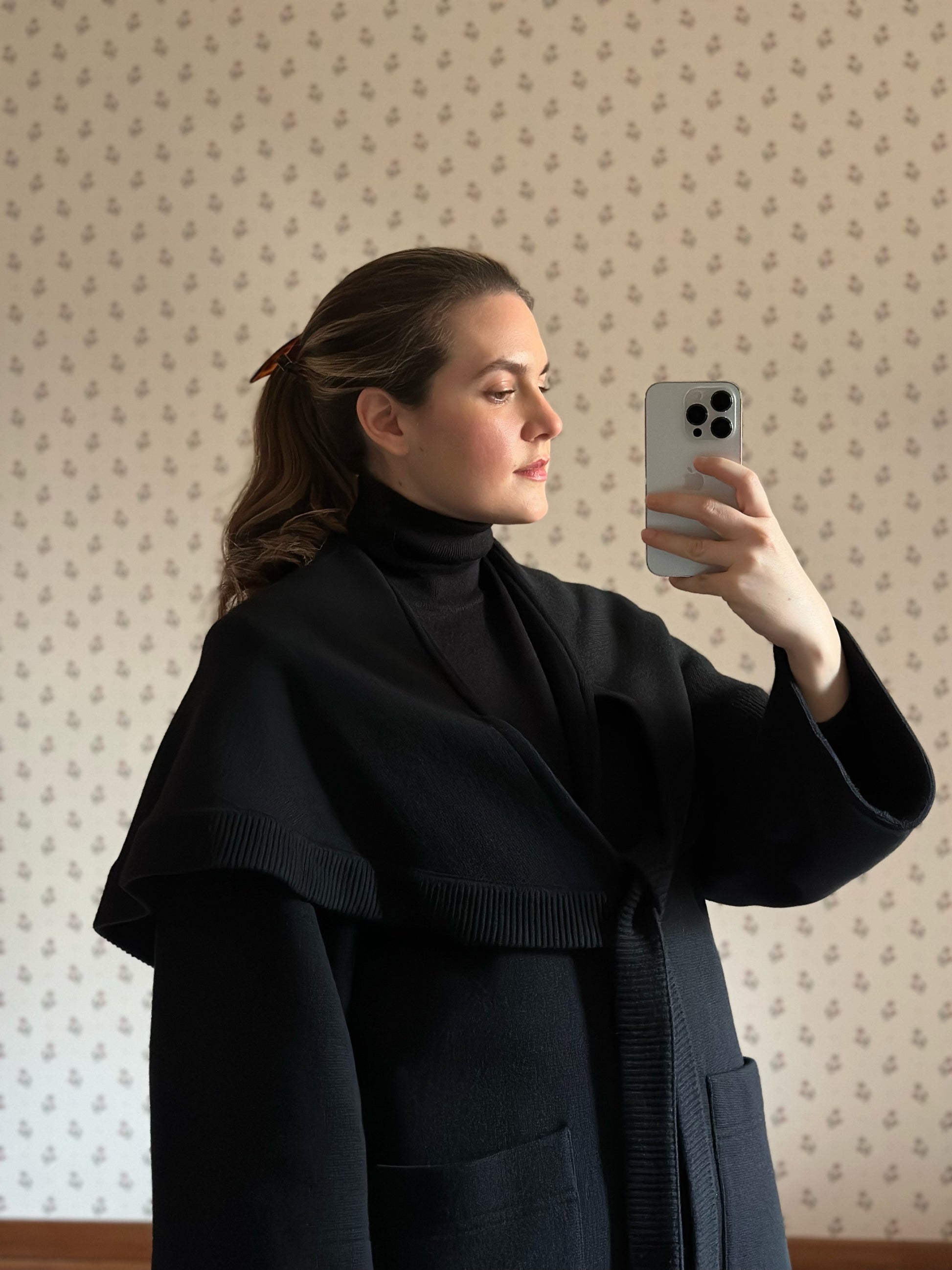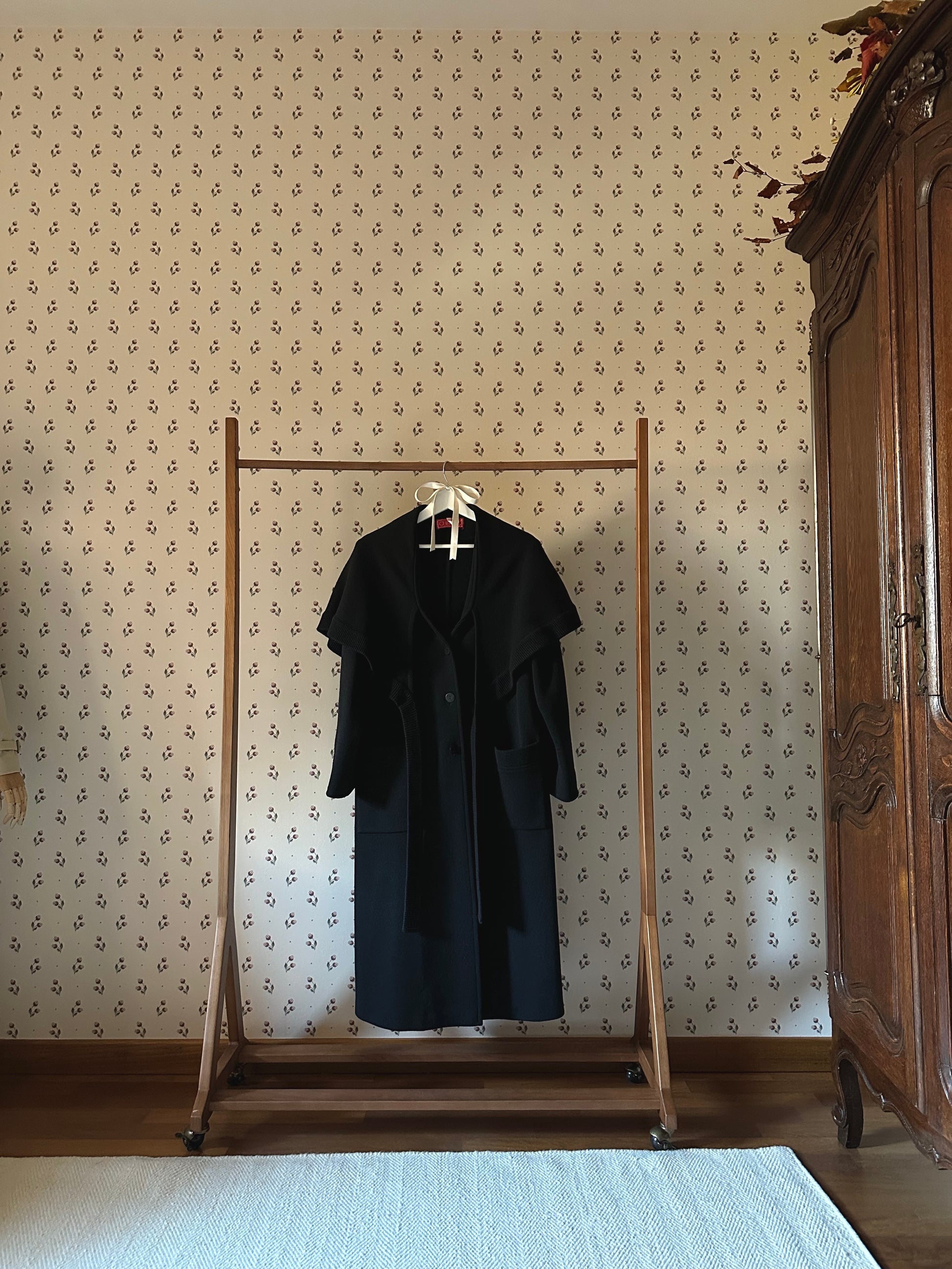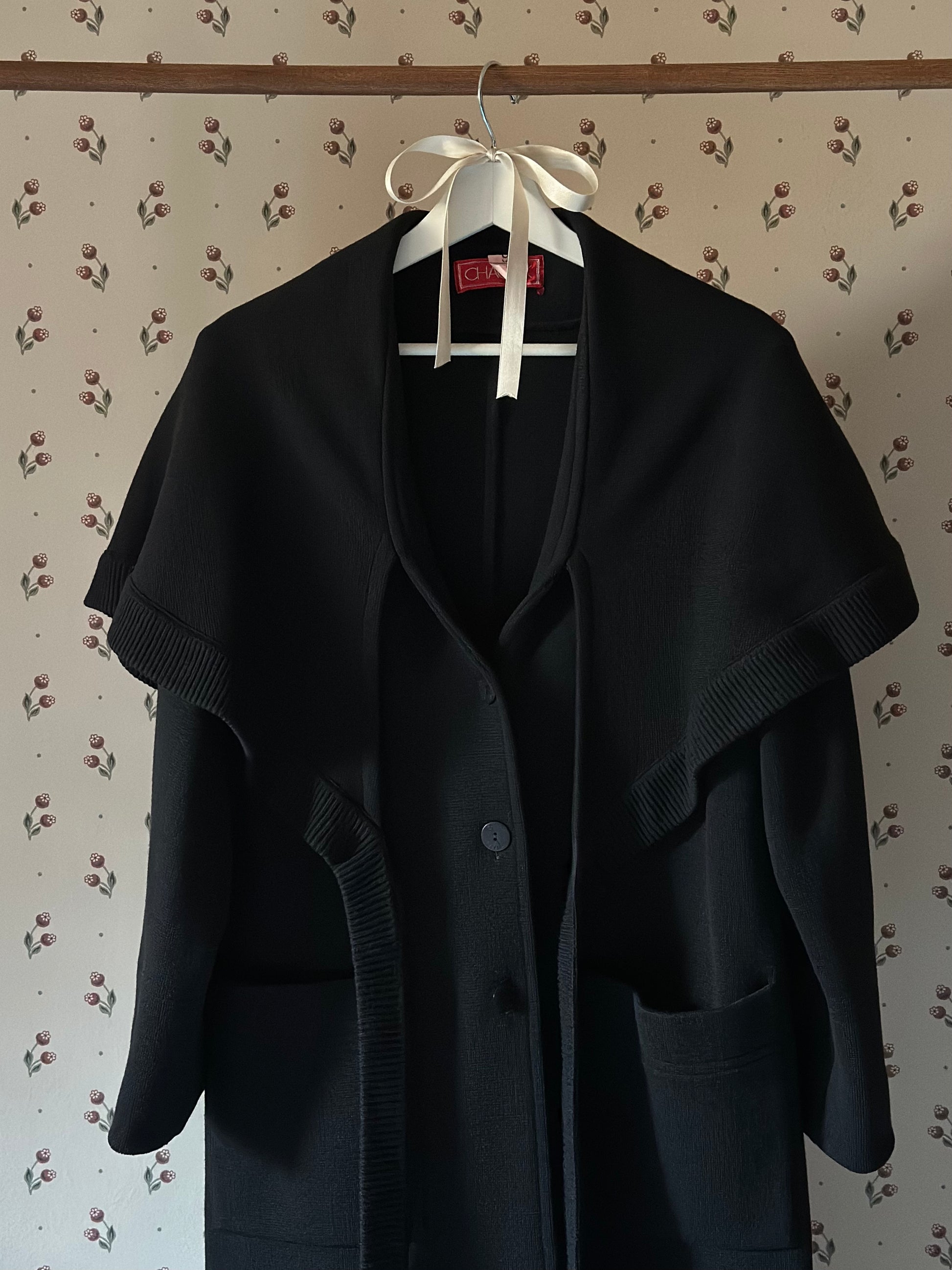 One-of-a-kind long black coat featuring a stunning sewn-in cape for extra warmth on the shoulders with ribbons that can be tied in a bow or left hanging. The coat has a flattering and comfortable loose fit, long sleeves and front button fastening. The material is a thick and warm knitted wool that is soft and non-itchy o the skin. The brand, Chacok, is an iconic vintage line founded in the 70s in the French Riviera by a parisian fashion designer.