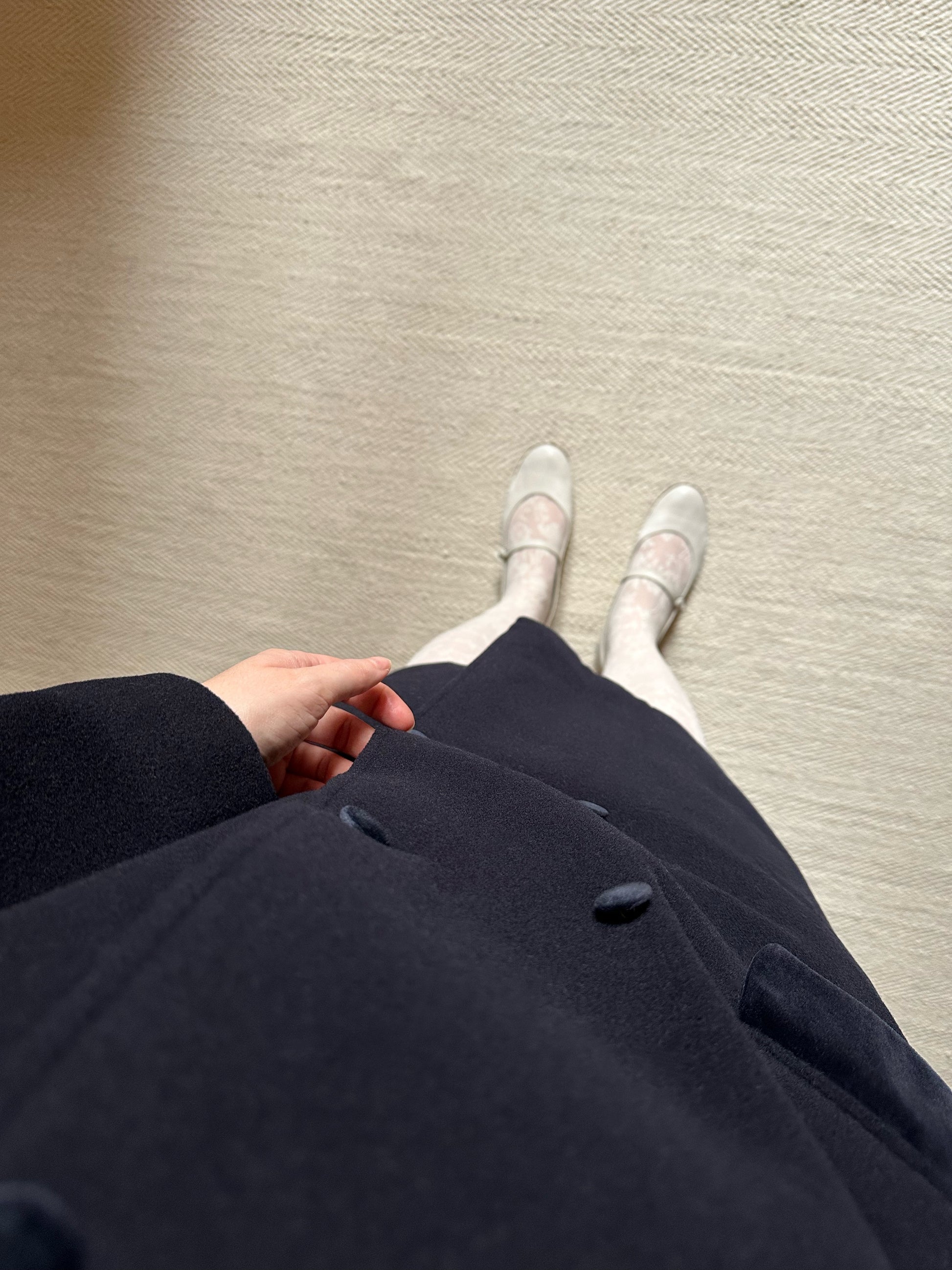 The label with the composition has washed out and it is not possible to read it but from the texture and warmth of the fabric we can safely assume it is pure new wool while the collar and buttons are cotton velvet.