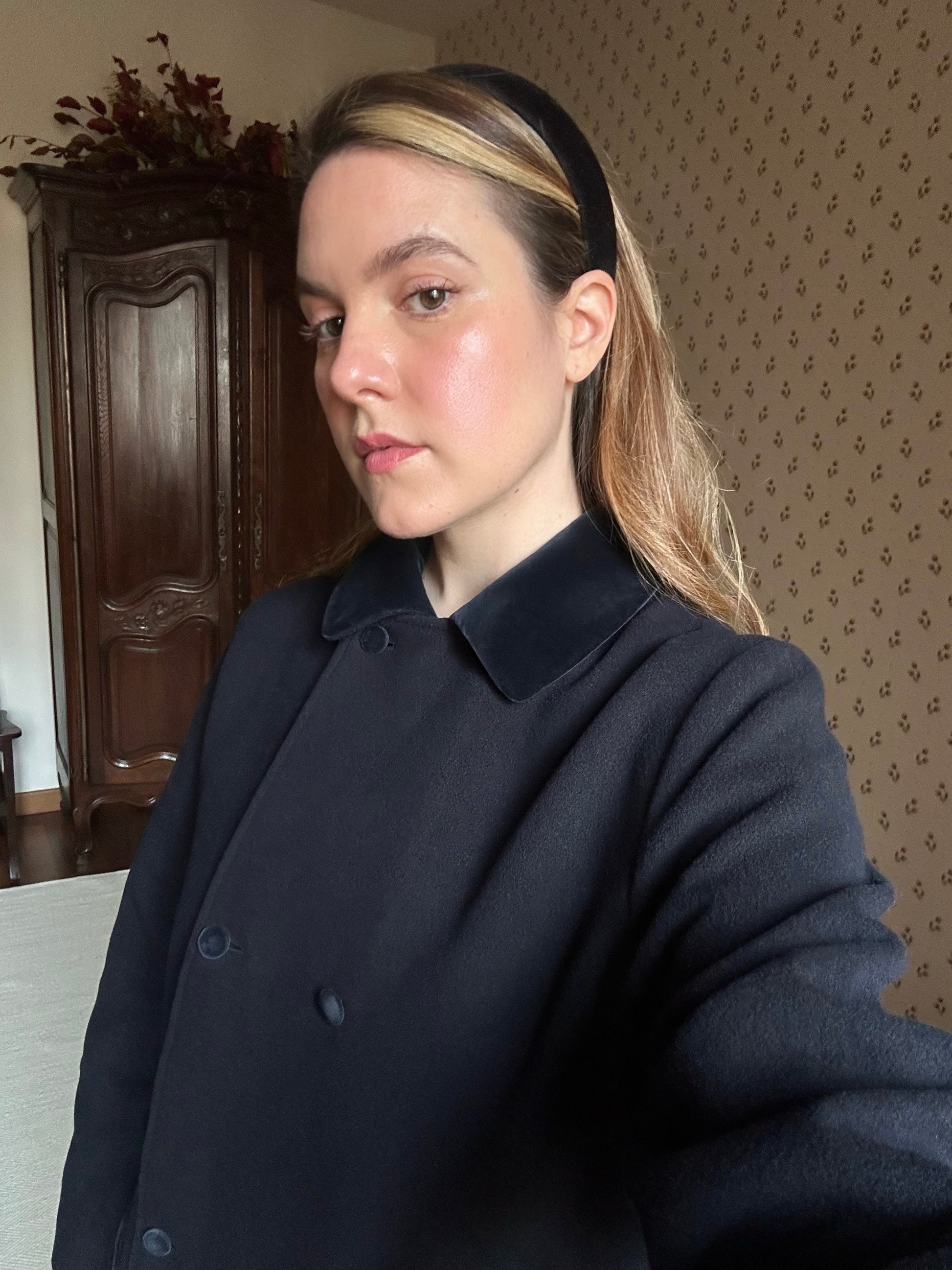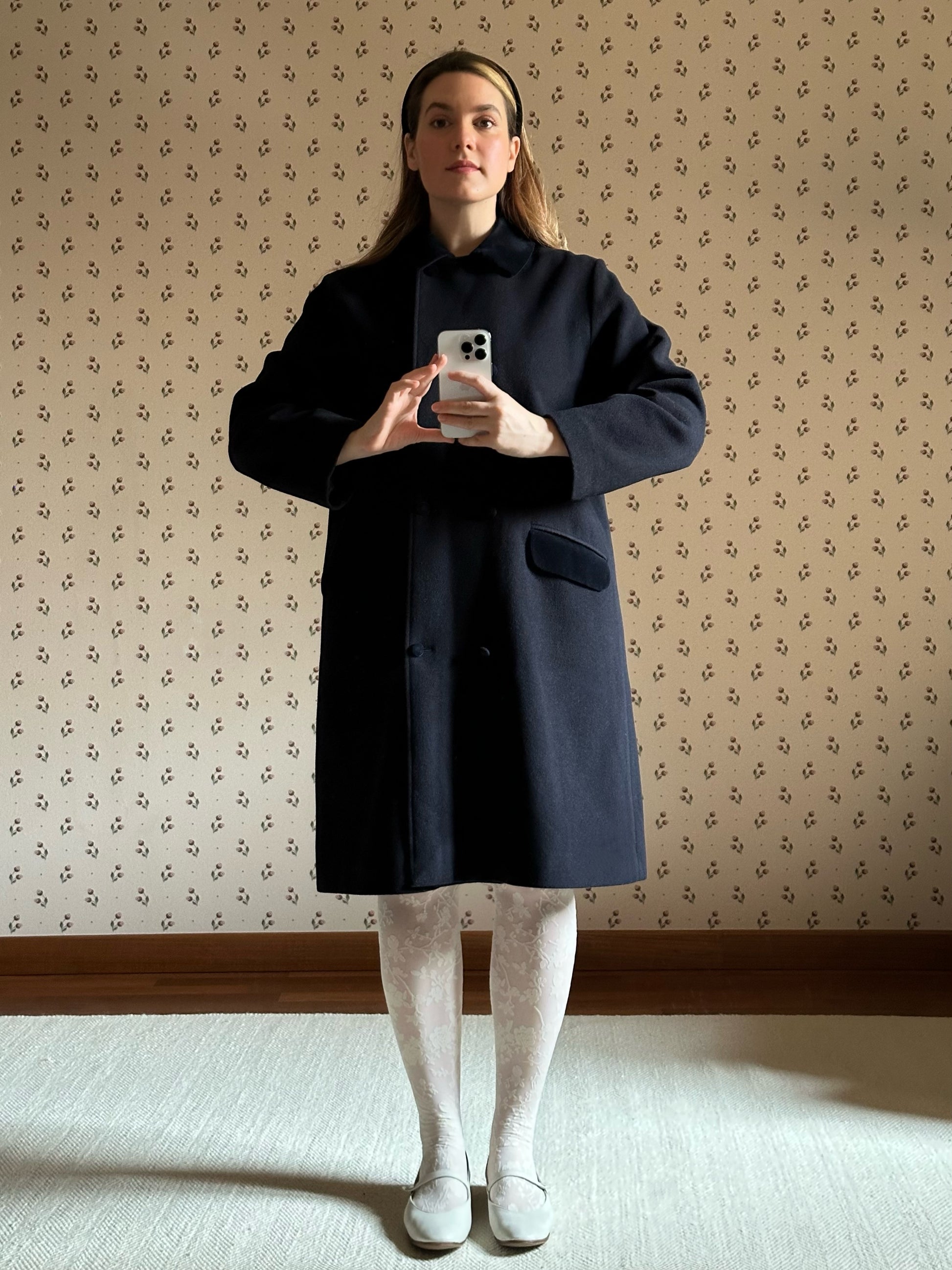 Unique and sophisticated navy blue swing coat by Scapa Scotland featuring long sleeves, front button fastening and a comfortable, relaxed fit. It is embellished with a romantic blue velvet collar and velvet buttons that add a lovely chic touch to the piece. The coat is crafted from a soft and warm pure wool and is fully lined, making it perfect for mid-season outfit as well as for layered full winter looks.