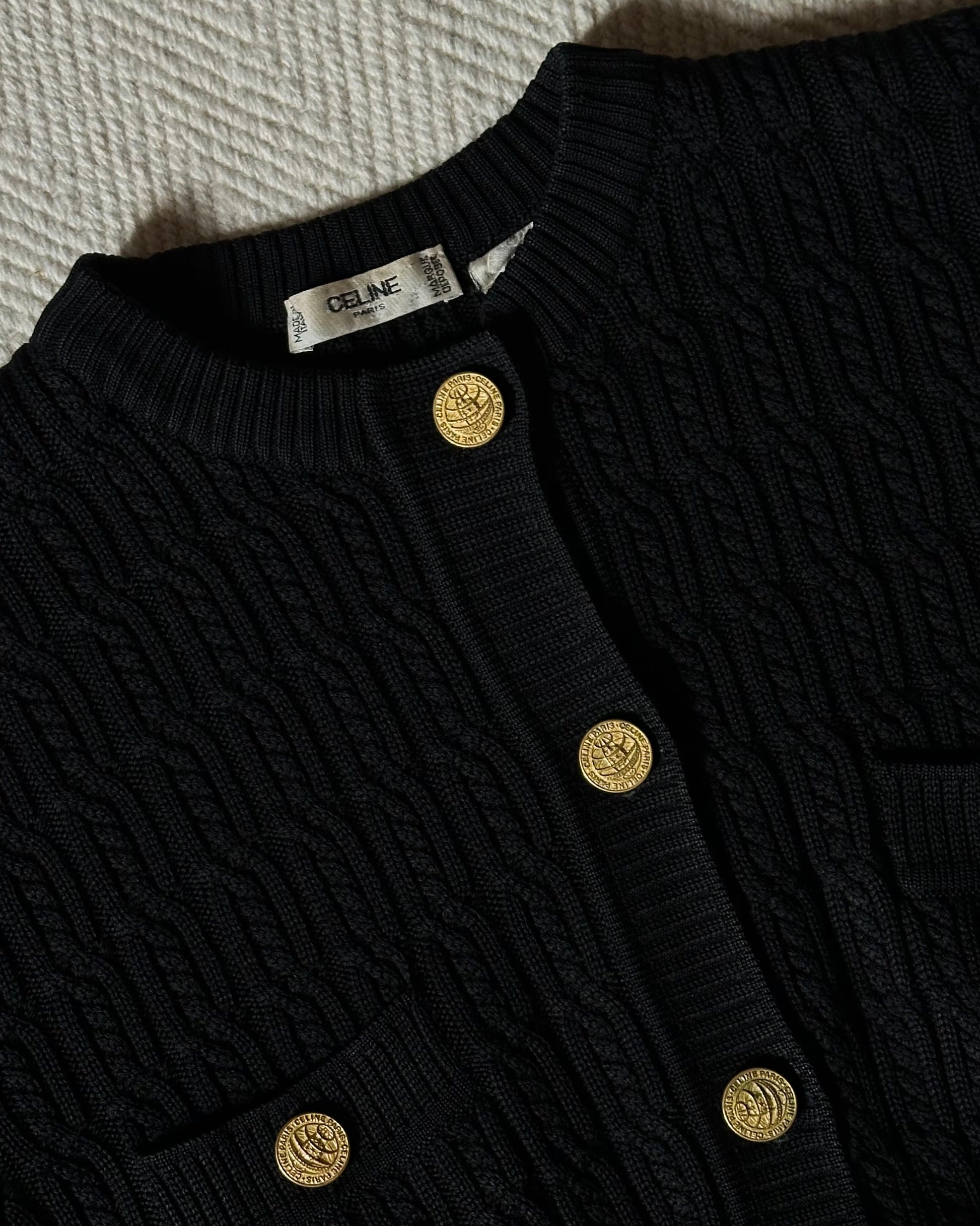 Stunning and luxurious black cardigan by Céline featuring long sleeves, round neckline, cable knit pattern all over and gorgeous golden engraved buttons. This incredible vintage find also presents four front pockets, ribbed hem and cuffs and a structured yet comfortable fit. Please note that the cardigan is in perfect conditions but one button on the bottom right pocket was missing and has been replaced by a professional seamstress with a similar, unbranded one. The difference is hardly noticeable once worn but of course it has been taken into consideration while setting the final price.