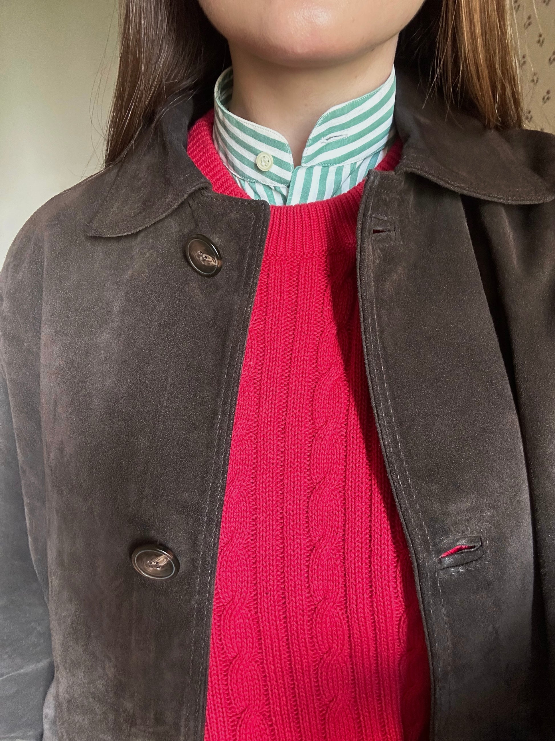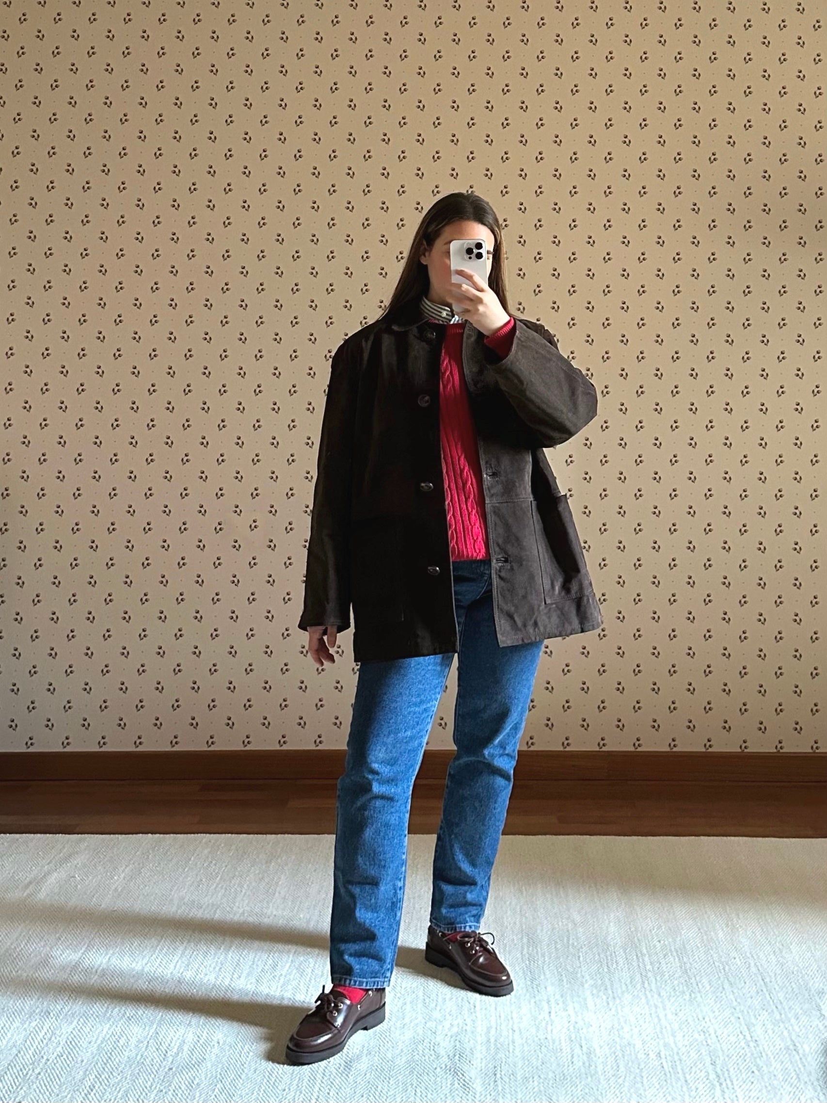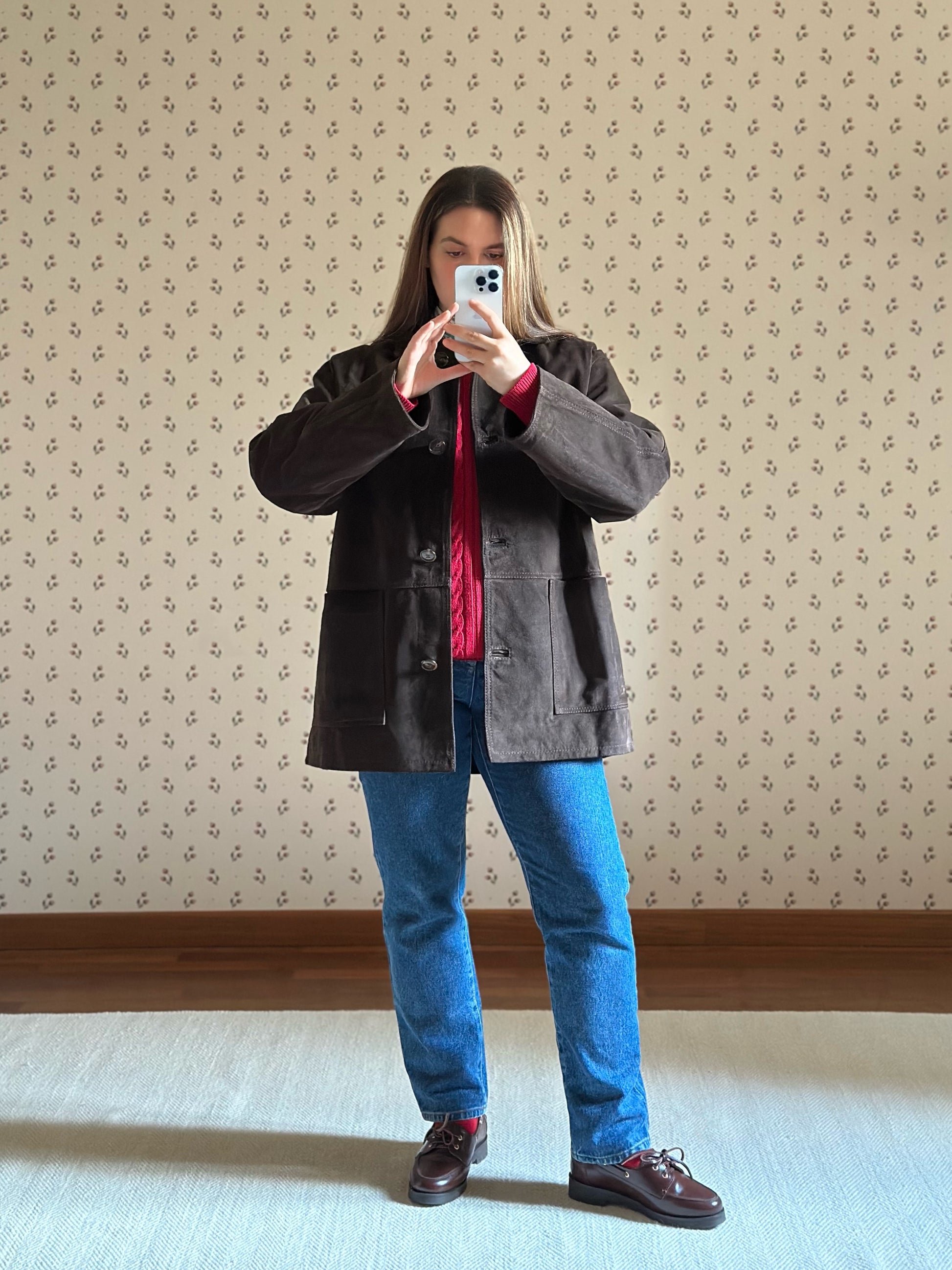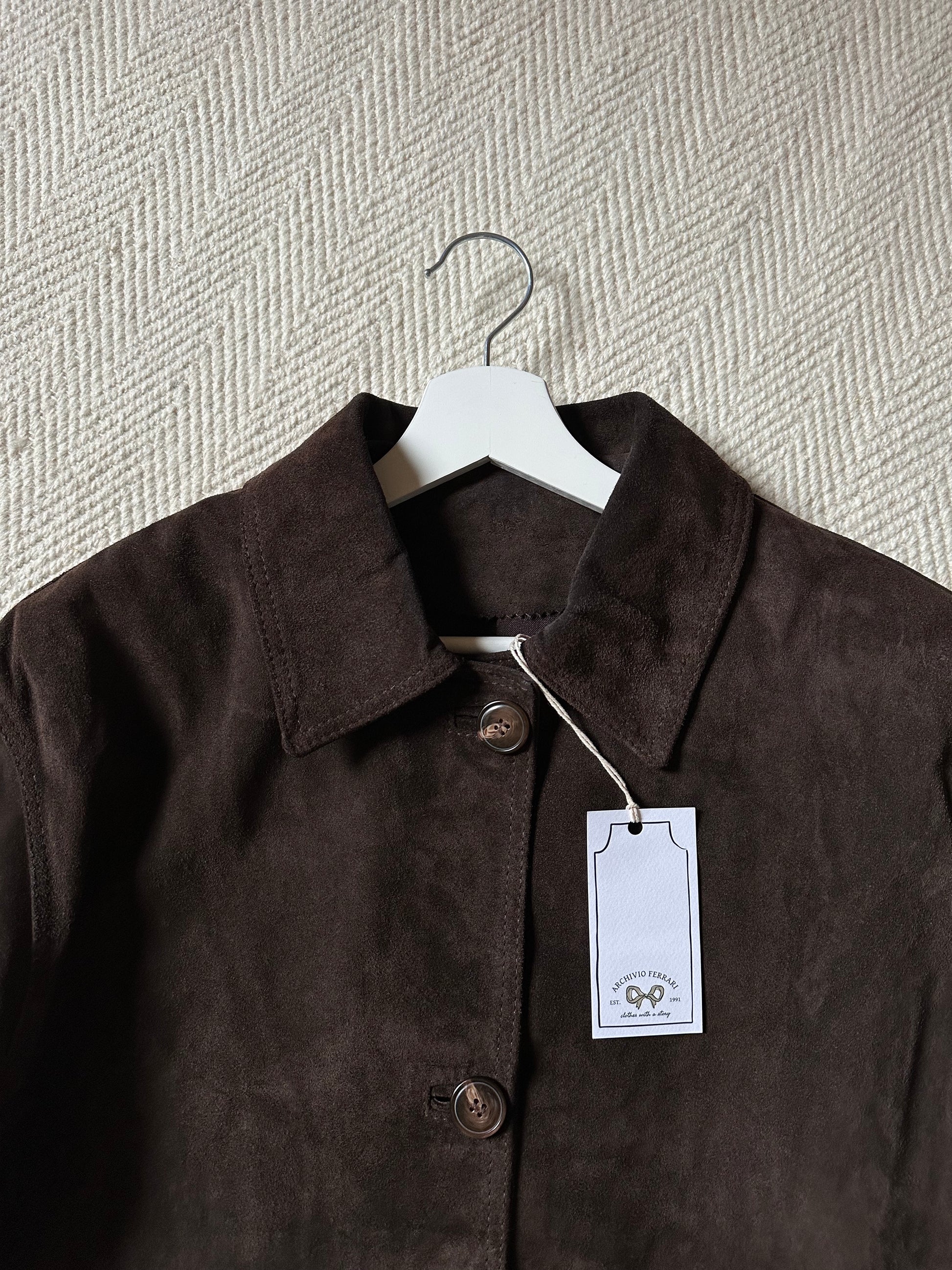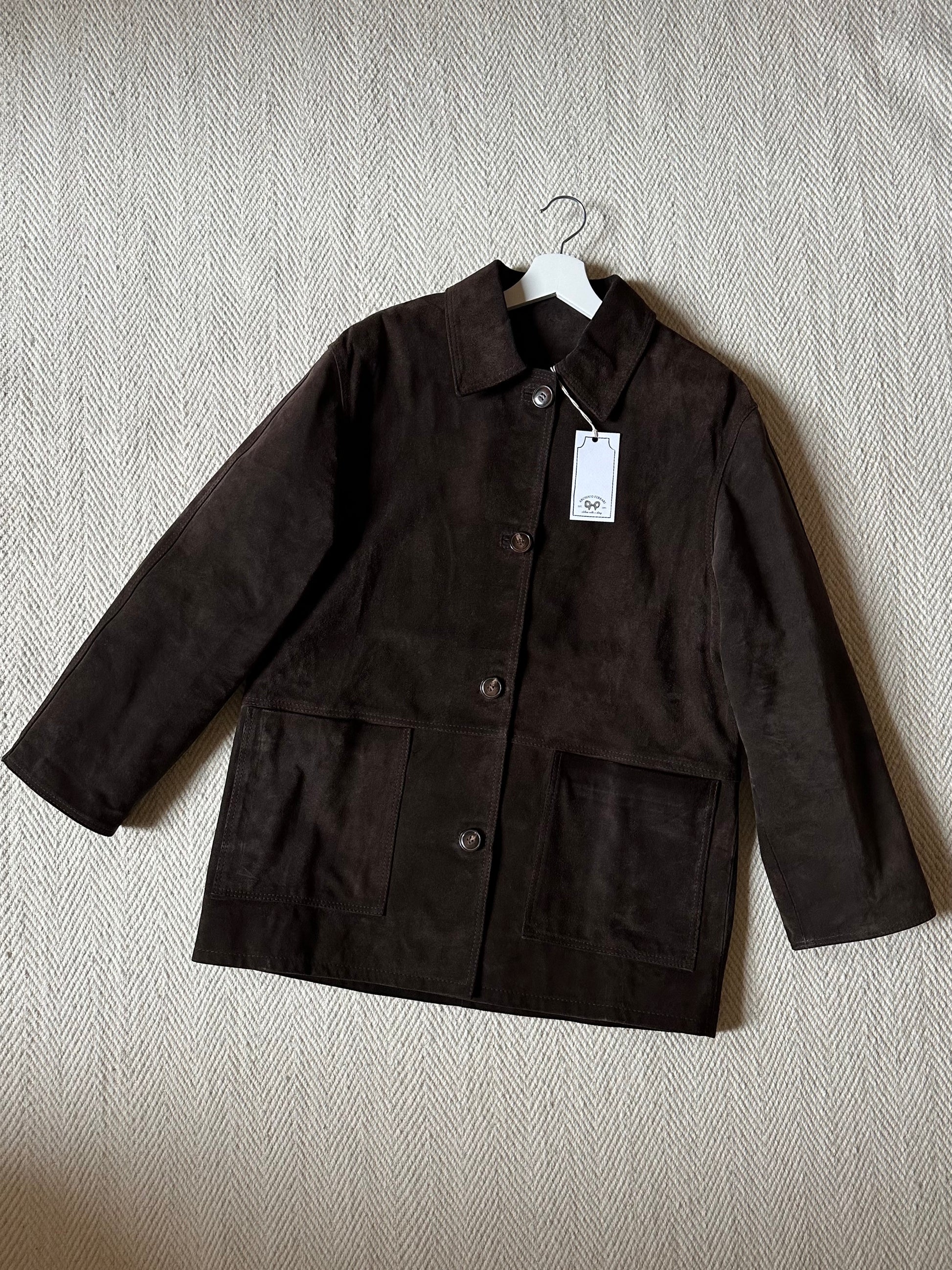 Timeless and beautiful real suede chocolate brown vintage jacket featuring long sleeves, regular collar, button up with brown buttons and a structured and slightly oversized fit. The jacket is fully lined for a more comfortable wear and presents two large patch pockets.