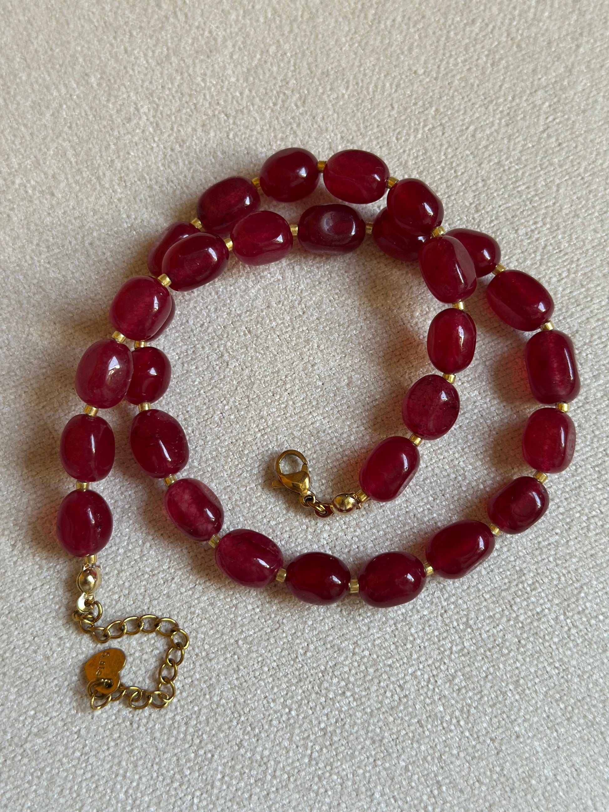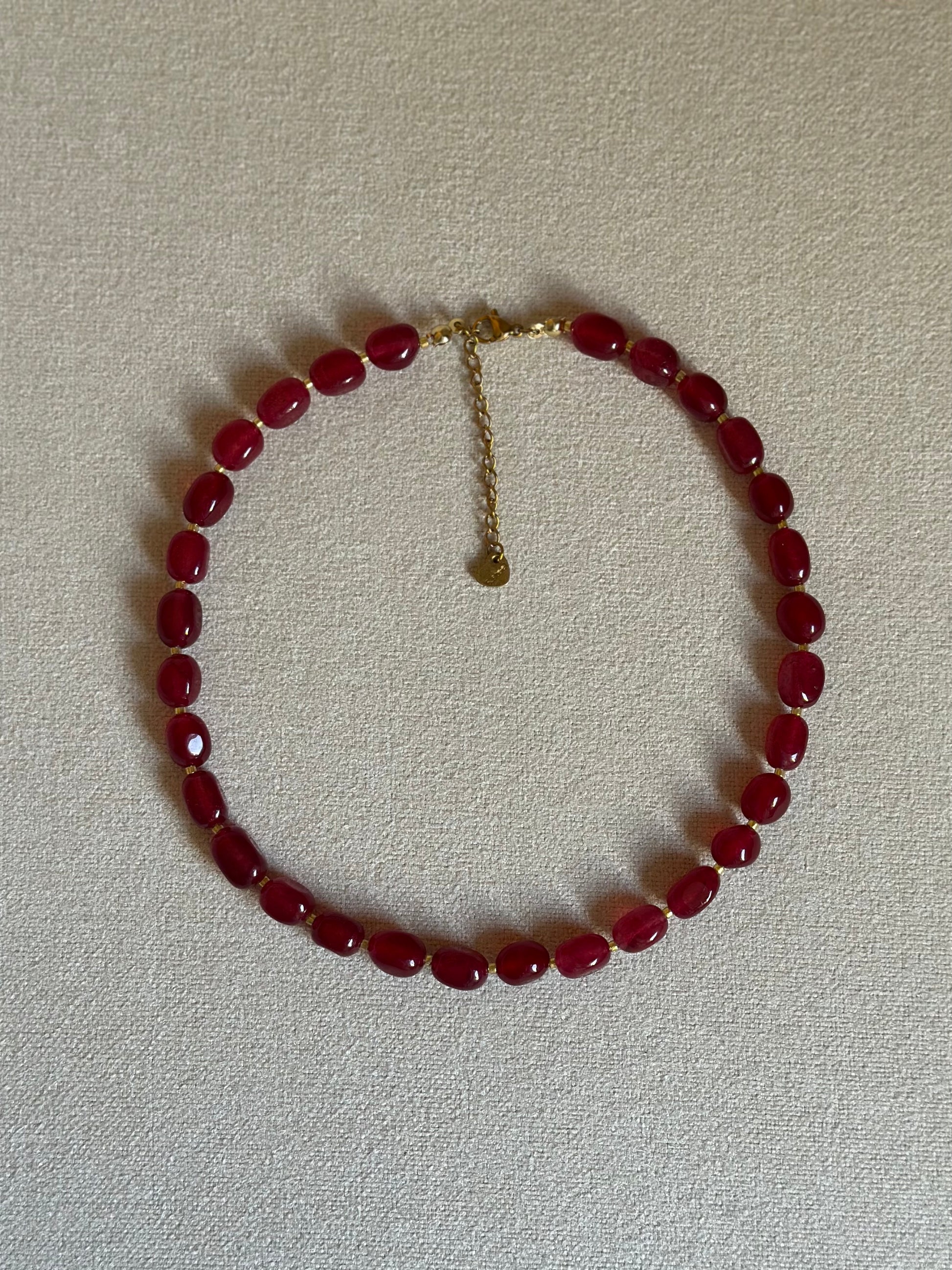 Elegant red garnet necklace featuring round beads and luminous golden details with extendable closure and classic lobster clasp. A beautiful pop of color (stunning as a chocker) to pair with a simple silk blouse and a blazer or to create contrast with a light-toned turtleneck.