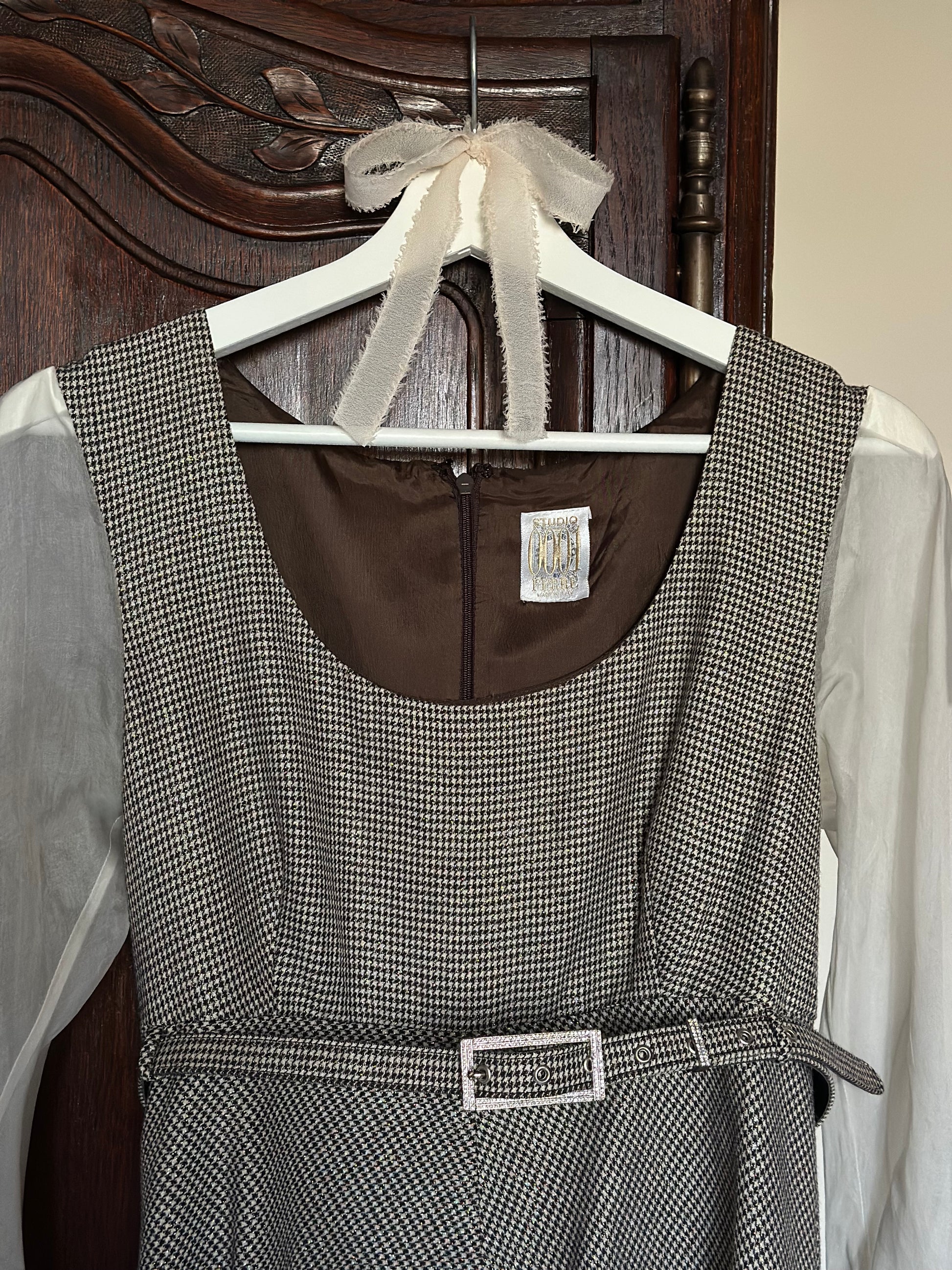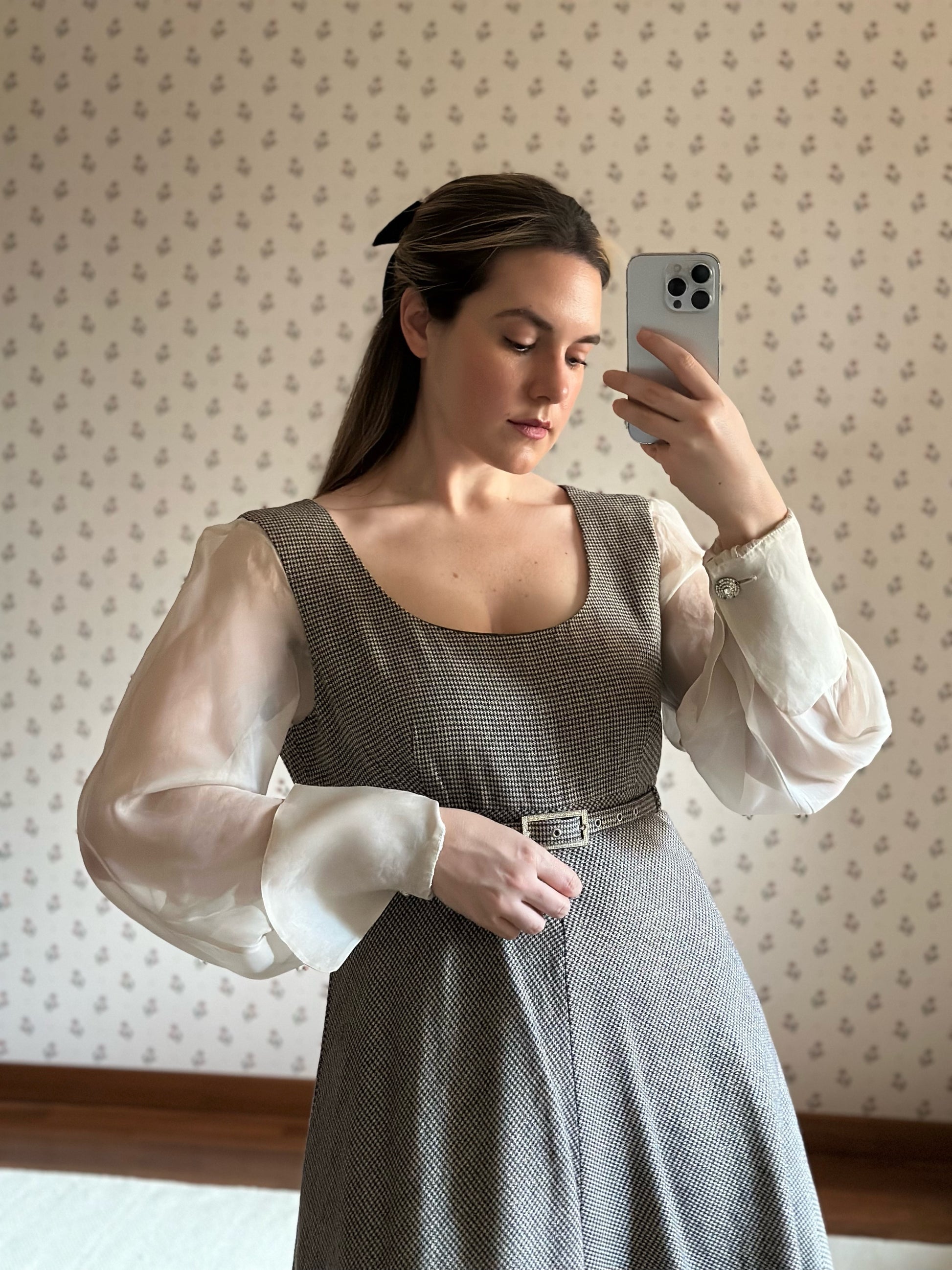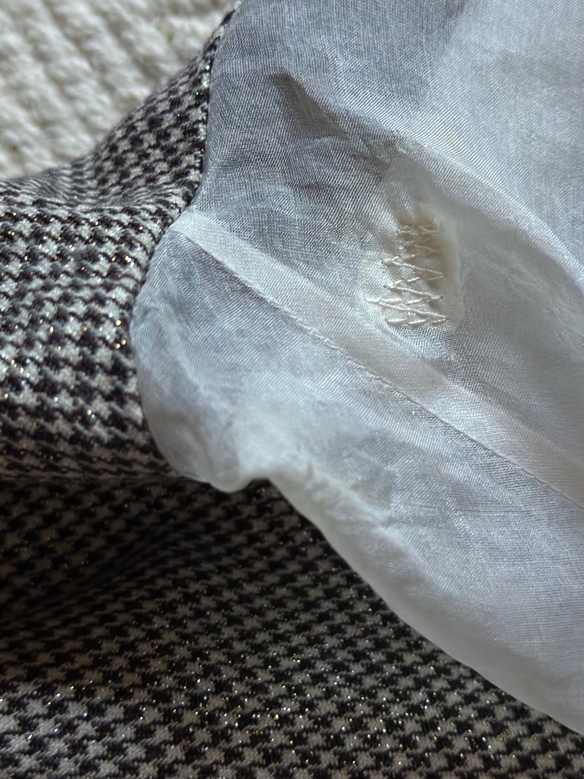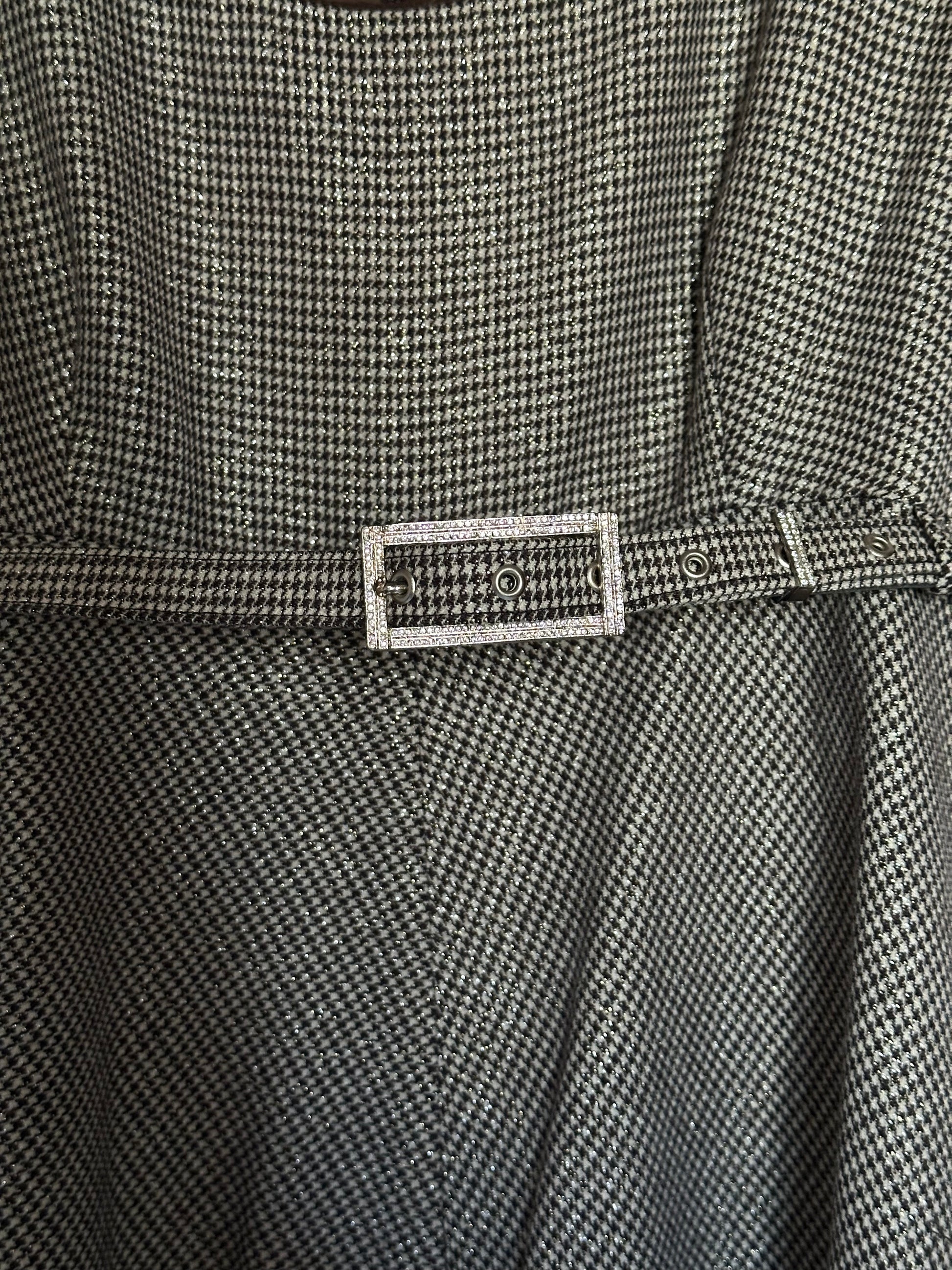 Dreamy and romantic one-of-a-kind dress by the iconic Italian designer Gianfranco Ferré featuring airy and flowy silk organza sleeves with folded cuffs and jewel buttons, a classic and flattering A-line skirt and pied-de-poule black and white pattern with a luminous lurex thread woven throughout the fabric that donates light and sparkle to the dress. The dress is fully lined and is embellished with a bejeweled matching belt that can be removed or added thanks to the belt rings on the dress. Please note that the dress is in perfect vintage conditions, only a small tear was present in the underarm area of the right sleeve and has been repaired by a professional seamstress (see last pictures), not noticeable once worn.