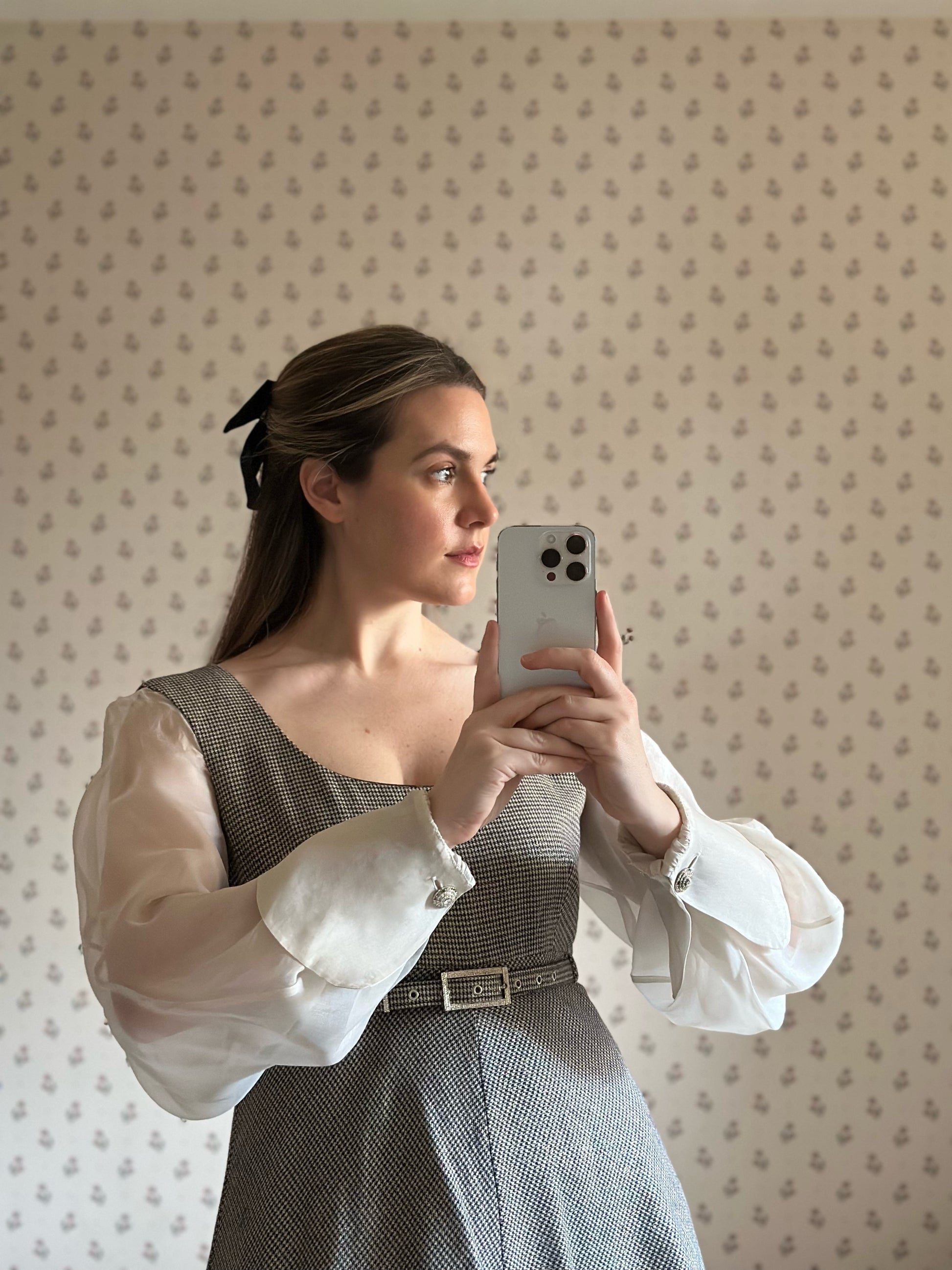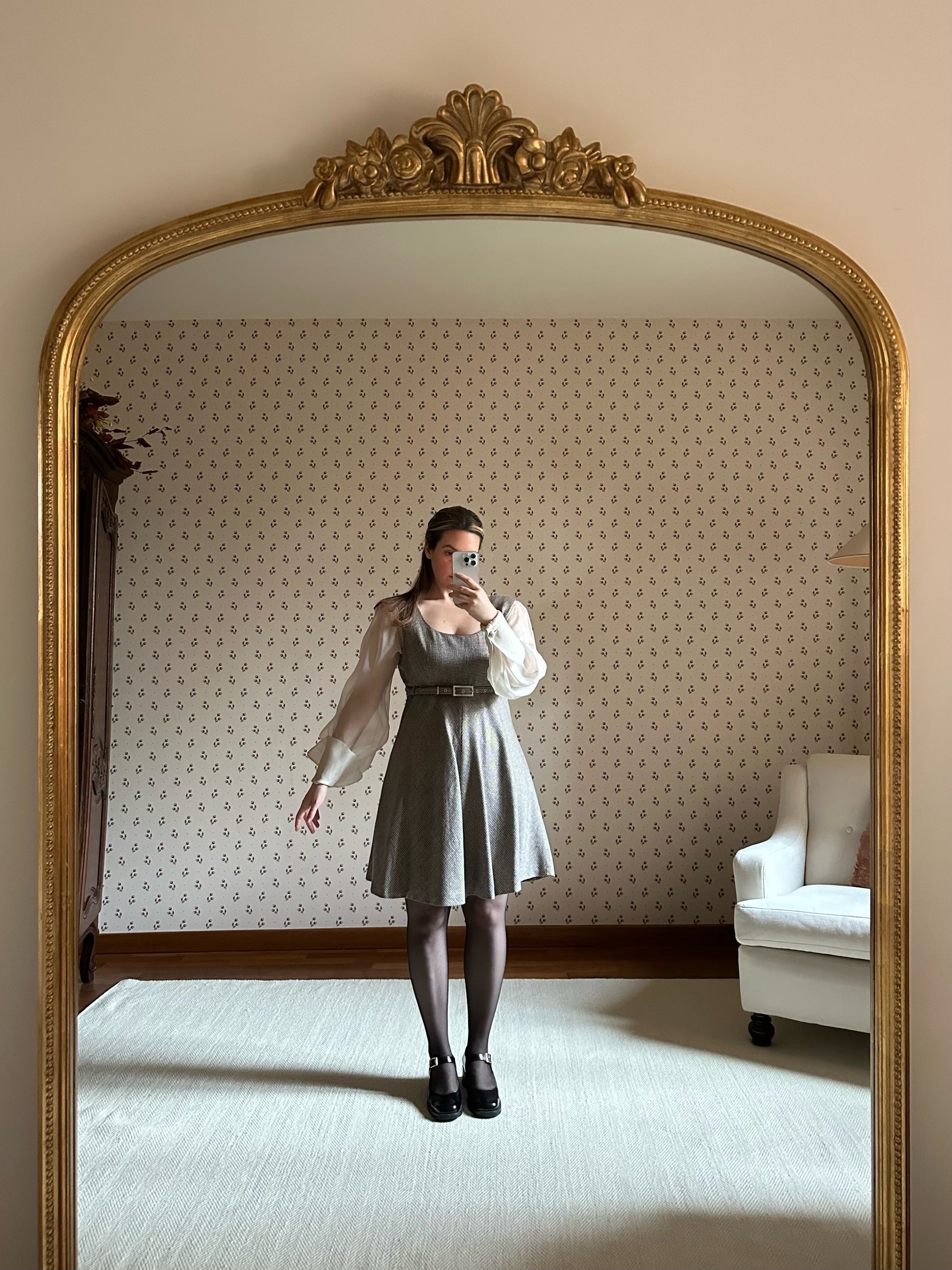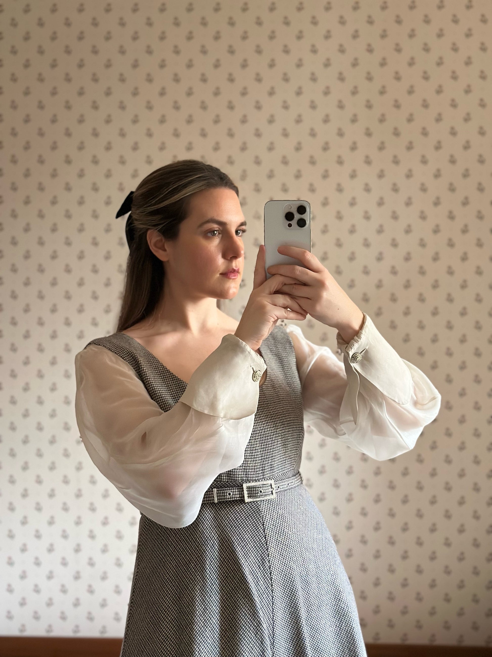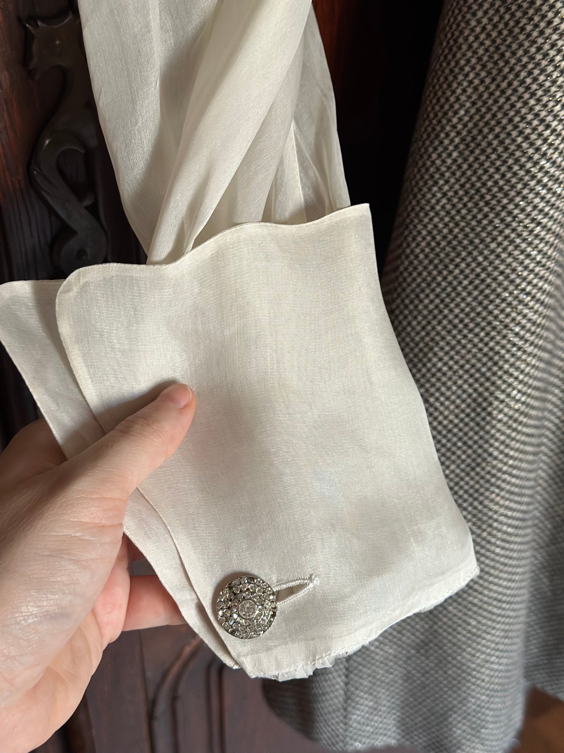 Dreamy and romantic one-of-a-kind dress by the iconic Italian designer Gianfranco Ferré featuring airy and flowy silk organza sleeves with folded cuffs and jewel buttons, a classic and flattering A-line skirt and pied-de-poule black and white pattern with a luminous lurex thread woven throughout the fabric that donates light and sparkle to the dress. The dress is fully lined and is embellished with a bejeweled matching belt that can be removed or added thanks to the belt rings on the dress. Please note that the dress is in perfect vintage conditions, only a small tear was present in the underarm area of the right sleeve and has been repaired by a professional seamstress (see last pictures), not noticeable once worn.