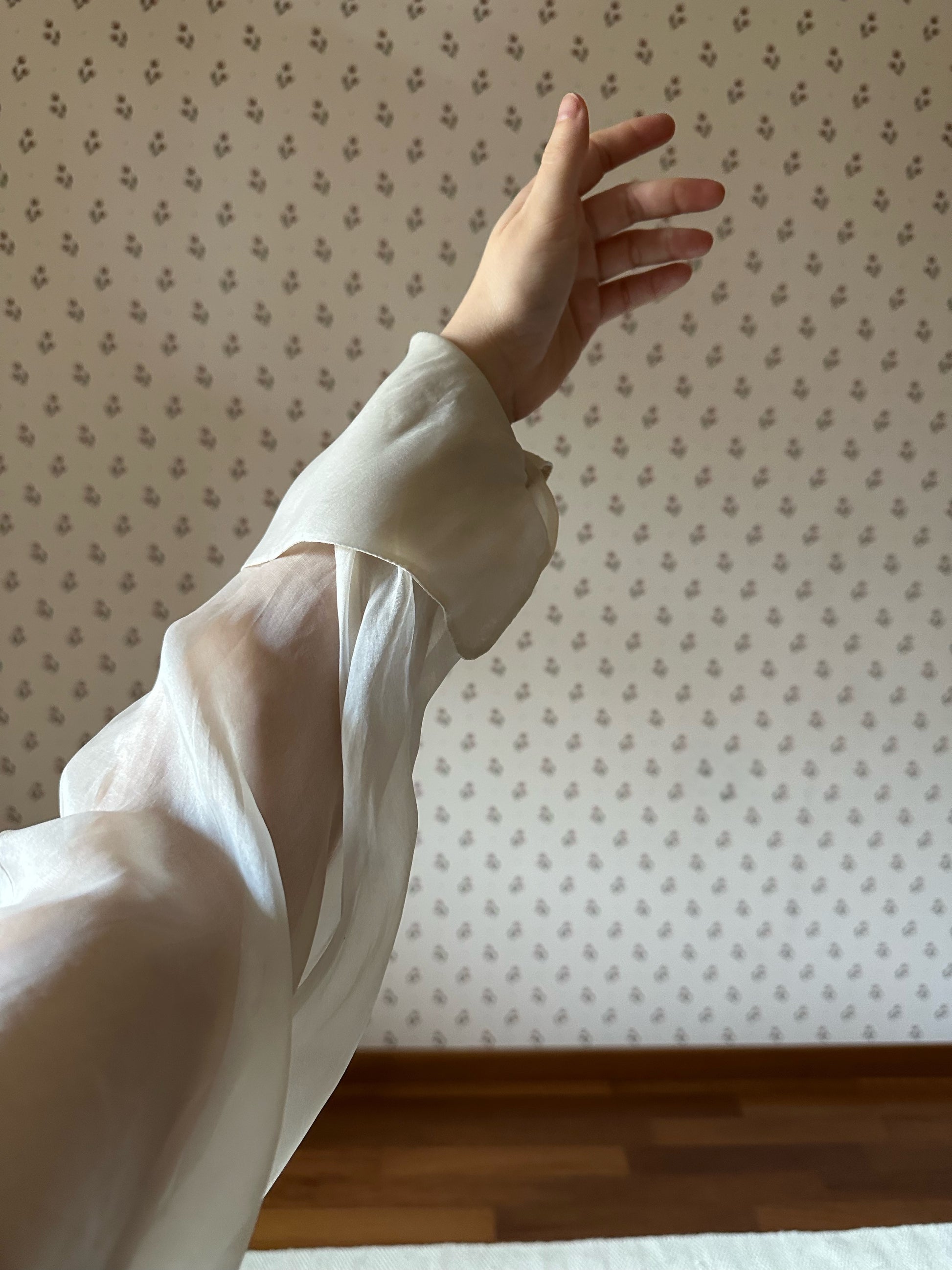 97% wool and 3% polyamide for the body and pure organza silk for the sleeves.