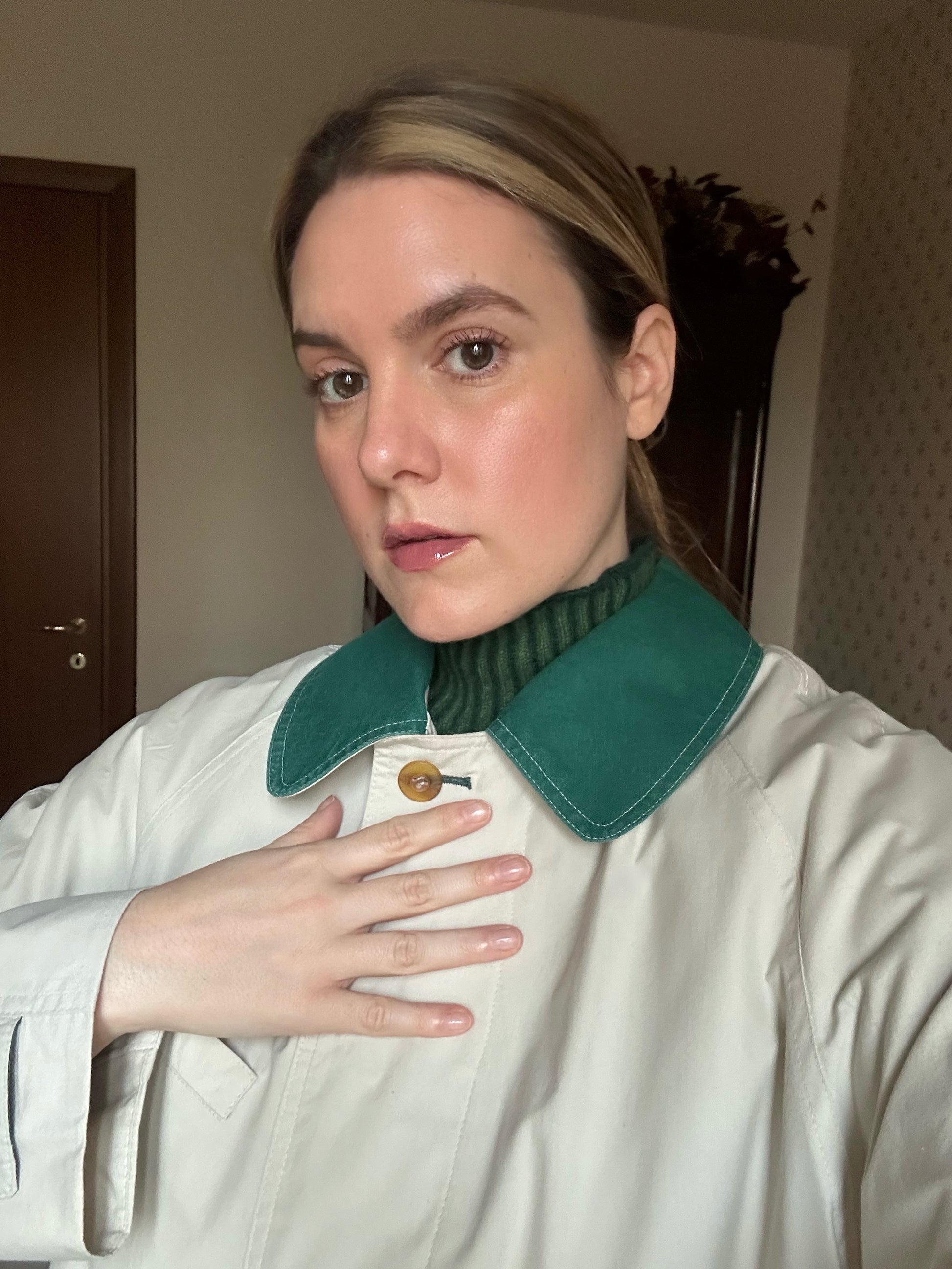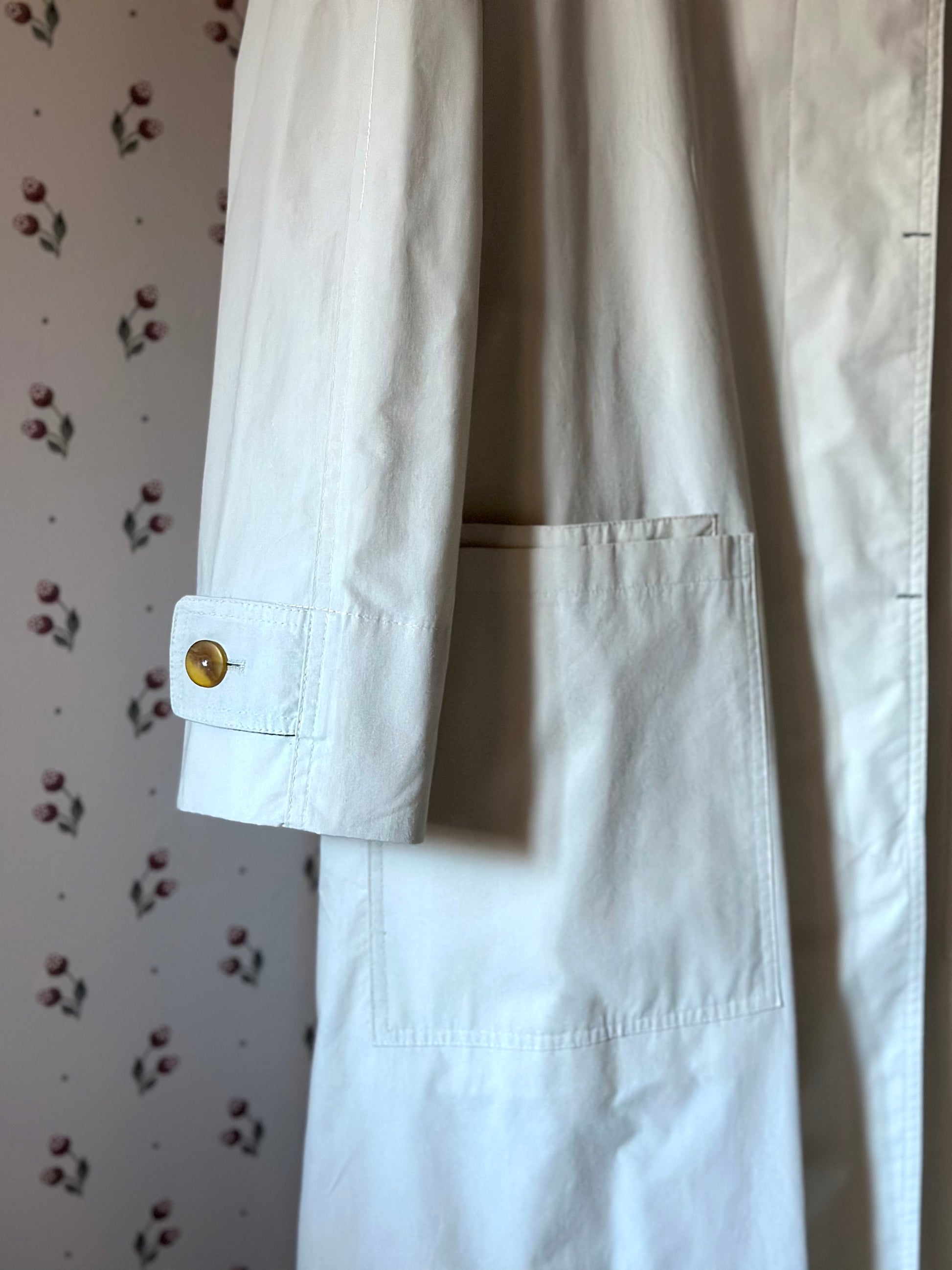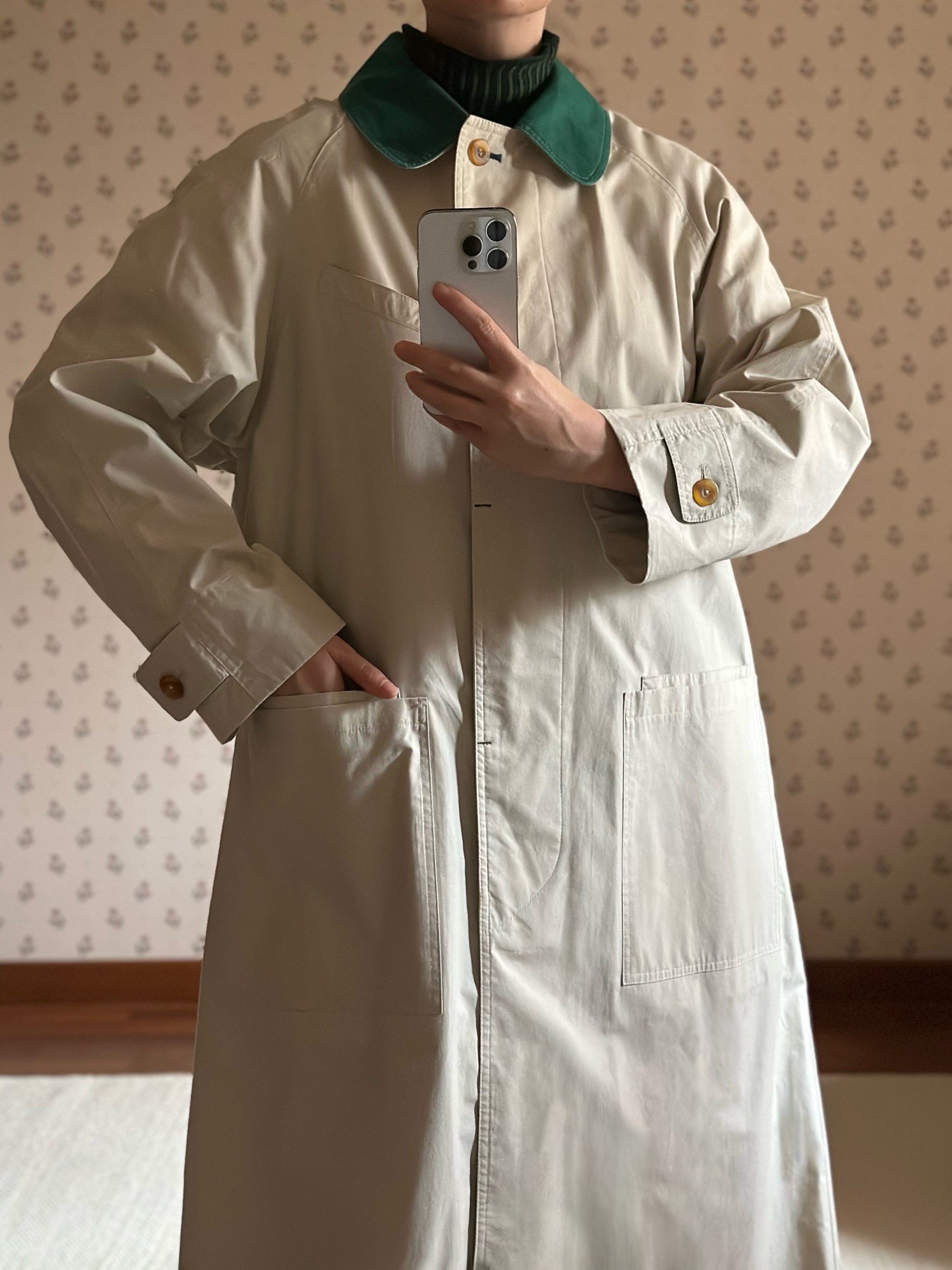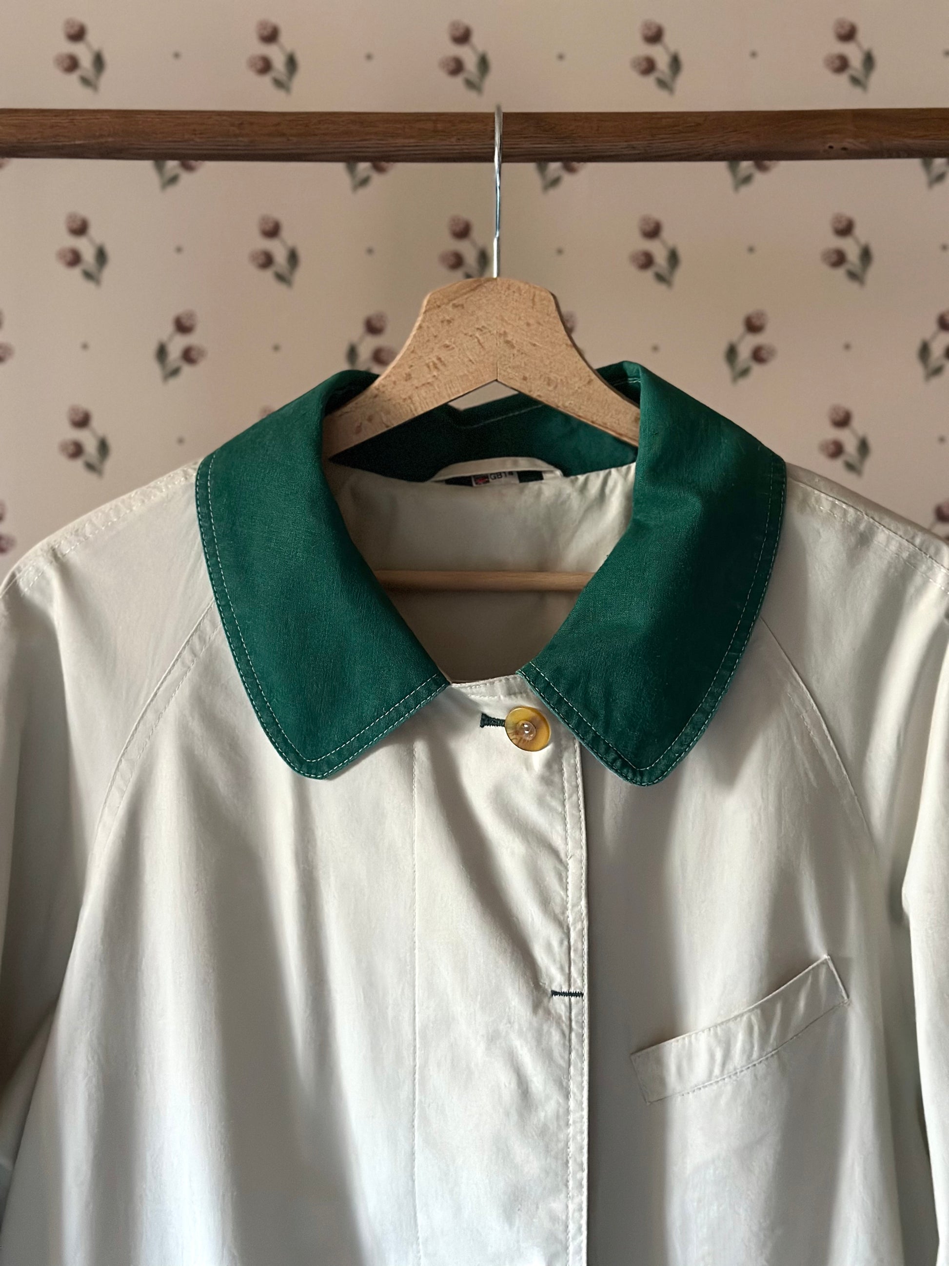 Unique and beautiful vintage trench coat featuring a timeless light beige shade, round green contrast collar, raglan sleeves and a flowing silhouette. Please note that the coat is in perfect conditions and has been recently altered by a seamstress to reduce the shoulder's width and make it suitable also for smaller sizes. Made in South Korea, possibly in the '80s.