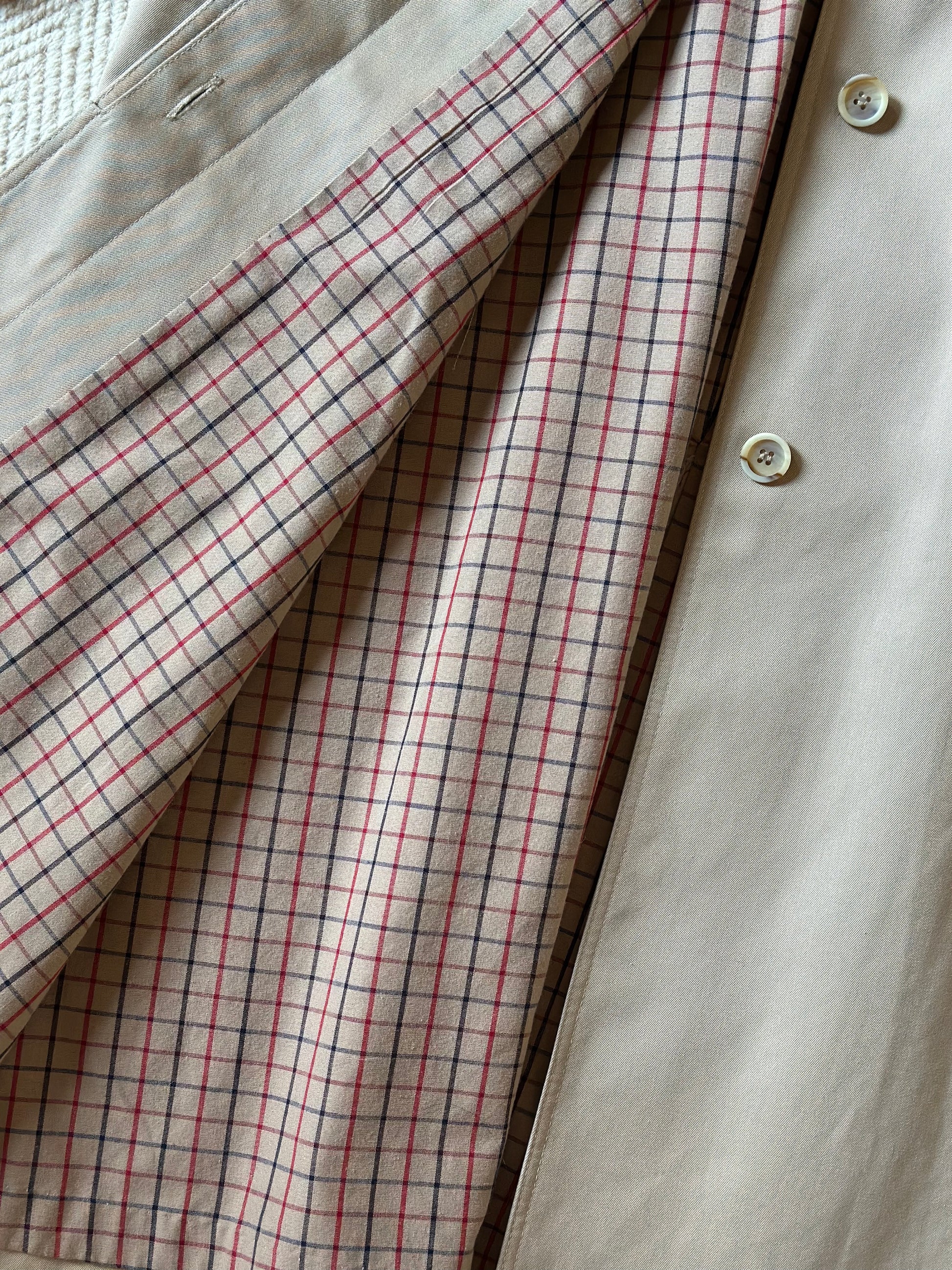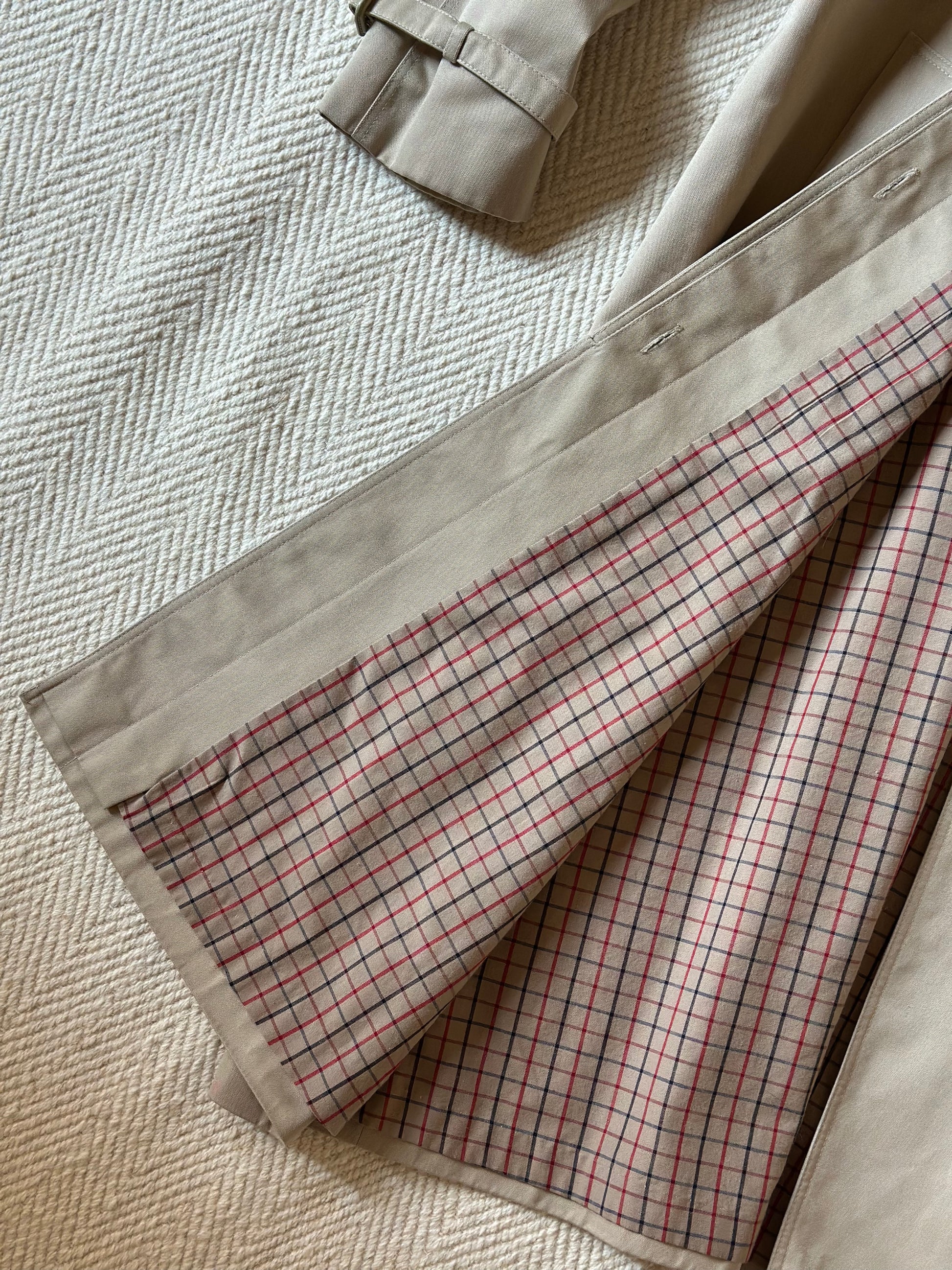 Classic and beautiful vintage trench coat featuring a timeless light beige shade, round collar, raglan sleeves and a stunning checkered lining. The trench coat is also embellished with little adjustable buckles on the sleeves and neckline and has no belt. Please note that the coat is in perfect conditions except for two small, hardly visible mark on the front (see last two pictures). Made in Korea.