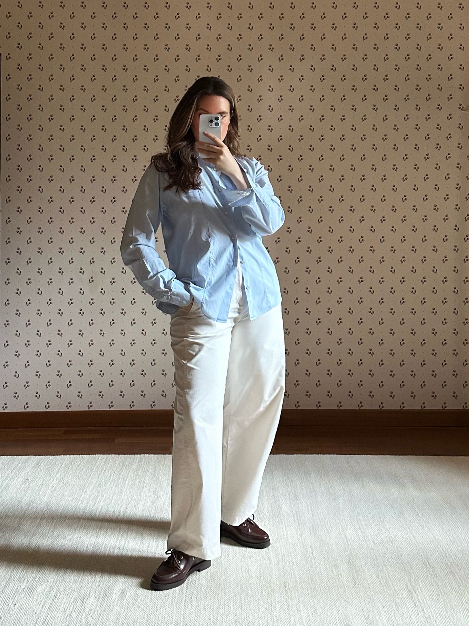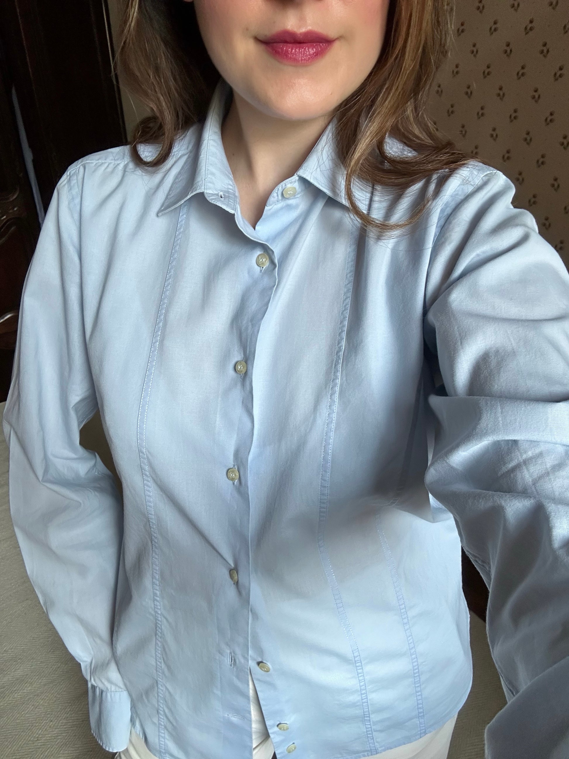 Lovely and classy vintage light blue shirt flat standing collar, front button fastening, long sleeves and a beautifully structured fit.