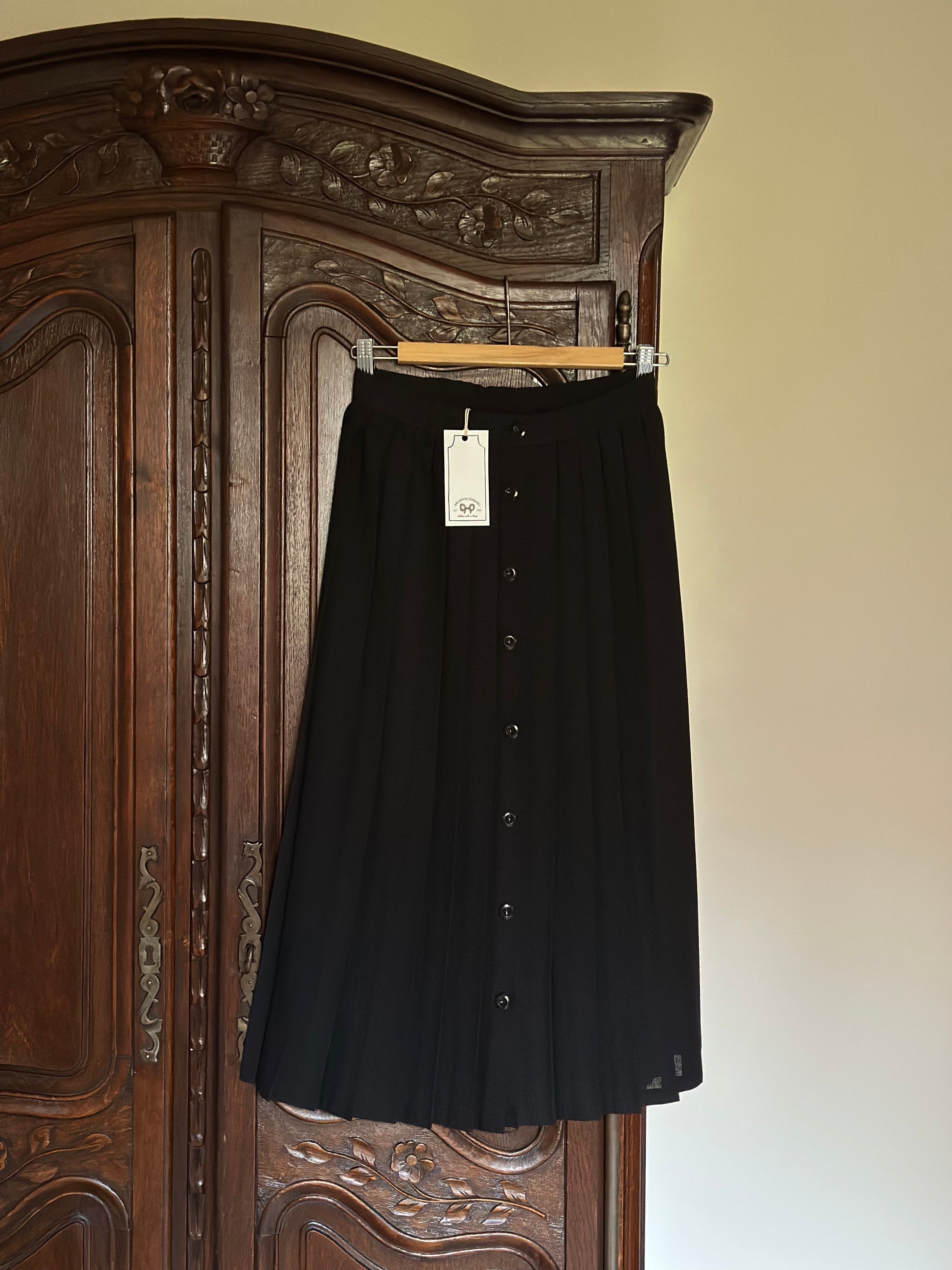 Beautiful and romantic blue pleated skirt fashioned from a lightweight wool blend and featuring a practical front button fastening with ton sur ton buttons. Please note that the skirt originally has an elasticated band sewn inside the waistline but has been decided to remove it as it was broken and not working properly. The skirt has been therefore repaired by a professional seamstress.