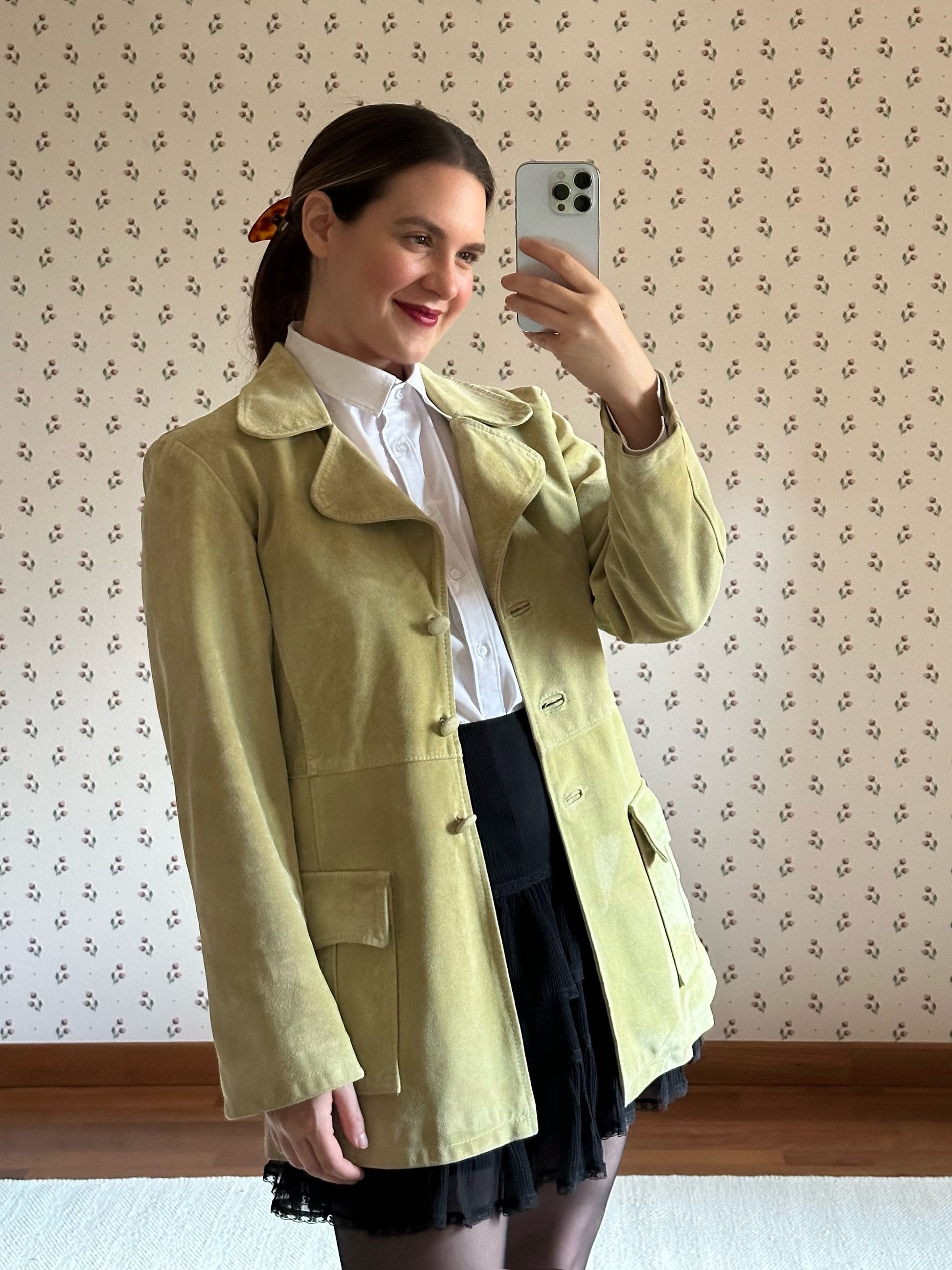 Uniquely beautiful real suede pistachio green jacket featuring long sleeves, lapel collar, front button fastening with covered buttons and a structured fit. The jacket is fully lined for a comfortable and easy wear and presents two large front pockets. A truly rare piece to give your seasonal suede jacket a twist and a pop of delicate color. Please note that this vintage piece has been cleaned and restored by a professional leather specialist: this has been taken into consideration while setting the final price.