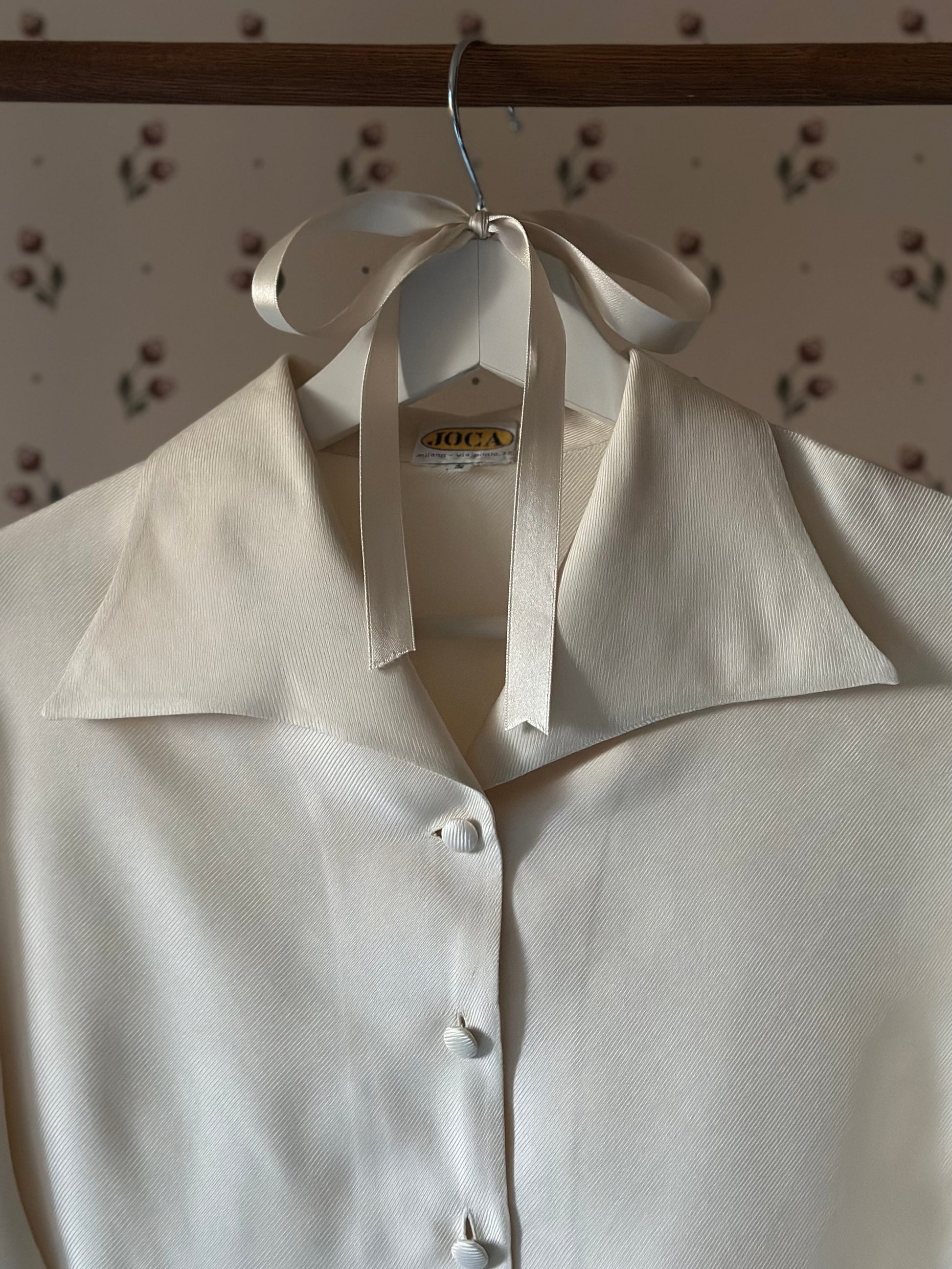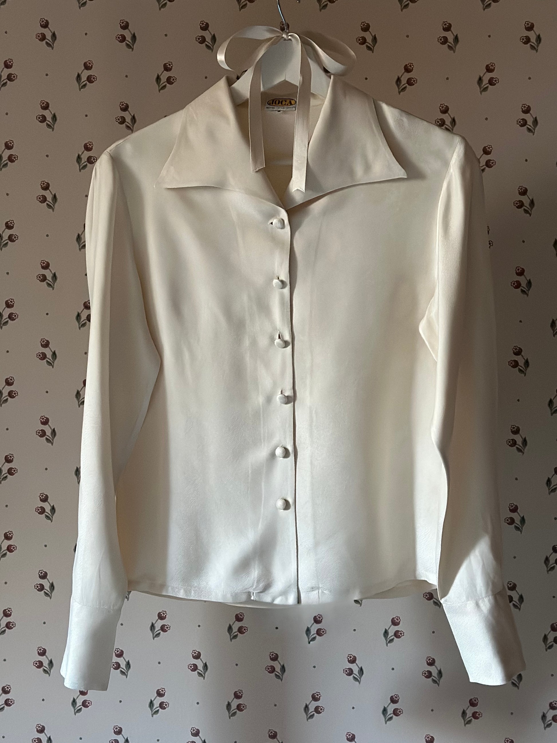 Lovely and classy vintage silk ivory shirt featuring flat collar, front button fastening, long sleeves and a beautifully structured fit. Made in Italy in a historical sartorial lab in Via Plinio, Milan.