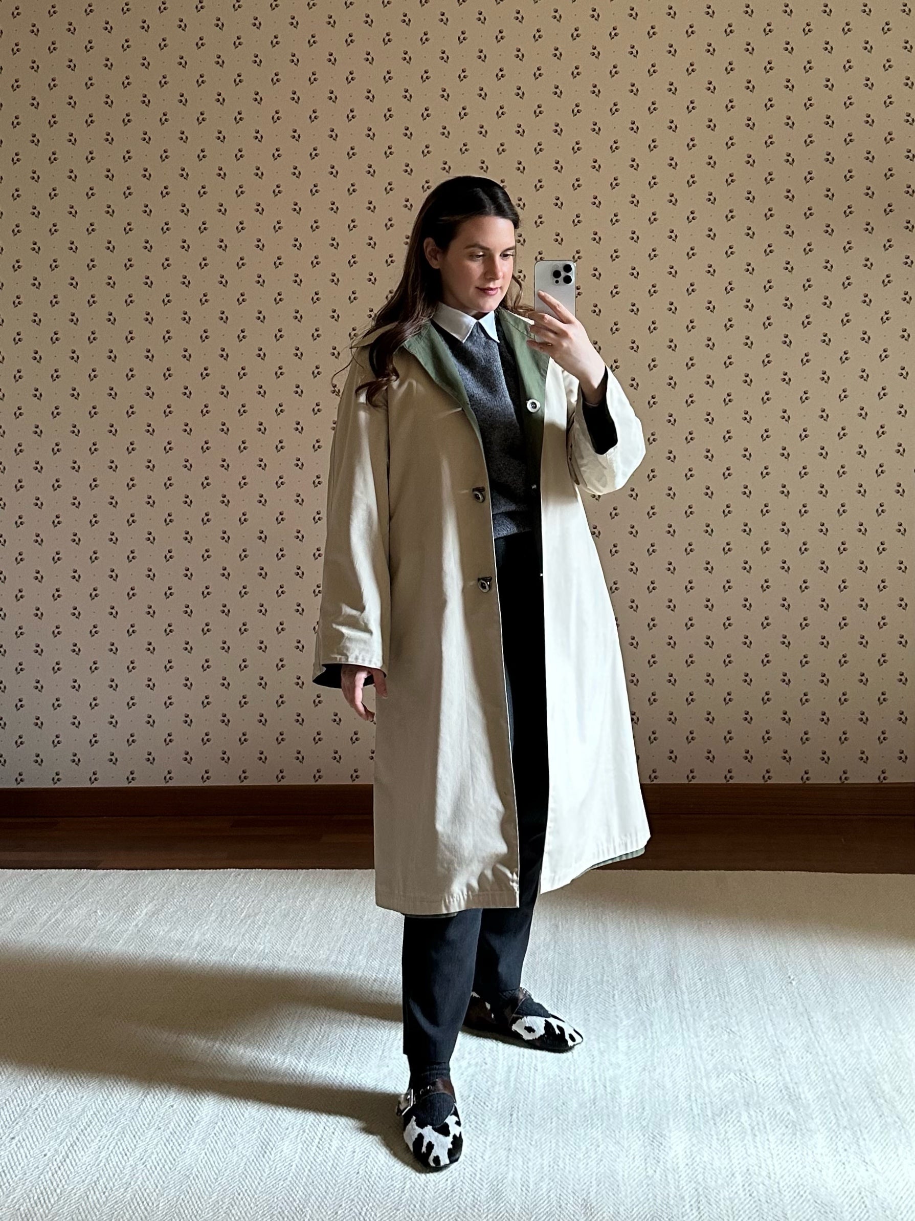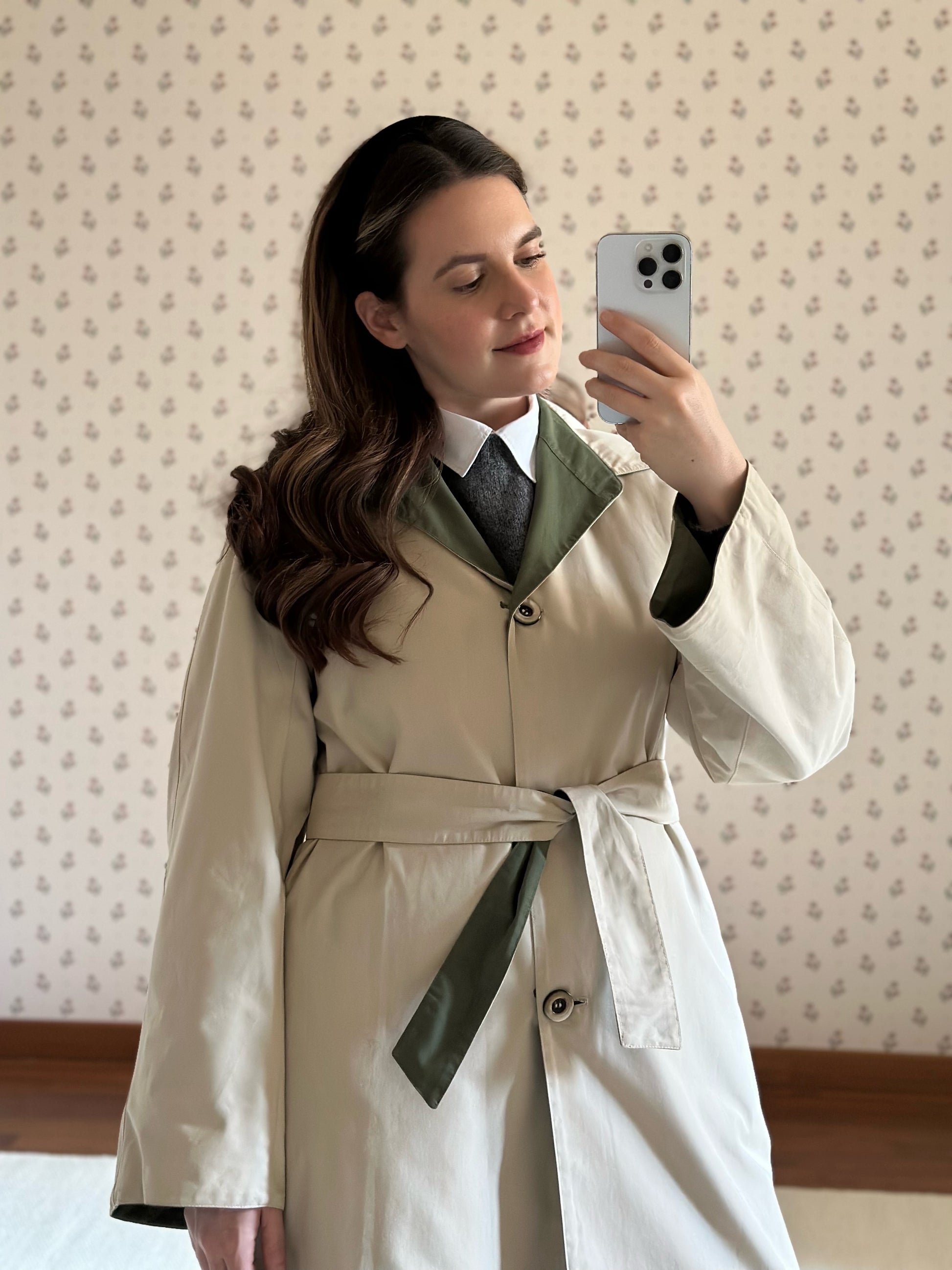 Beautiful and unique reversible vintage trench coat featuring a light beige and and an olive green side, both functional and provided with buttons. The trench coat features a romantic flat collar, a belt and a lovely structured yet flowing silhouette. Please note that the trench coat is in perfect conditions, except for a tiny mark near the collar, on the beige side (see last two pictures).