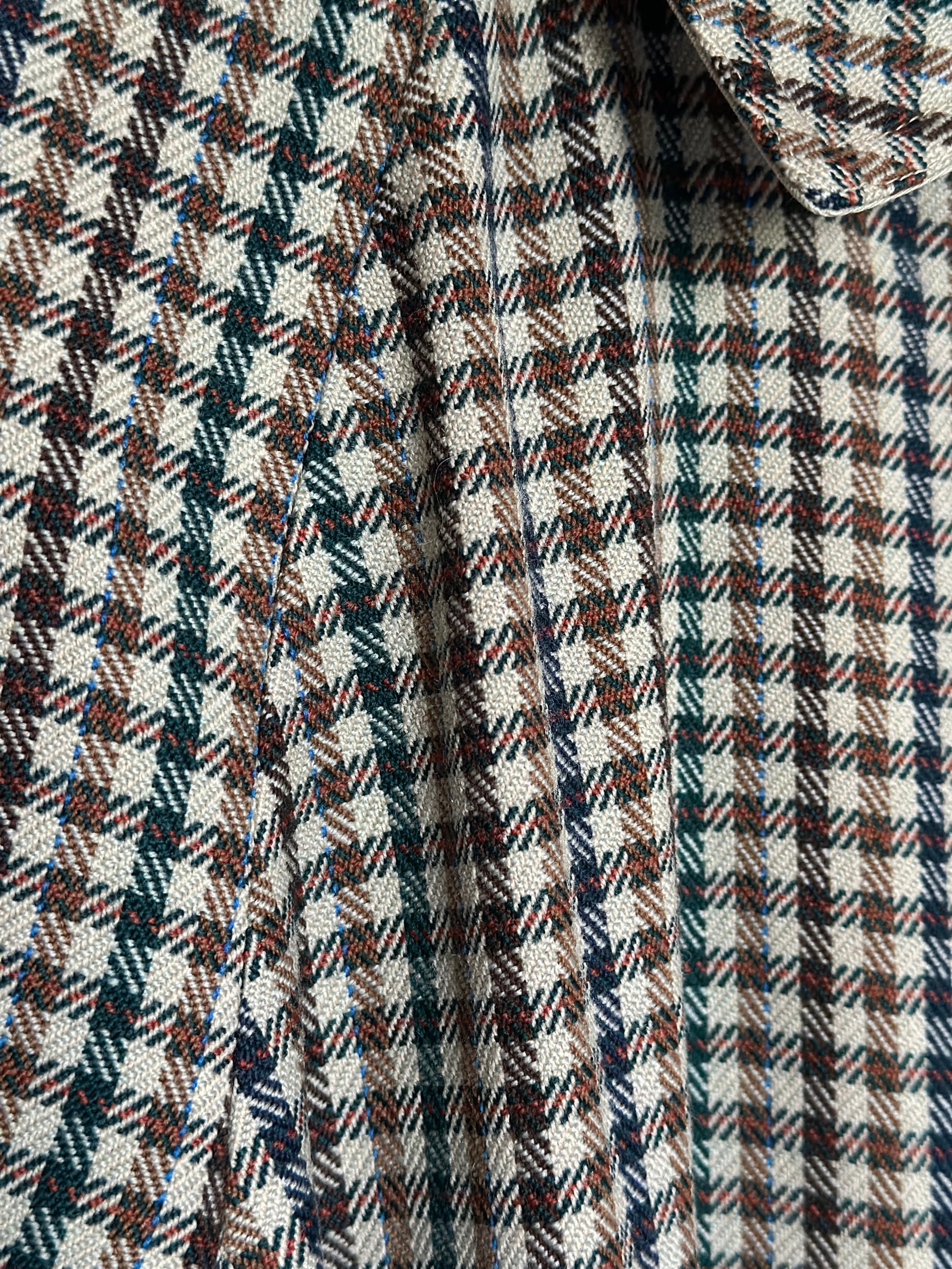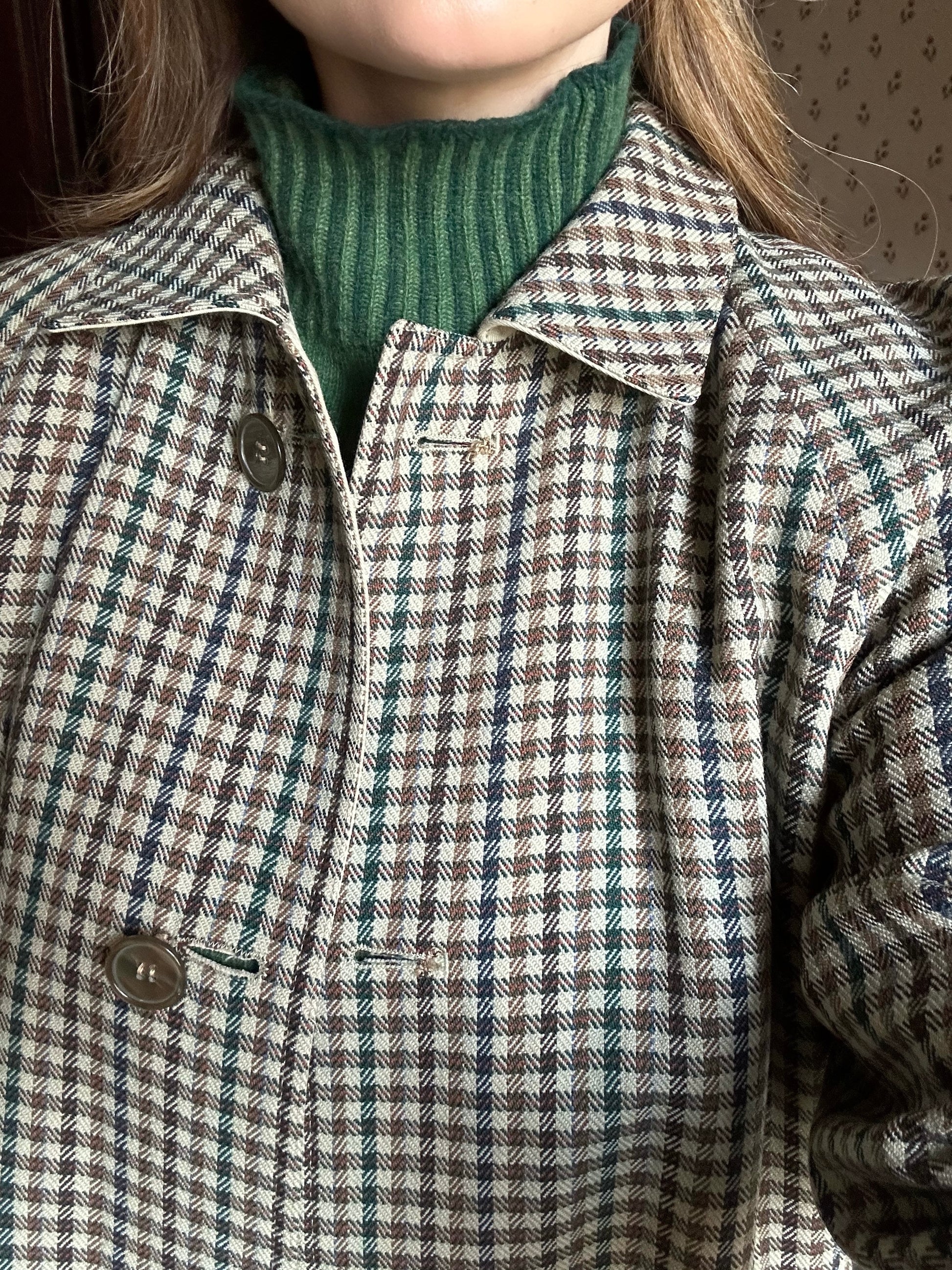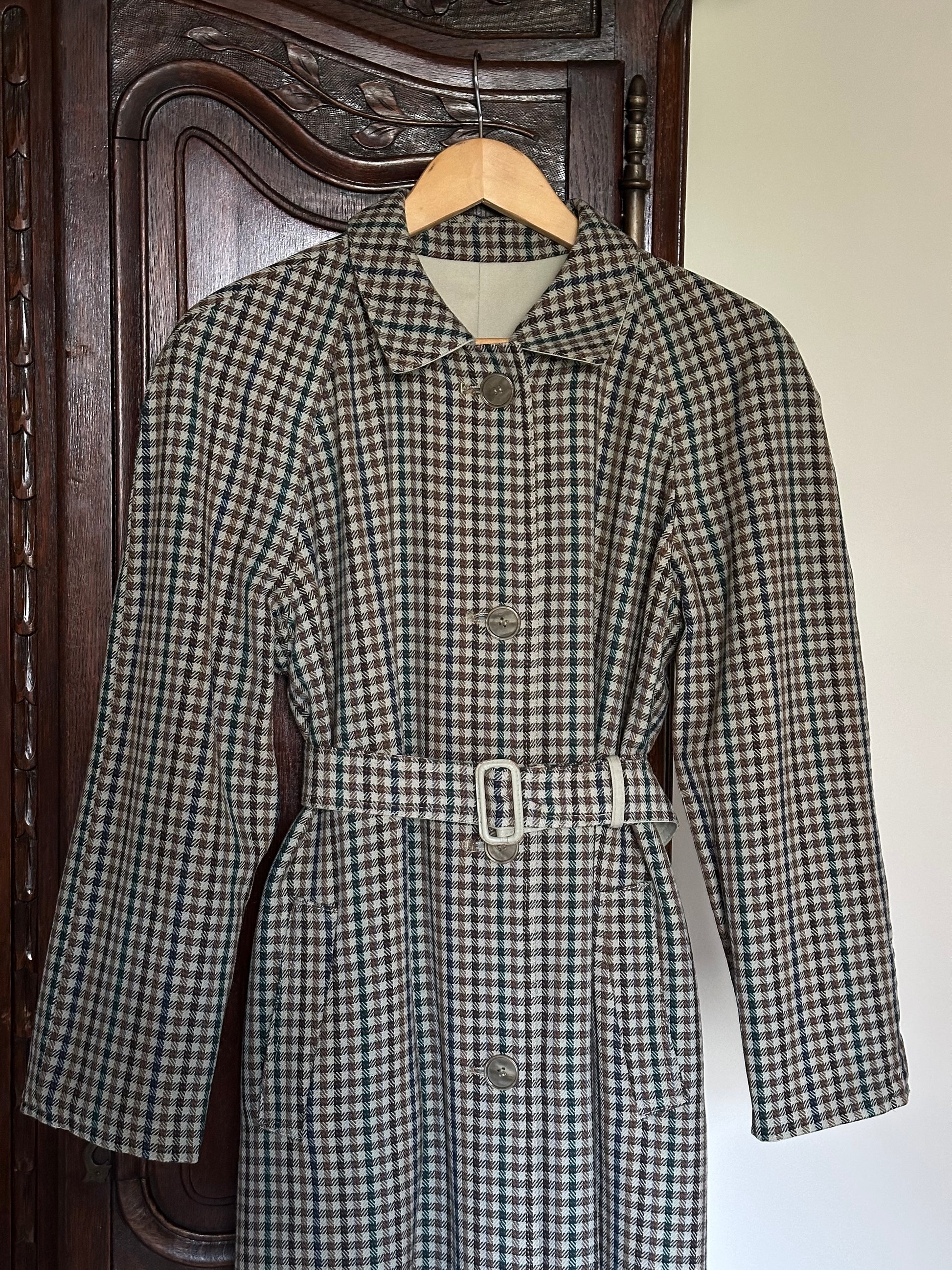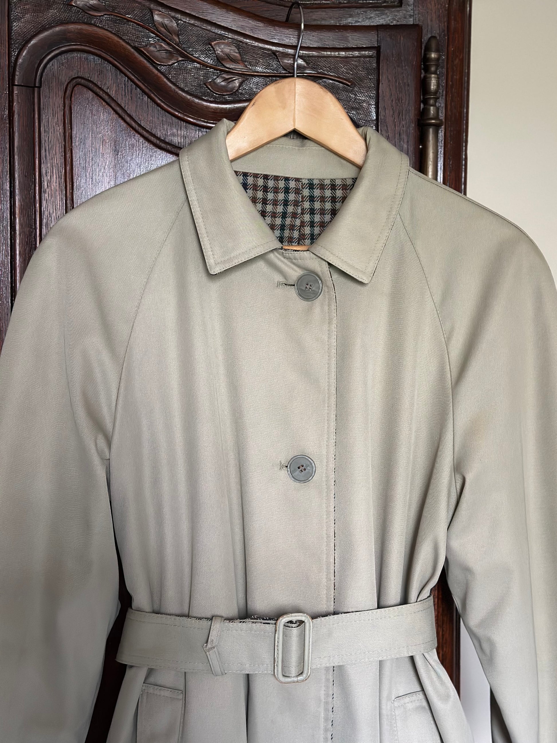 Classic and beautiful vintage reversible trench coat featuring a timeless light beige shade on one side and a gorgeous green, brown and blue check pattern on the other. The coat features a round collar, raglan sleeves and can be fully buttoned up on both sides.. The trench coat is also embellished with a practical belt and belt loops. Please note that the coat doesn't have padded shoulders.