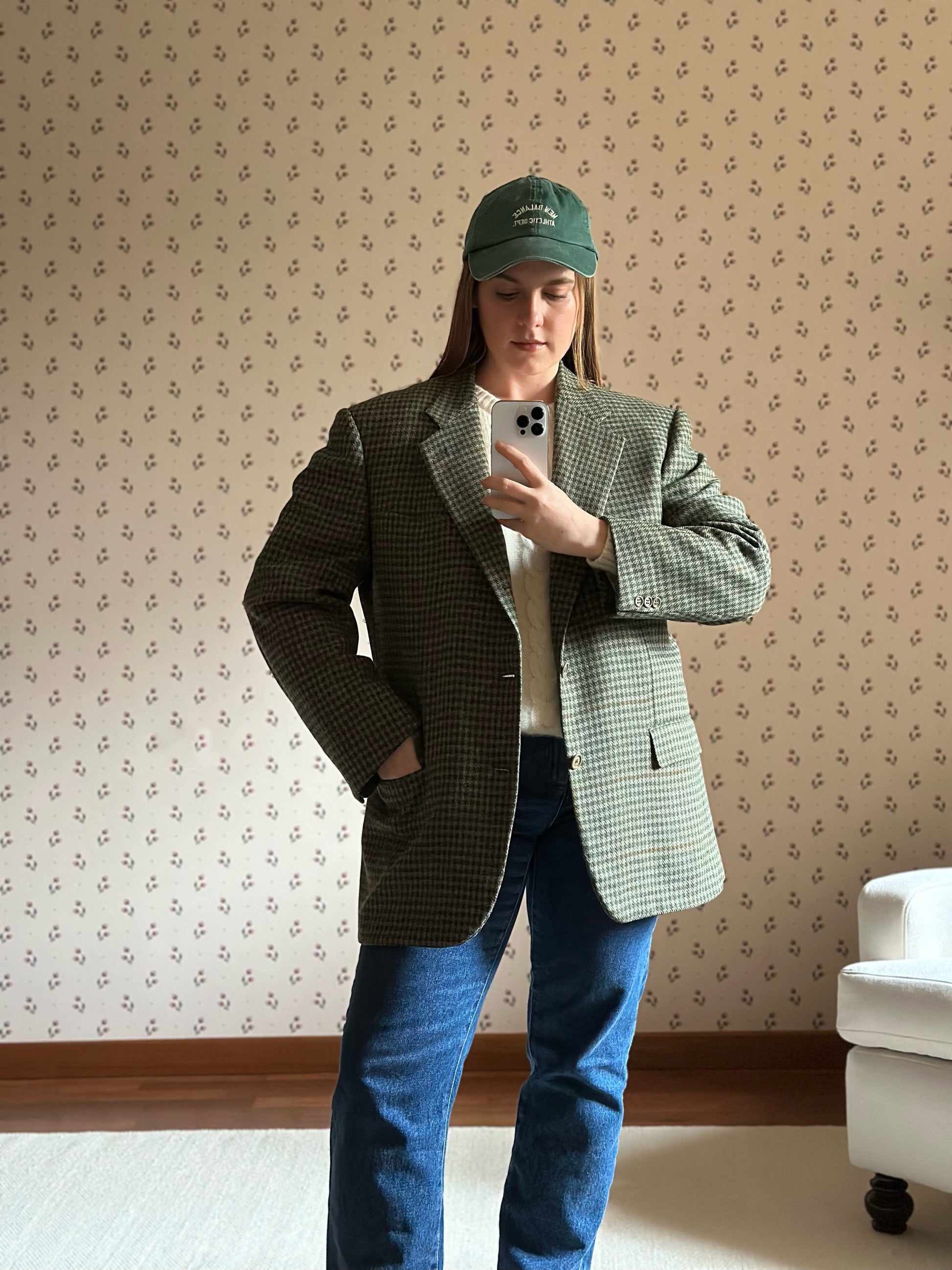 Timeless and romantic oversize woolen blazer fashioned from a classic and elegant pied de poule pattern. The blazer features long sleeves, a beautiful lapel collar, front fastening and a beautiful brown, green and taupe color pattern. Fully lined for a comfortable and easy wear.