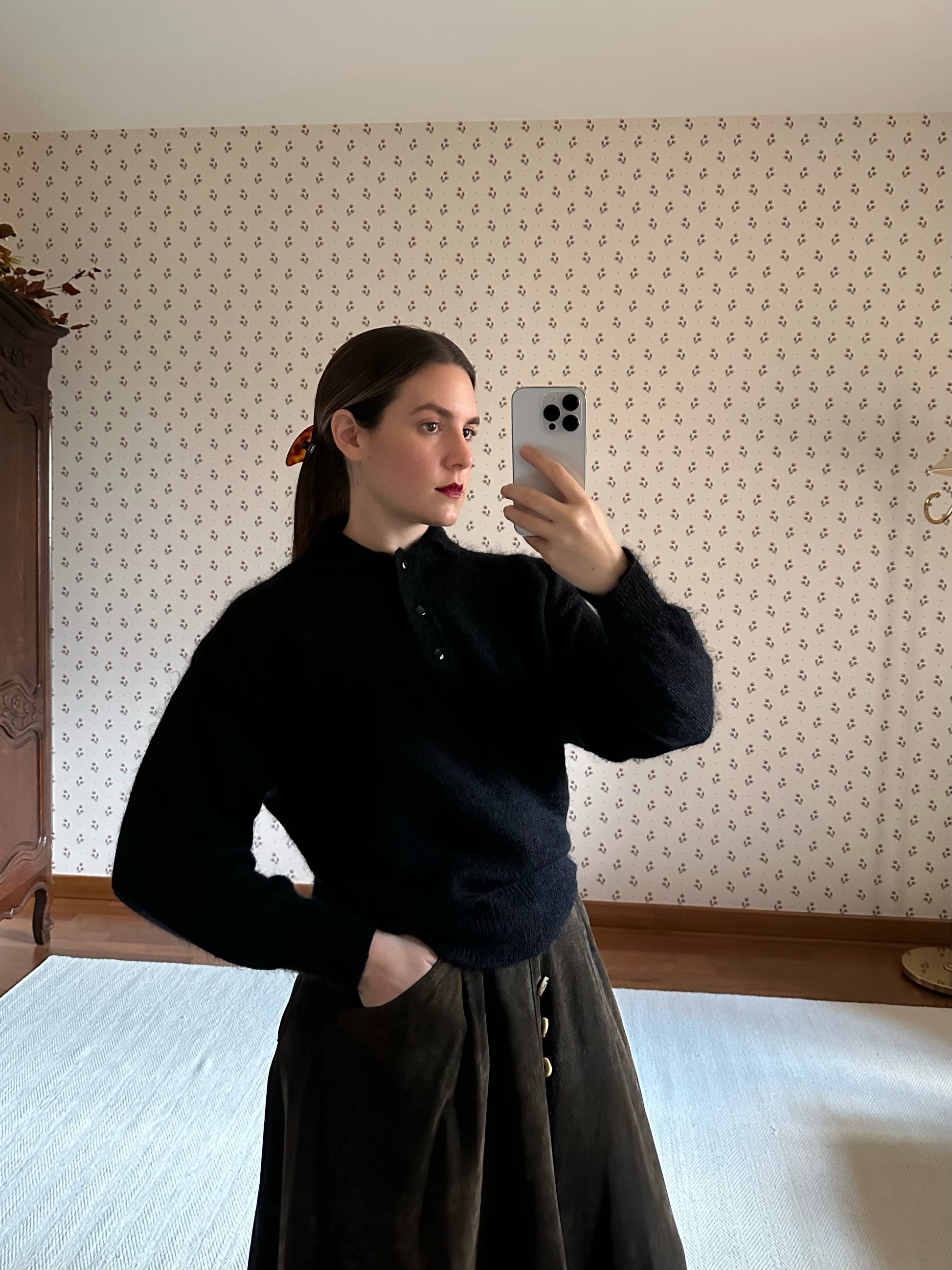 Gorgeous and versatile black polo sweater fashioned from a super soft blend of super kid mohair and wool featuring long sleeves, buttoned up collar and a relaxed, comfy fit.
